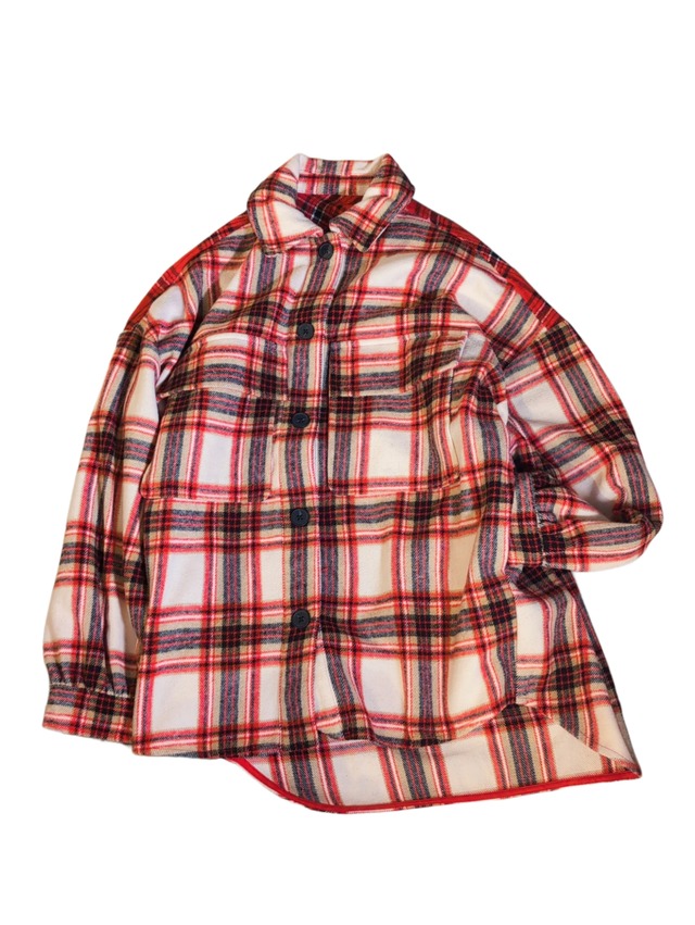 シャツジャケットです。 色味は、アイボリー×レッド×ベージュ×ブラック。 秋の定番、タータンチェック。ガバッと羽織れる大きなサイズ感と重くなりすぎないカラーリング、背面がワンポイントで違ったテキスタイルを使っているのも◎ 肘付近に入ったタックで立体感のあるフォルムがさりげなく演出されているのもよし。中にパーカー、ハイゲージのニットなどを重ねてレイヤードも可能で長い季節で重宝します。 Size(平置き) 肩幅 65cm 身幅 62cm 袖丈 44cm 着丈 77.5cm