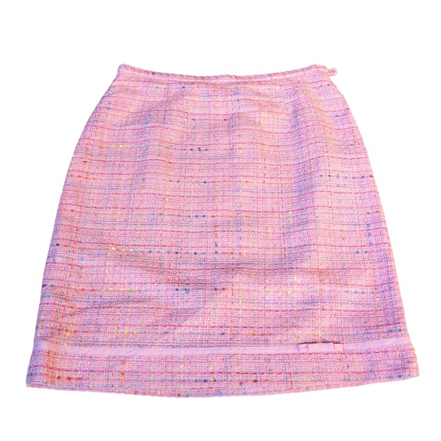 ツイードのスカートです。 ピンクのツイードが非常にラブリー♡ カラーのネップも最高にキュートです。 裾にはさりげなくリボン、裏地もついていてばっちし。 ブラウスなどでカチッと華やかにも、スウェットなどに投入しても、ニットなどに合わせて甘々な雰囲気できるのとかわいいです♡ Size(平置き) ウエスト 37cm 総丈 53.5cm