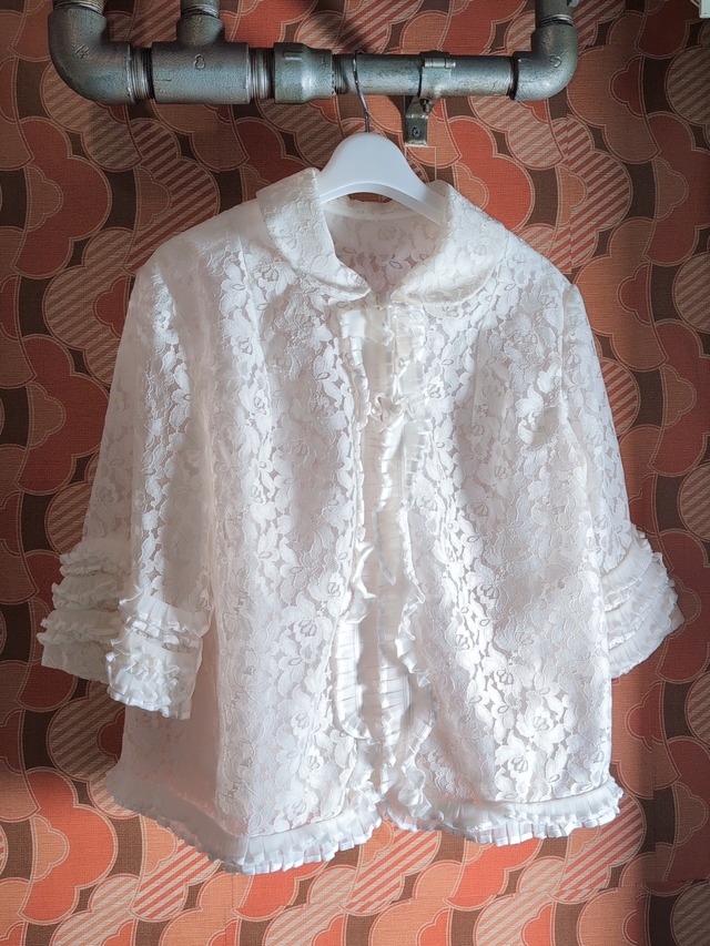レースのジャケットです。 色味は、ホワイト。繊細なレース×プリプリのアウトラインがとってもかわいい一着。カチッと上品ながらも丸みのある襟で柔らかい雰囲気があるのも◎ 春夏にキャミソールを合わせた組み合わせはもちろん素敵ですが、この時期にだすのはニットやベロアのトップスと合わせてほしいからという思惑でし。 レザー、ウール、ベロア、ニット、重くなるアイテムにレイヤードして軽やかさと奥行きをプラスしながらコーディネートをぜひ楽しんでみてください( ◜‿◝ )♡ Size(平置き) 肩幅 50.5cm 身幅 56.5cm 袖丈 29cm 着丈 49.5cm