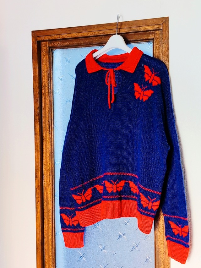 ニットです。 色味は、ブルー×レッド。 写真よりも少しネイビーに近いブルーです。襟元のデザインとリボンがかわいらしいです。蝶々の編みがレトロな雰囲気。 チェックスカートなどで合わせても、ナイロンパンツなどで外してきても可愛いです。 Size(平置き) 裄丈 85cm 身幅 57cm 着丈 59cm