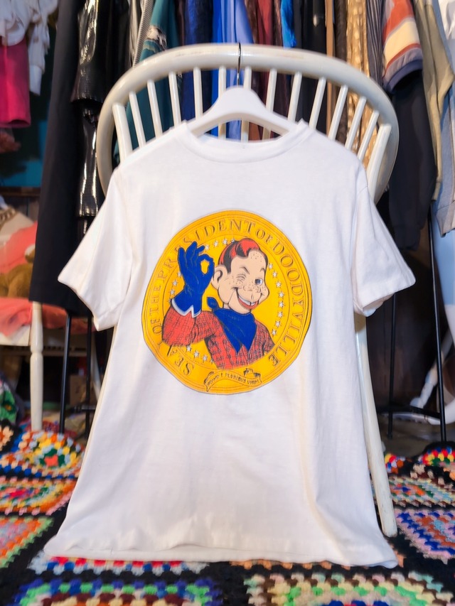 80年代、ハウディードゥーディーのTシャツです。 色味は、ホワイト×イエロー×ブルー×レッド×ブラック。アメリカの子供向け番組にて登場していた腹話術人形のキャラクター、Howdy Doodyのプリント。陽気でご機嫌な表情が◎ シングルステッチ、コットン100。この年代ならではの厚すぎない柔らかい素材感が最高。ゆえに意外としっかりめの着丈ですが厚ぼったくなりすぎないのもポイント高しです。 Size(平置き) 肩幅 40cm 身幅 46.5cm 袖丈 17.5cm 着丈 60.3cm Conditions シミのある箇所がございます。 詳細は掲載写真にてご確認ください。