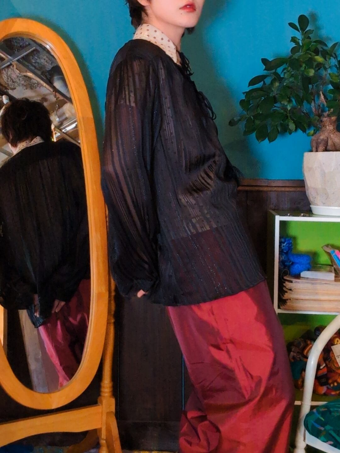 ハイネックニットやキャミソールをあわせれば、レディーな雰囲気に。今回は、ヴィンテージのレースアップシャツを合わせて首元をちょっとゴチャつかせてみました。