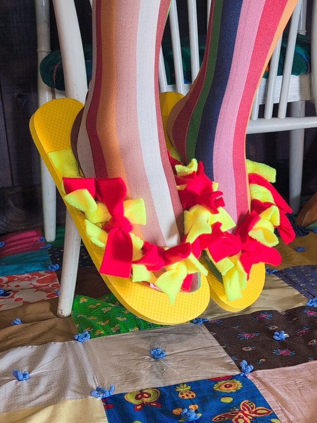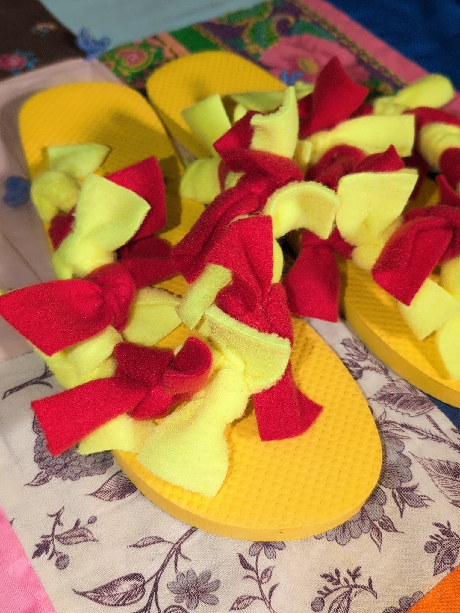 色味は、イエロー×レッド。たっぷりリボンのつけられたデザインが目を引く一足です。暖かくなった時期に突っかけてちょこっとそこまでが途端に可愛くなっちゃう。