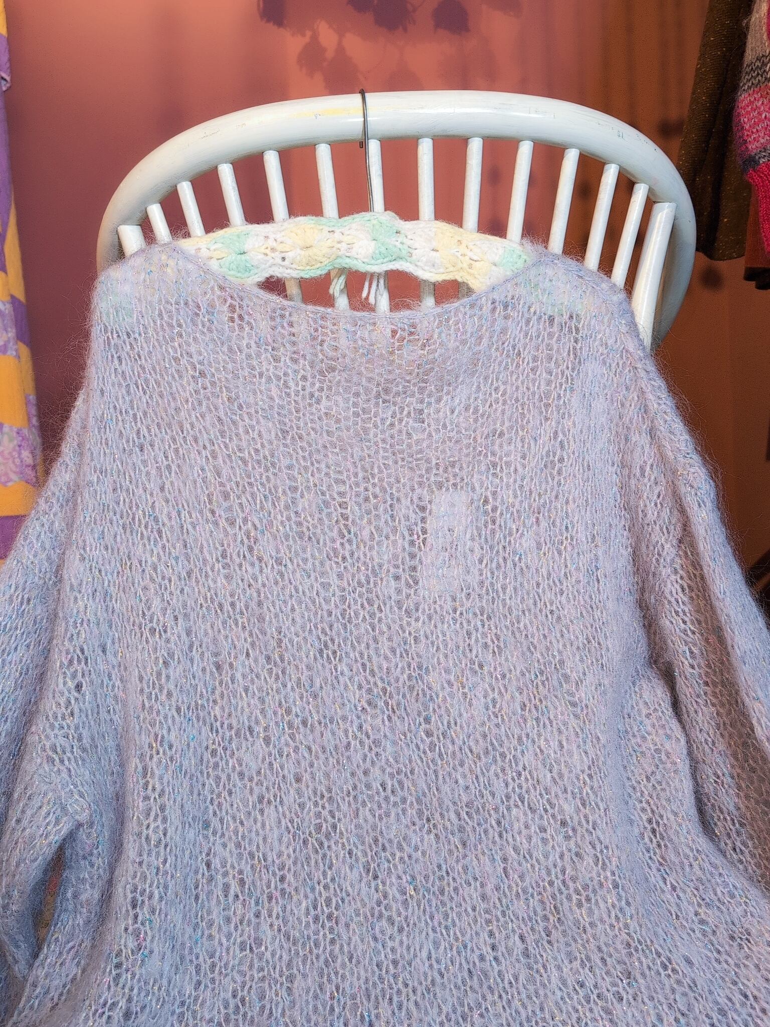 素材はおそらくアクリルモヘア。ゆるゆるとした透かし編みと、ポワンとしたお袖、ゆとりのある襟の空き、大きなサイズ感が素敵。何よりもキラキラとしたラメの糸が混ぜられているのが最高に可愛い!