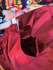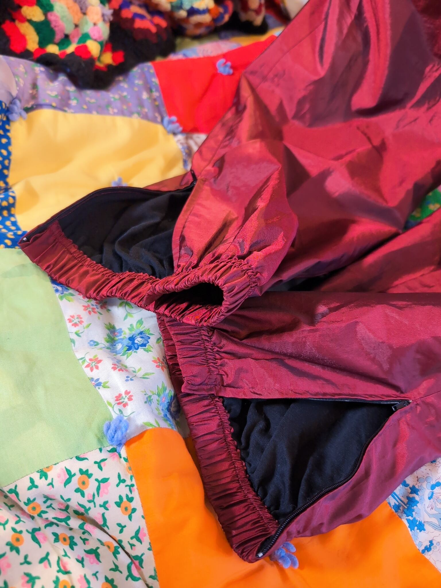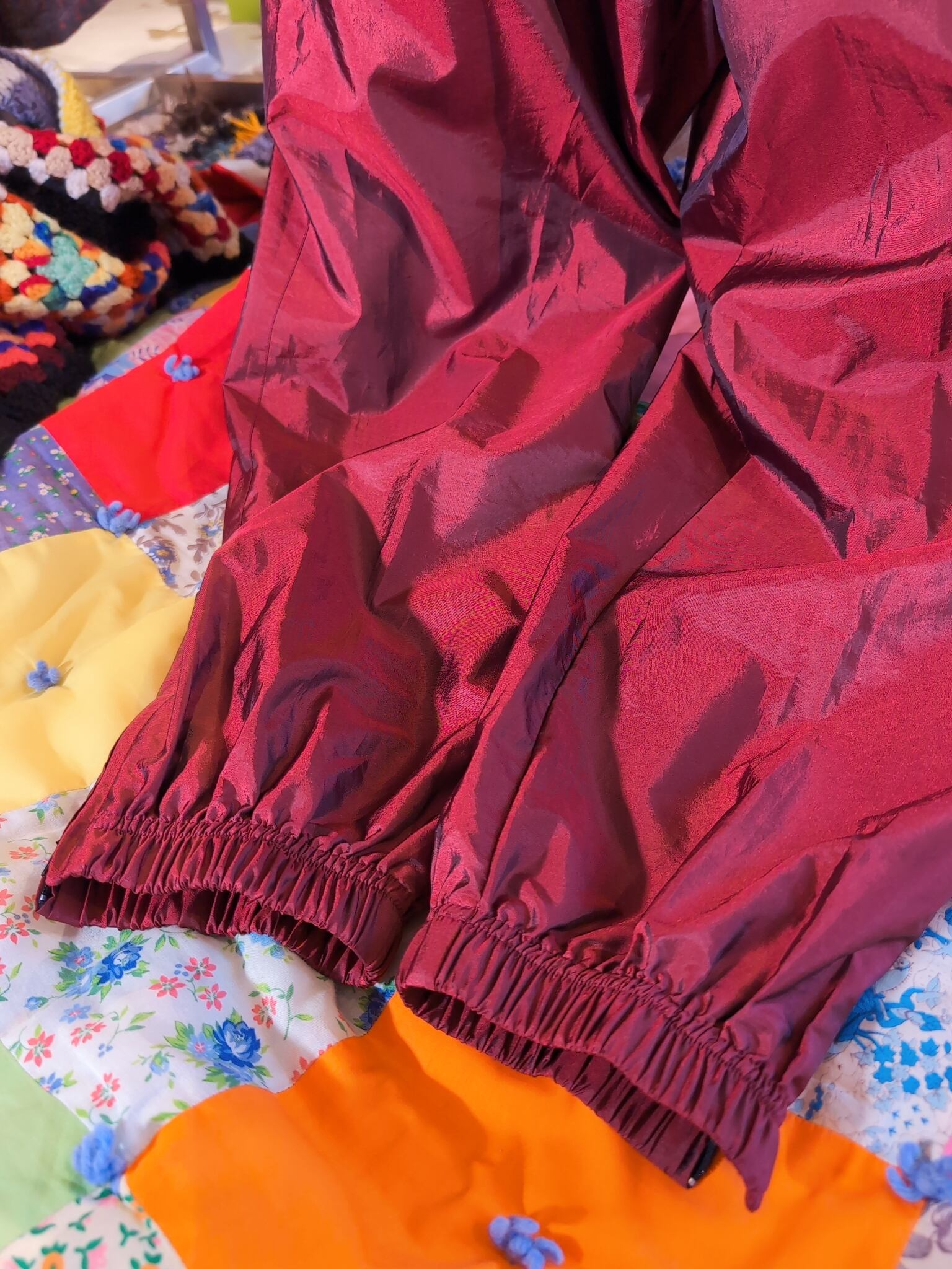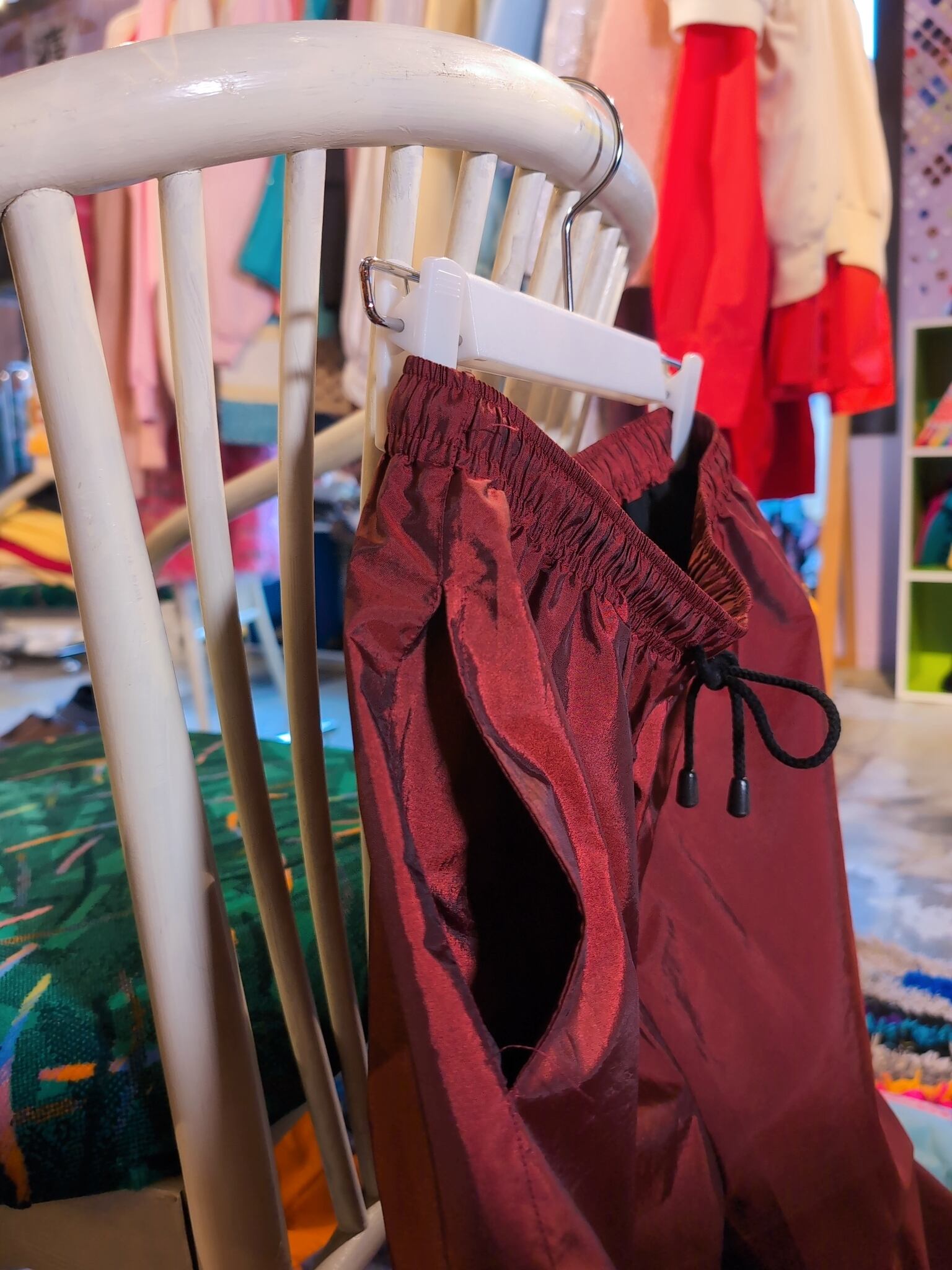 光沢のあるボルドーの玉虫色がシャリシャリしていてとってもカッコいい。イージーパンツでアクティブに着られます◎ですがウエスト部分にデザインが入っているのでラフすぎないのもおすすめポイントです。裾にはチャックでラインの調節が可能◎