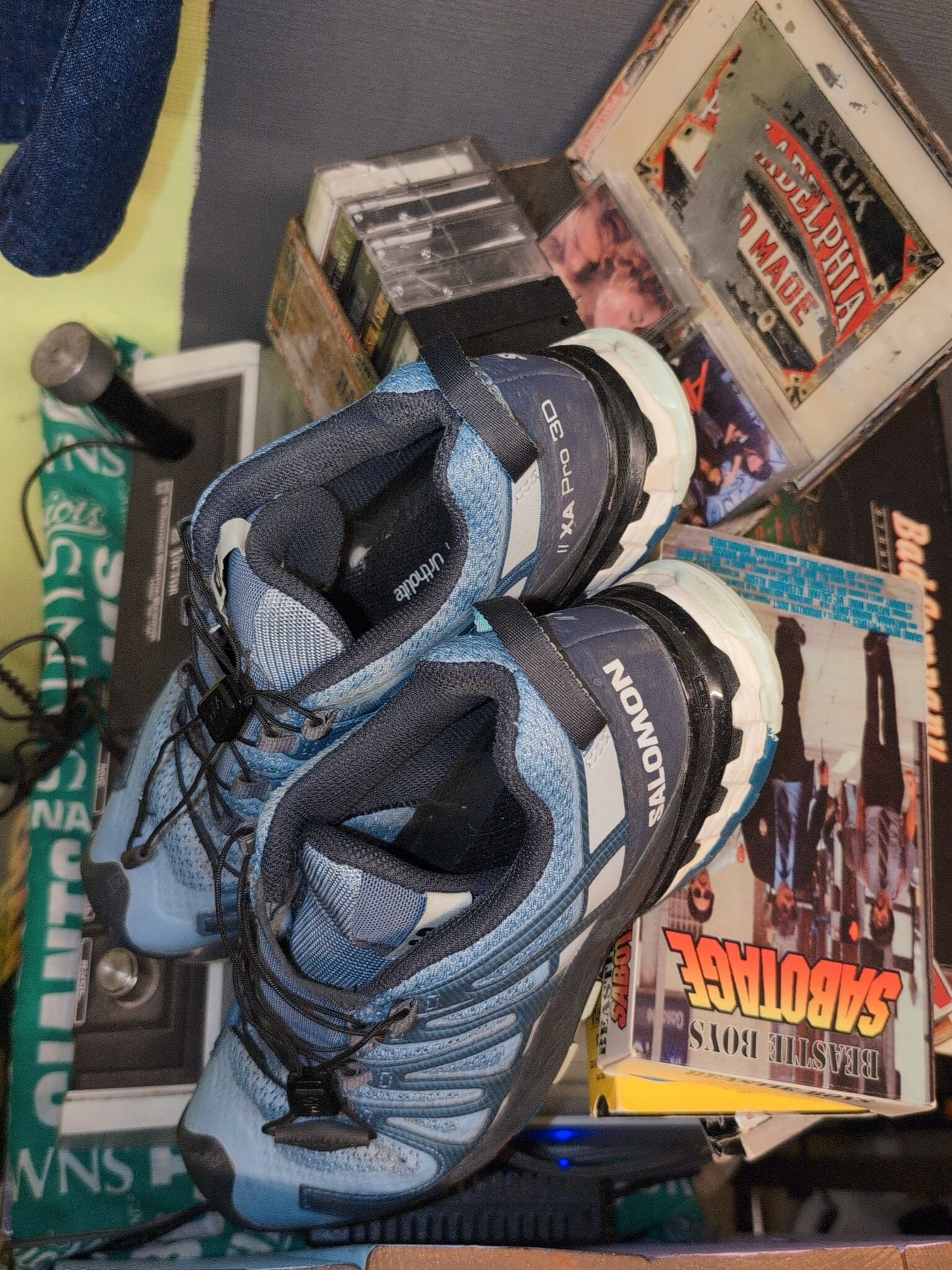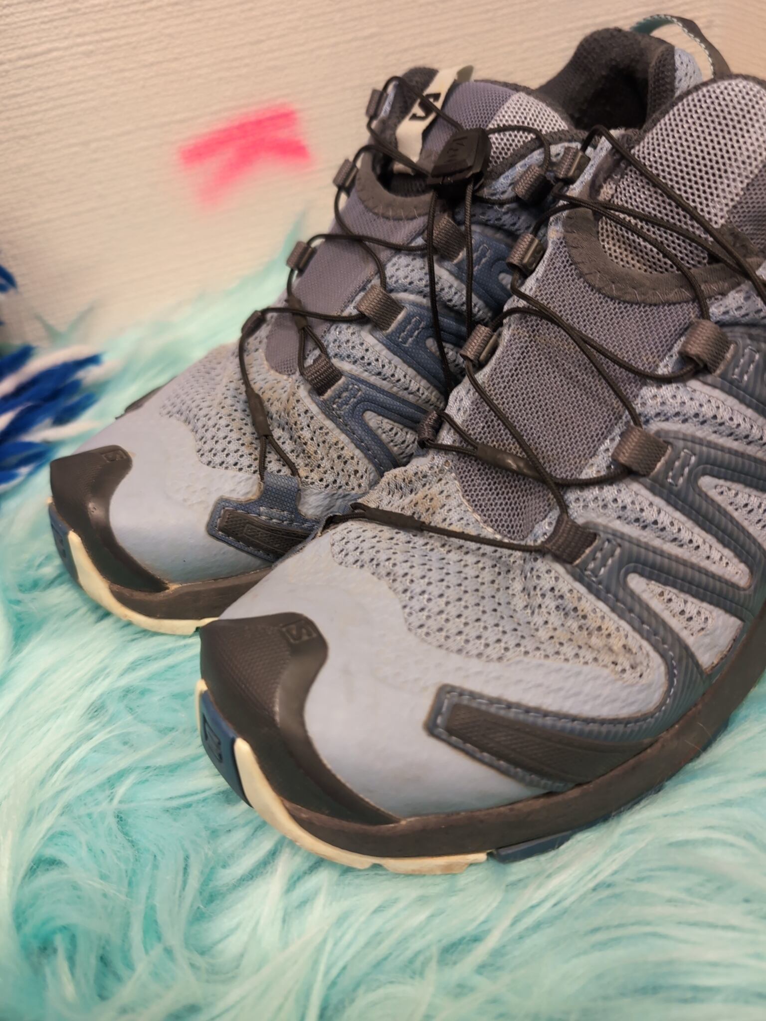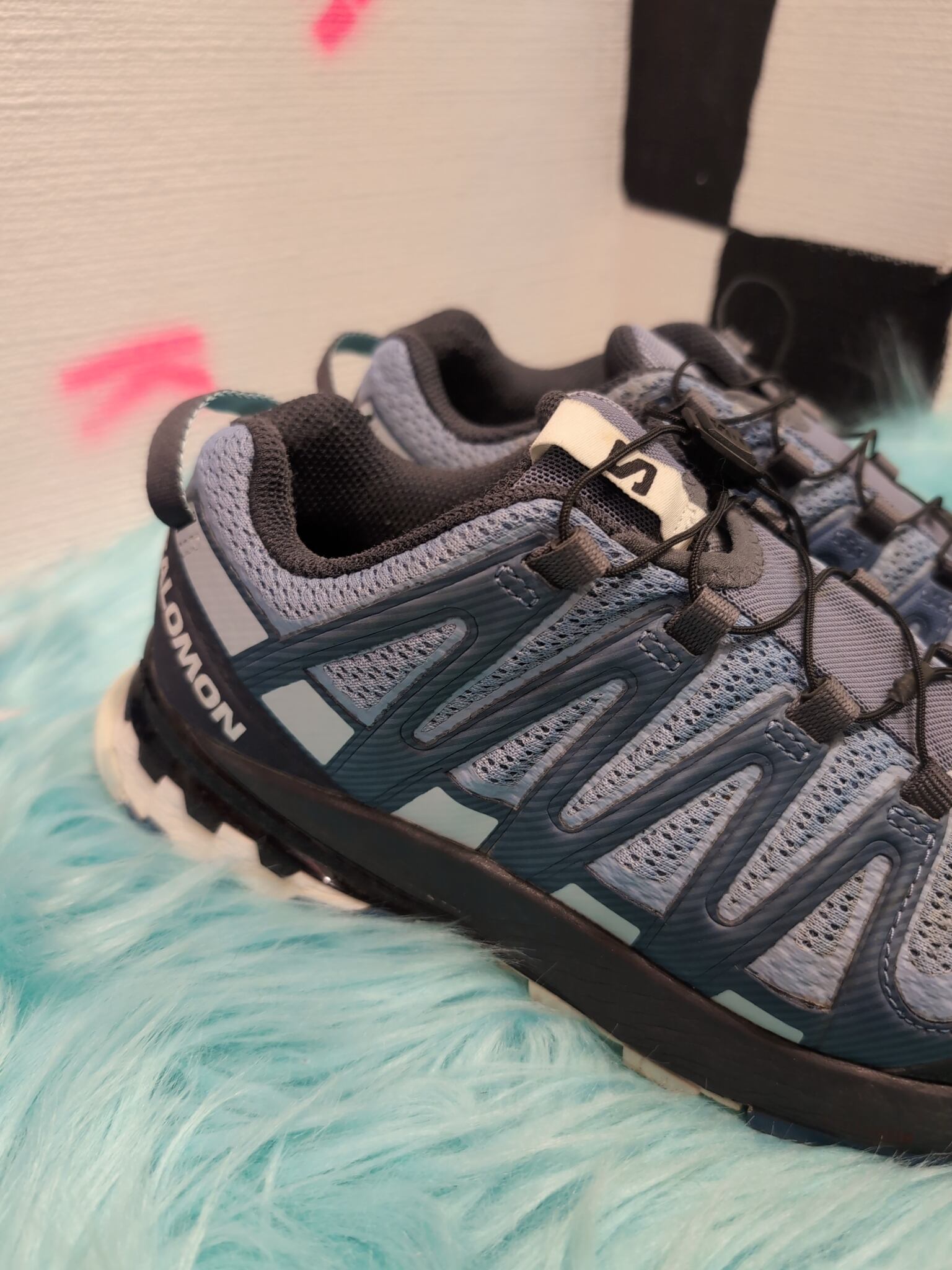 "SALOMON"のスニーカーです。履きやすく疲れにくいため個人的にもだーいすき。落ち着きのあるネイビー、明るいブルーと黒の配色が使いやすく、シミ等若干の着用感はあるもののまだまだご着用頂けます(◠ᴥ◕ʋ)