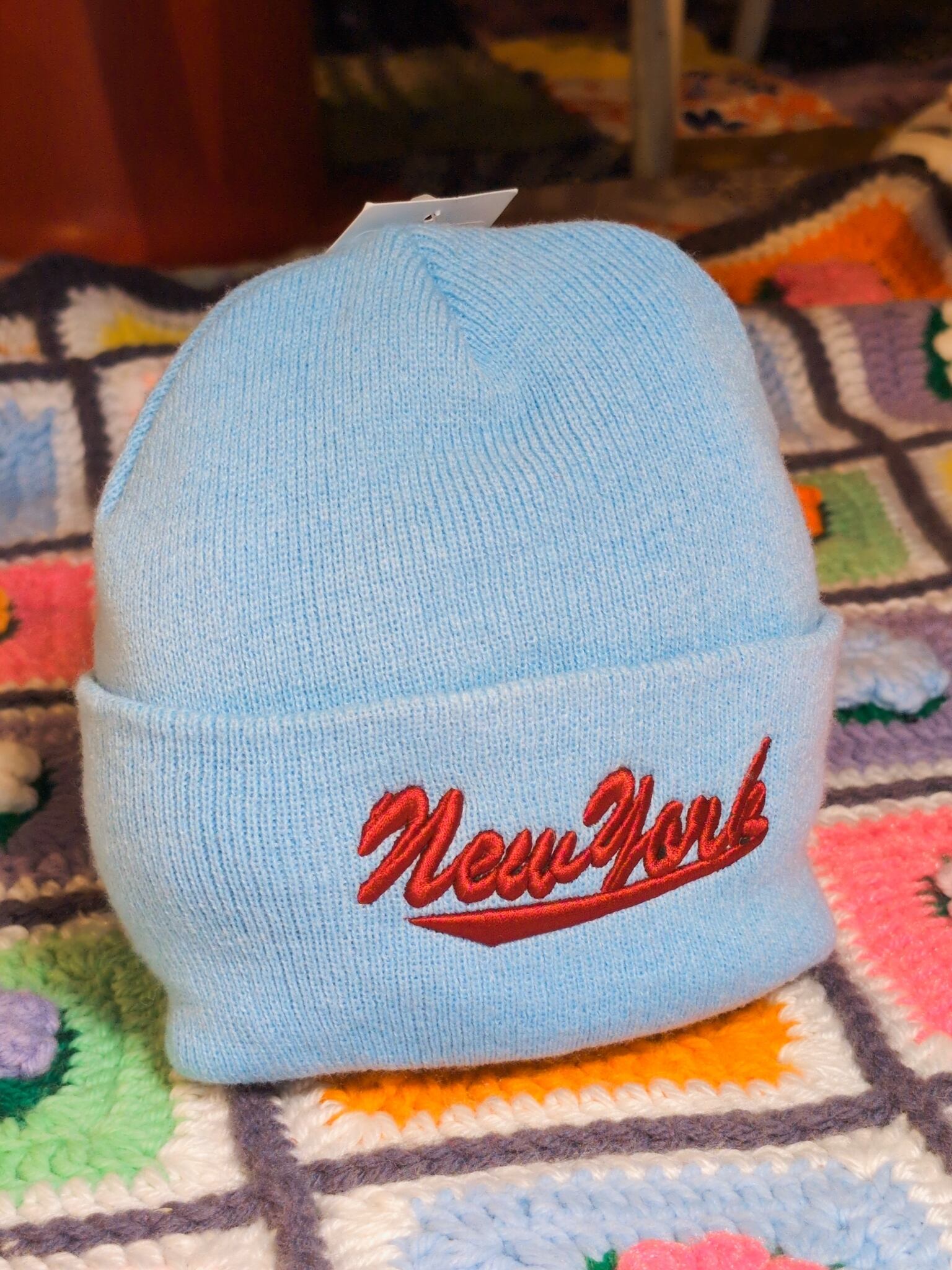 可愛らしいカラーリングの配色、密なもちっとしたニットの厚みが可愛らしい一点です。"New york"の刺繍も丸みのあるフォントで立体的◎