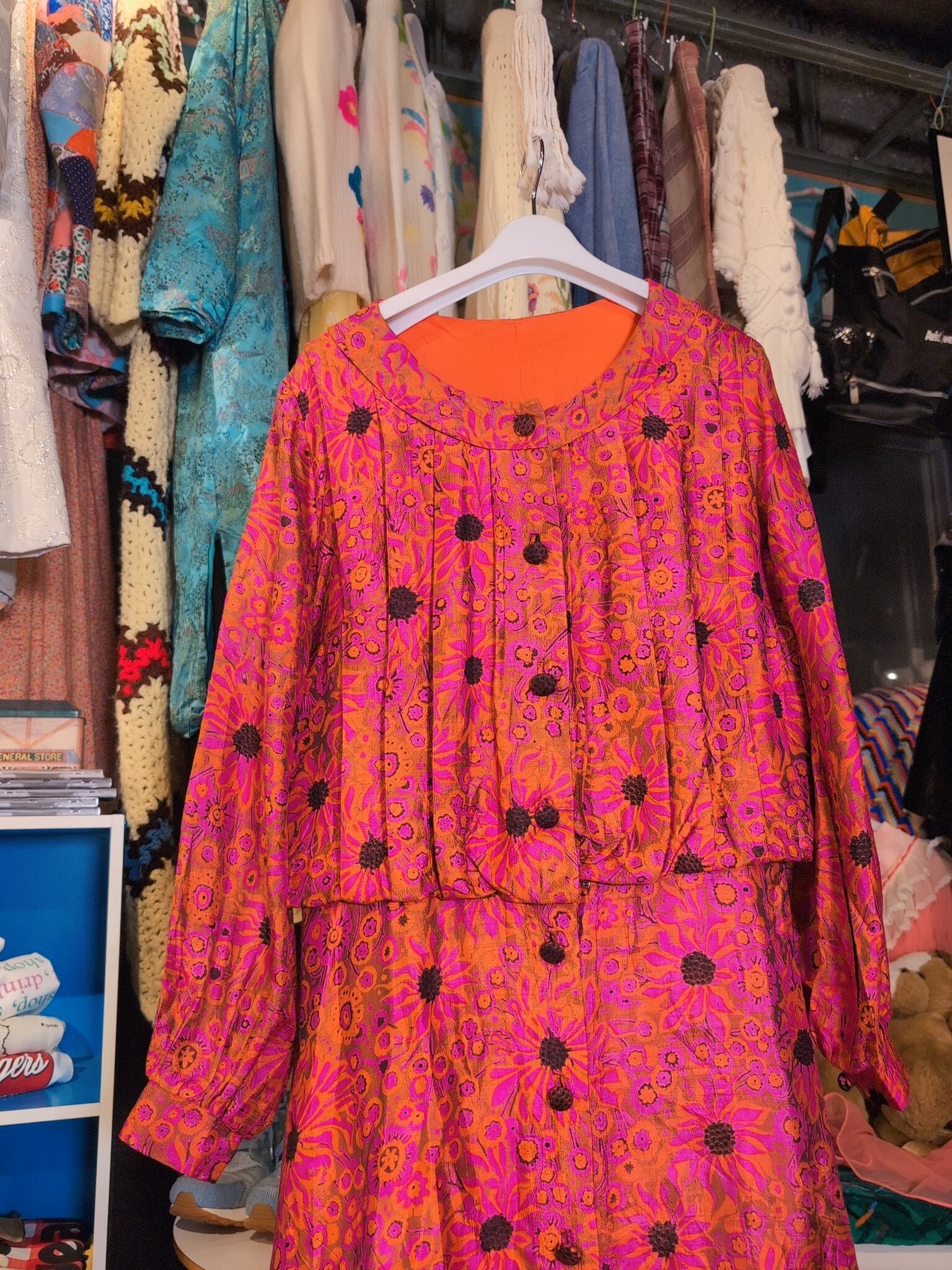 品質表示はございませんが、おそらくハリのあるシルクです。お花の総柄、ボタンはくるみボタンでしっかりこだわり抜かれているのも◎
