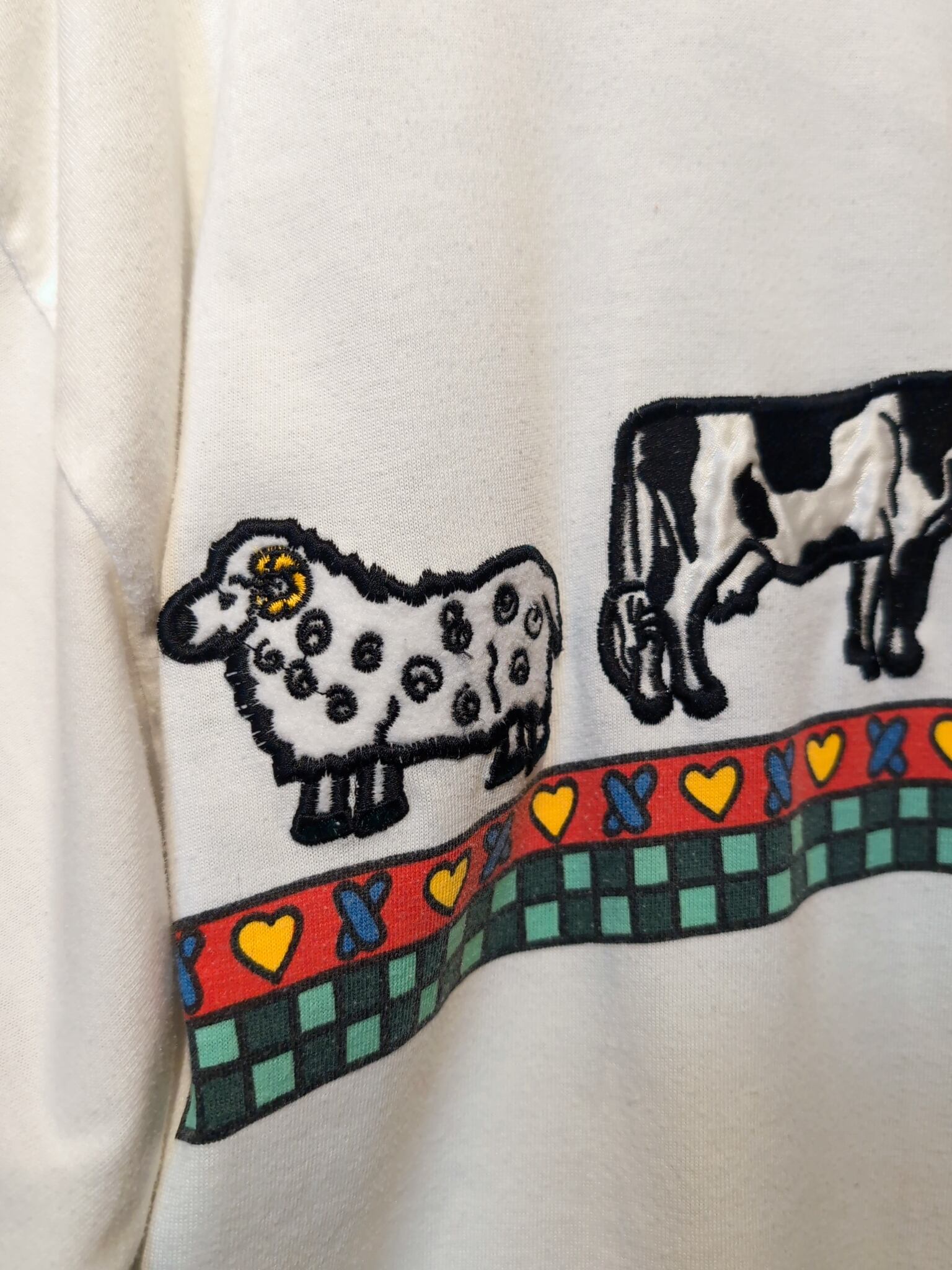 動物の刺繍がかわいい一着です。牛さんと鳥さんはツルツル素材、豚さんと羊さんはもこもこの素材なのも可愛いポイント◎
