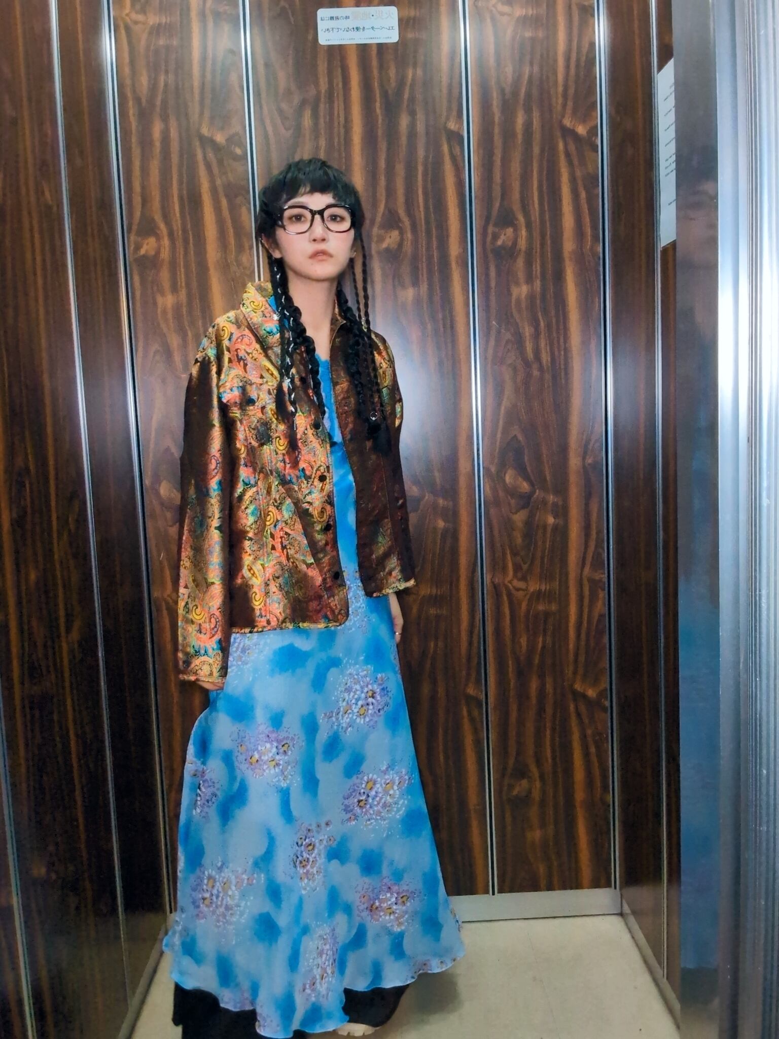 色味は、ブラック×オレンジ×ブルー×グリーン×イエロー。レーヨン、ポリ、シルク、の混合素材で綺麗な形を保ちつつもテロっとした滑らかさのある質感。