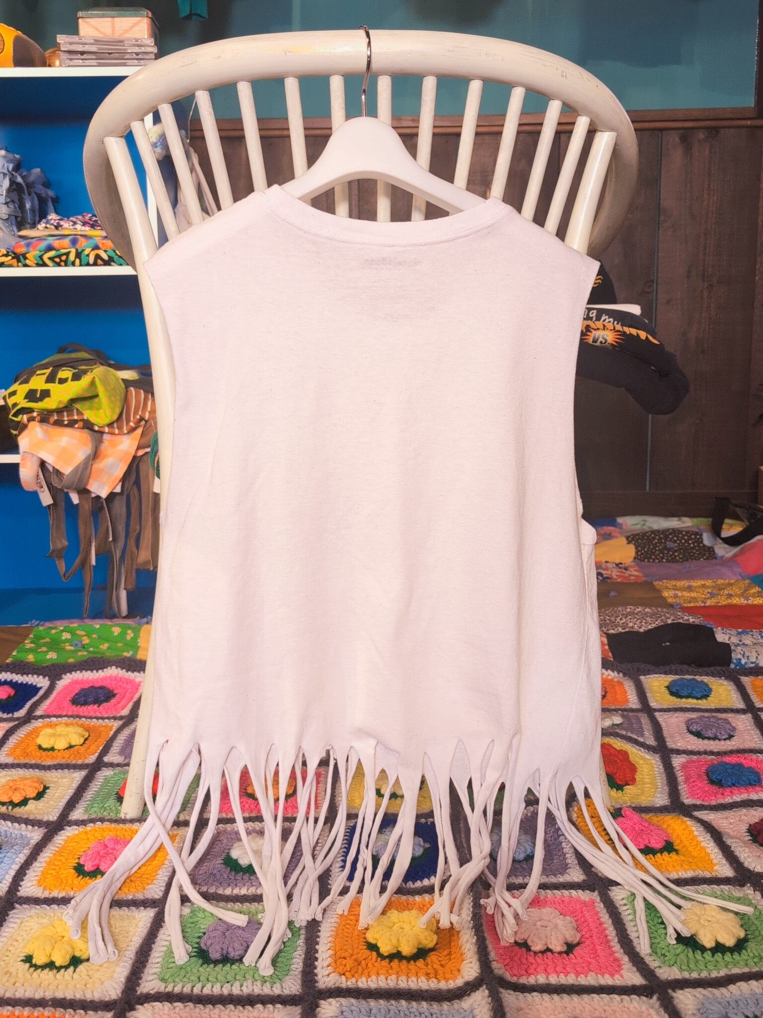 また、もともとTeeシャツだったものの袖をカットオフ×裾をフリンジにしてるこのリメイク。
