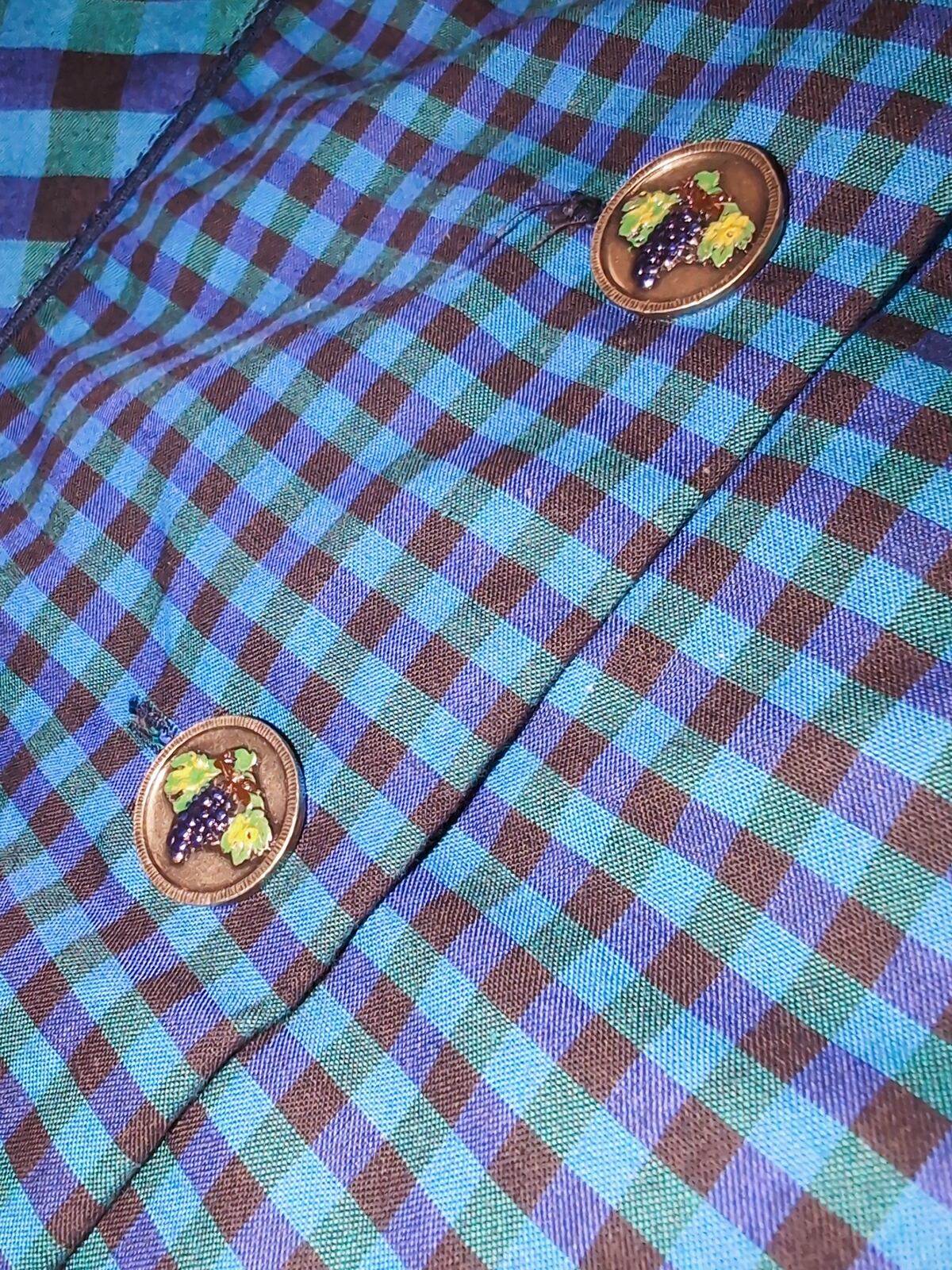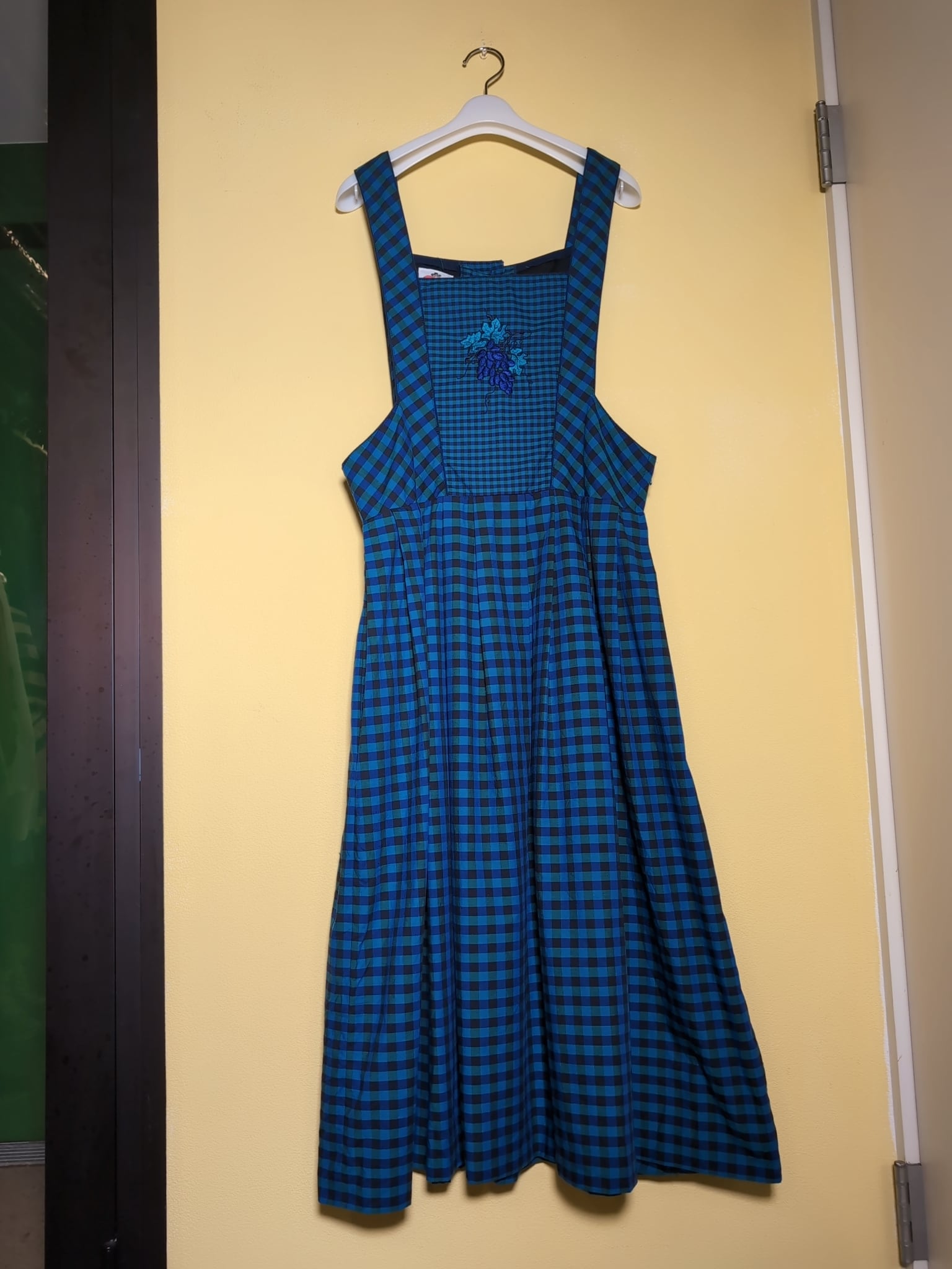エプロンワンピです。寒色のチェックでかわいらしいデザインでありながらも落ち着いた雰囲気があるのが◎胸元のぶどうの刺繍がらぶりー♡