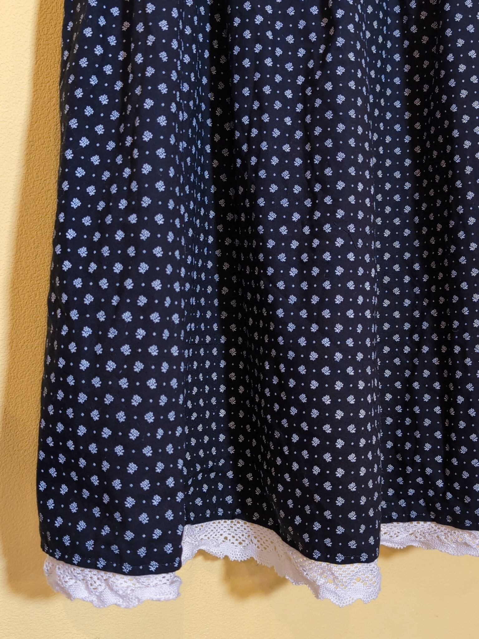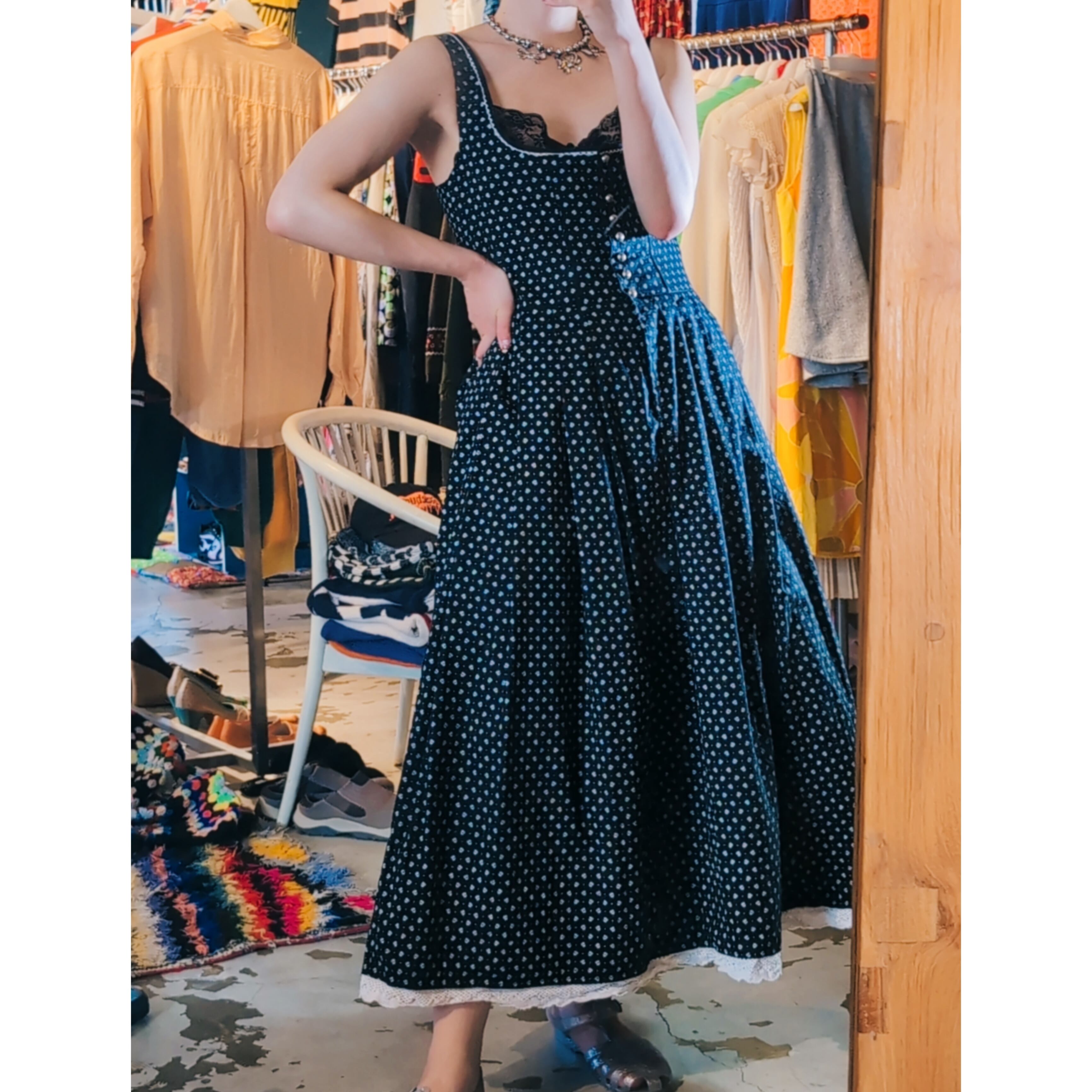 好きで度々入荷するディアンドルですが、ラブリーまたは装飾的過ぎるものが多い中こちらはシックな雰囲気です。黒地に小花柄。ポイントは裾のレース。