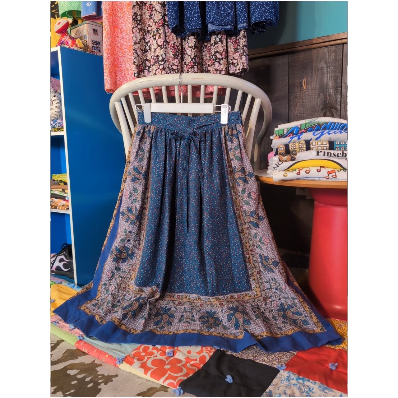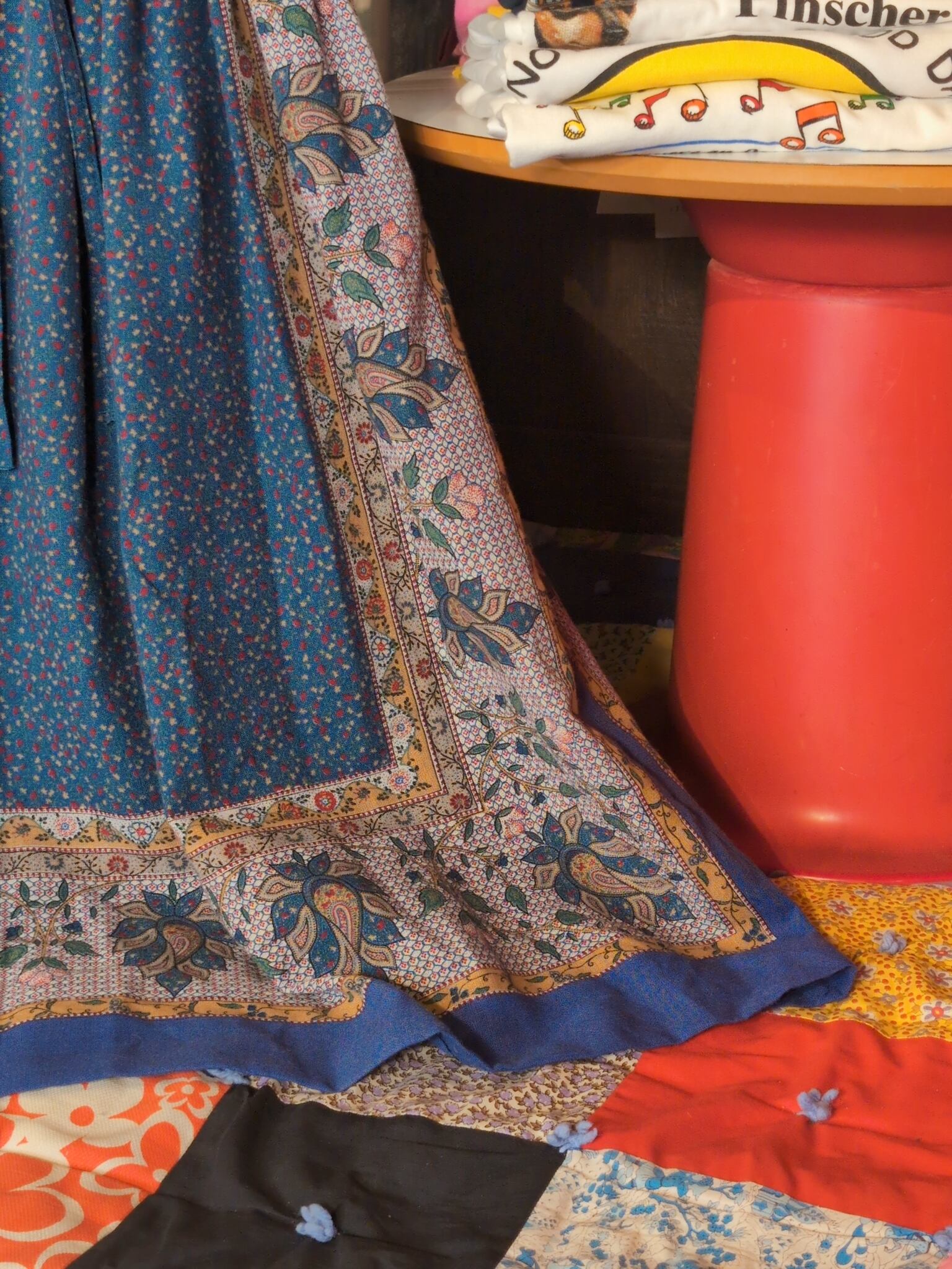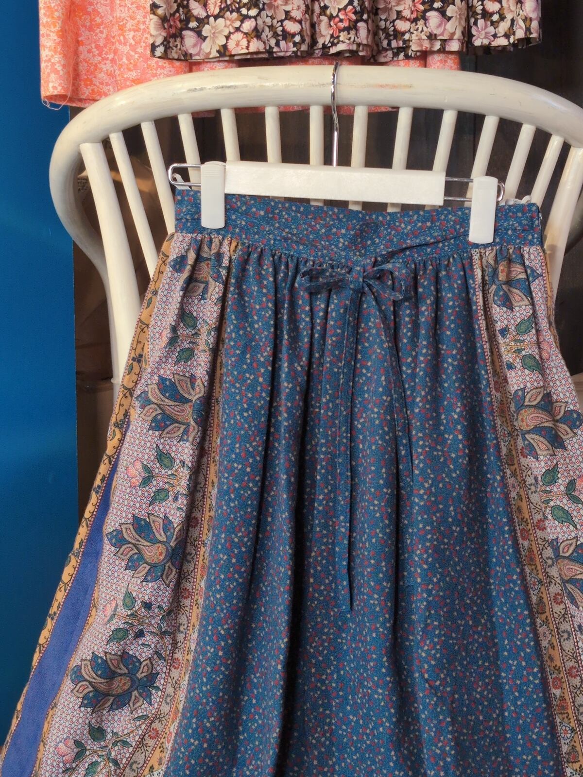スカーフのような、一枚の絵のようなテキスタイルがとってもステキ。抽象的なフレークのような?お花のような?プリントの周りに雰囲気のあるボタニカルな柄が魅力的な一着です。
