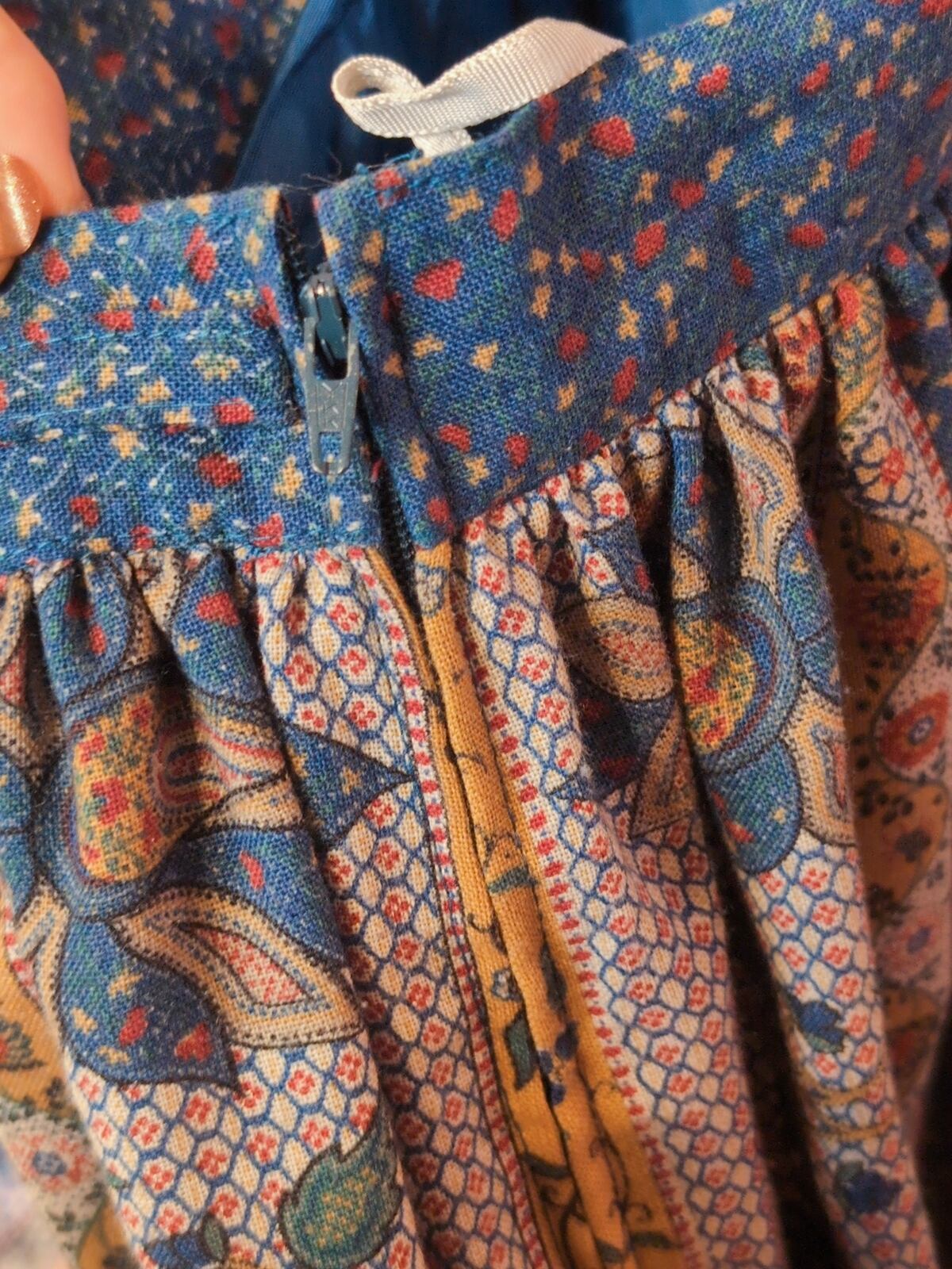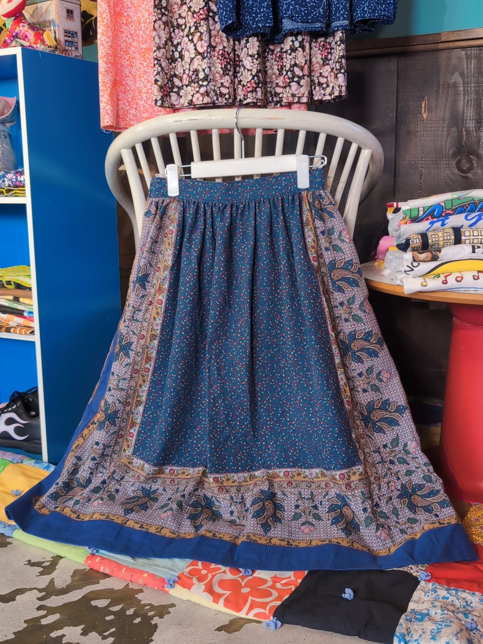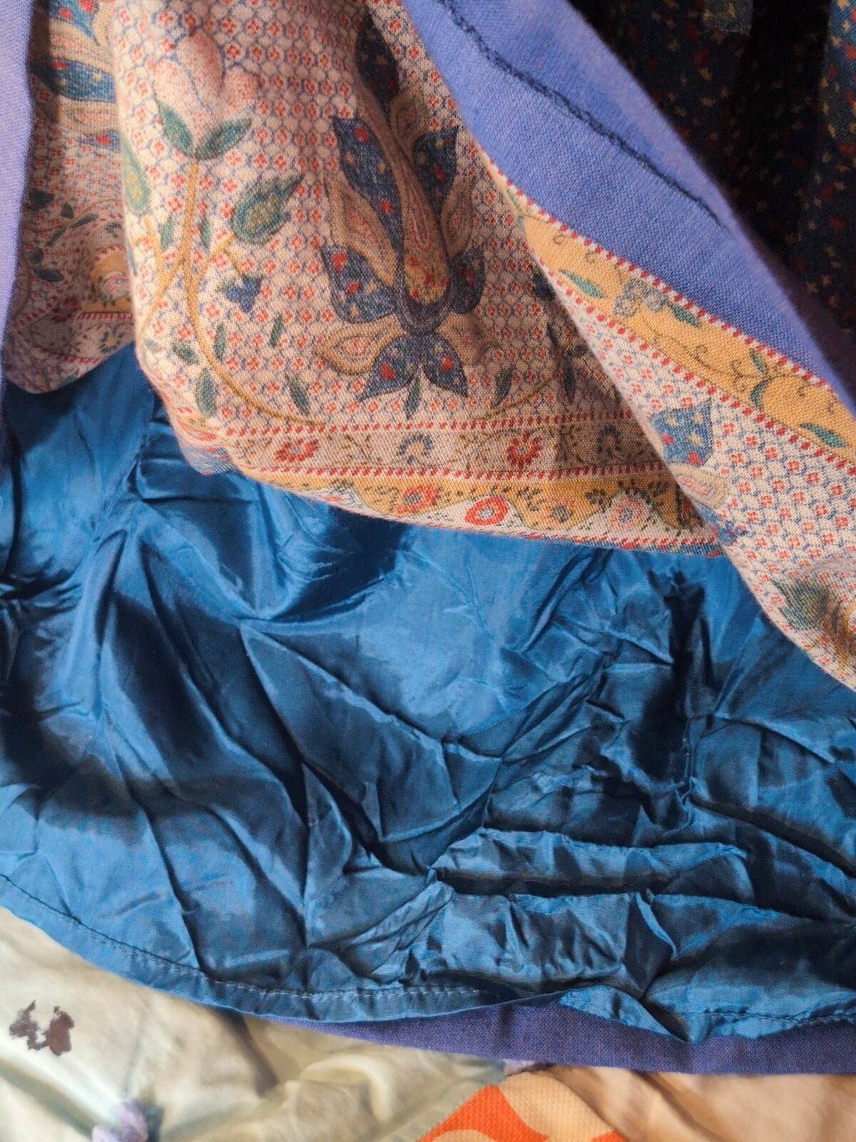 スカーフのような、一枚の絵のようなテキスタイルがとってもステキ。抽象的なフレークのような?お花のような?プリントの周りに雰囲気のあるボタニカルな柄が魅力的な一着です。