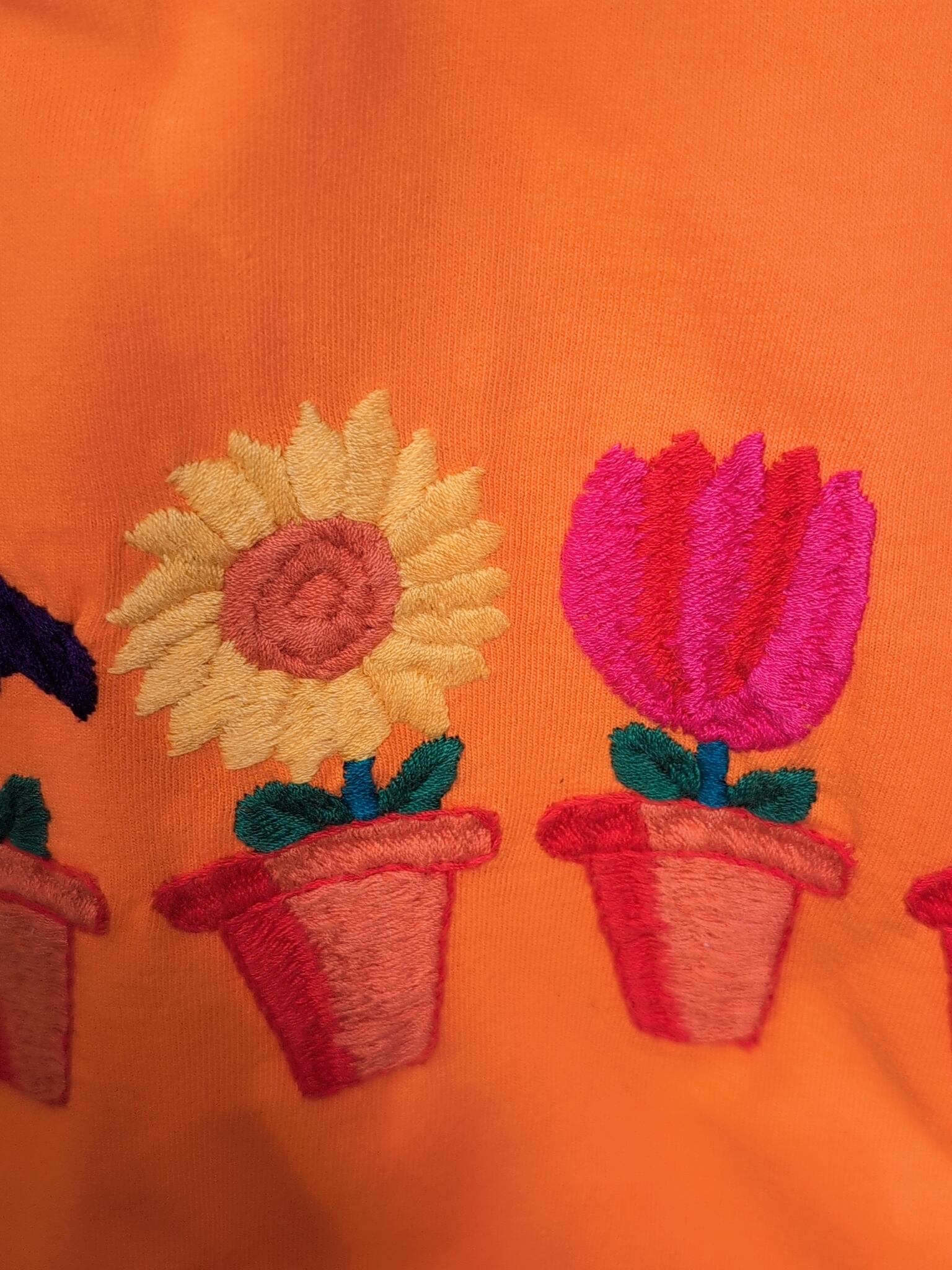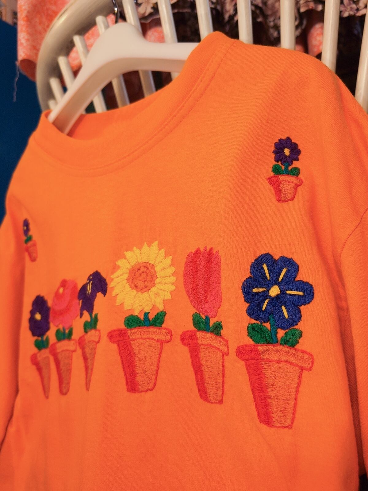 鉢に植えられたお花の刺繍と鮮やかなカラーリングが魅力的な一着。にぎやかな配色に立体感のある刺繍。刺繍って何のアイテムに施されててもやっぱり見ちゃうなぁ~。