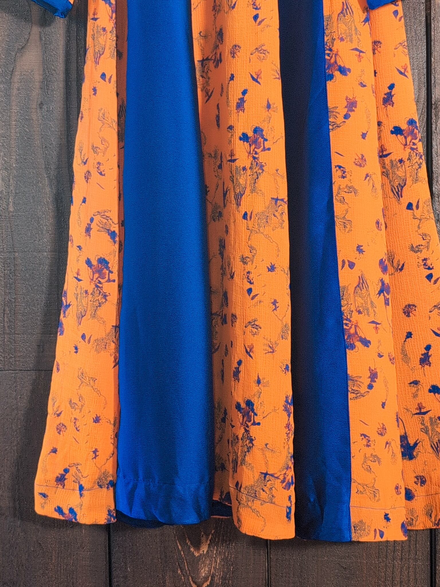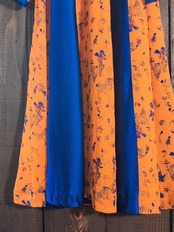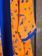 軽やかでシアーな素材とサテンのような光沢のある素材のMIX。鮮やかなカラーリング、お花の繊細なプリント、シンプルなライン。