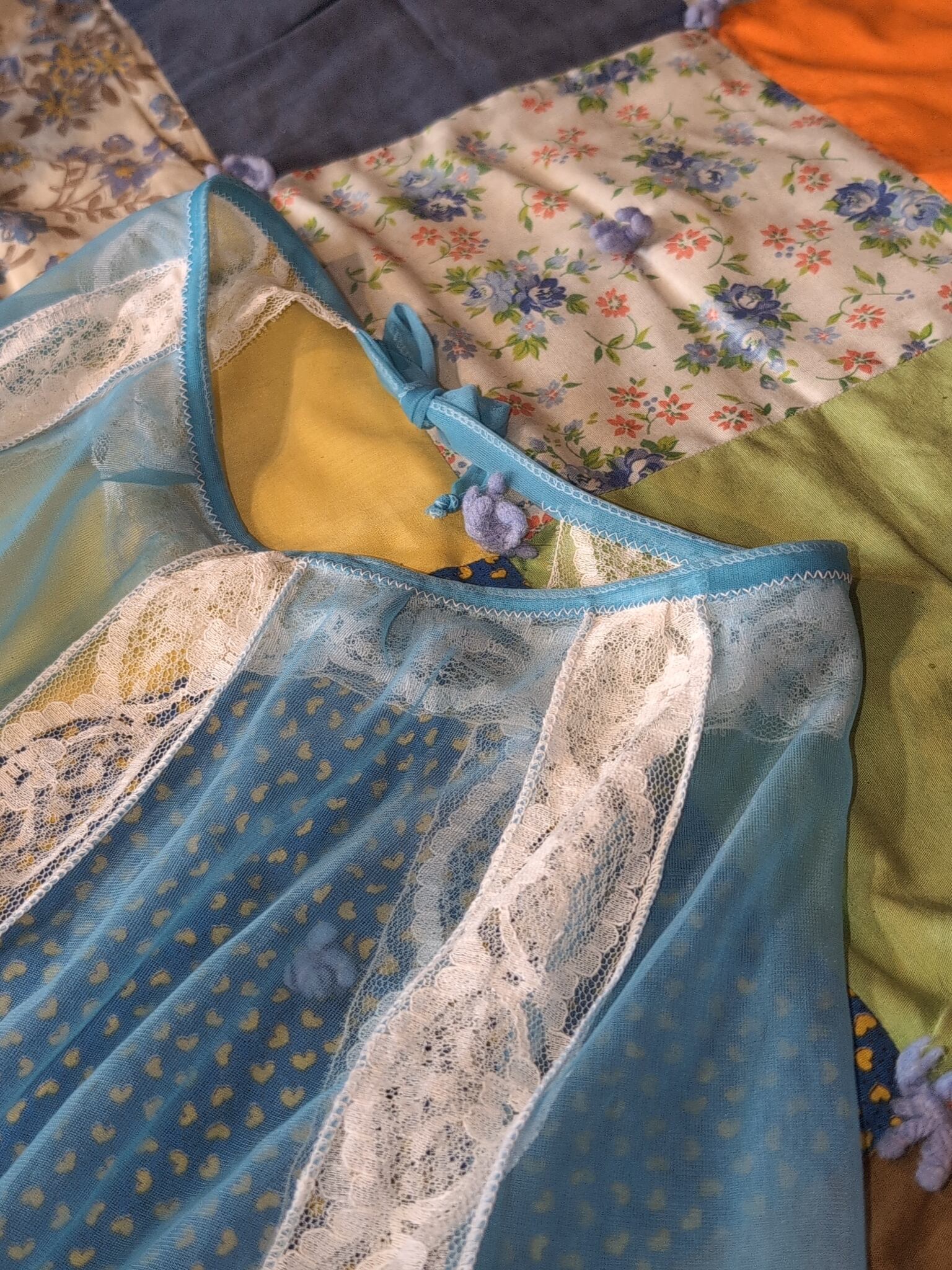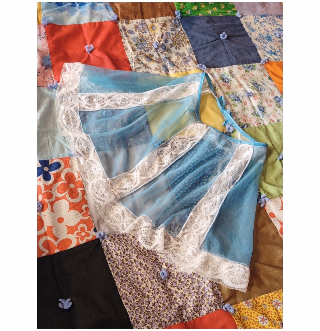 色味は、ホワイト×ブルー。シースルーとレースが可憐な雰囲気です。ワンピースやスカート、スラックス、デニムなどに気軽にレイヤードしてアクセサリー感覚で使っていただくのが◎