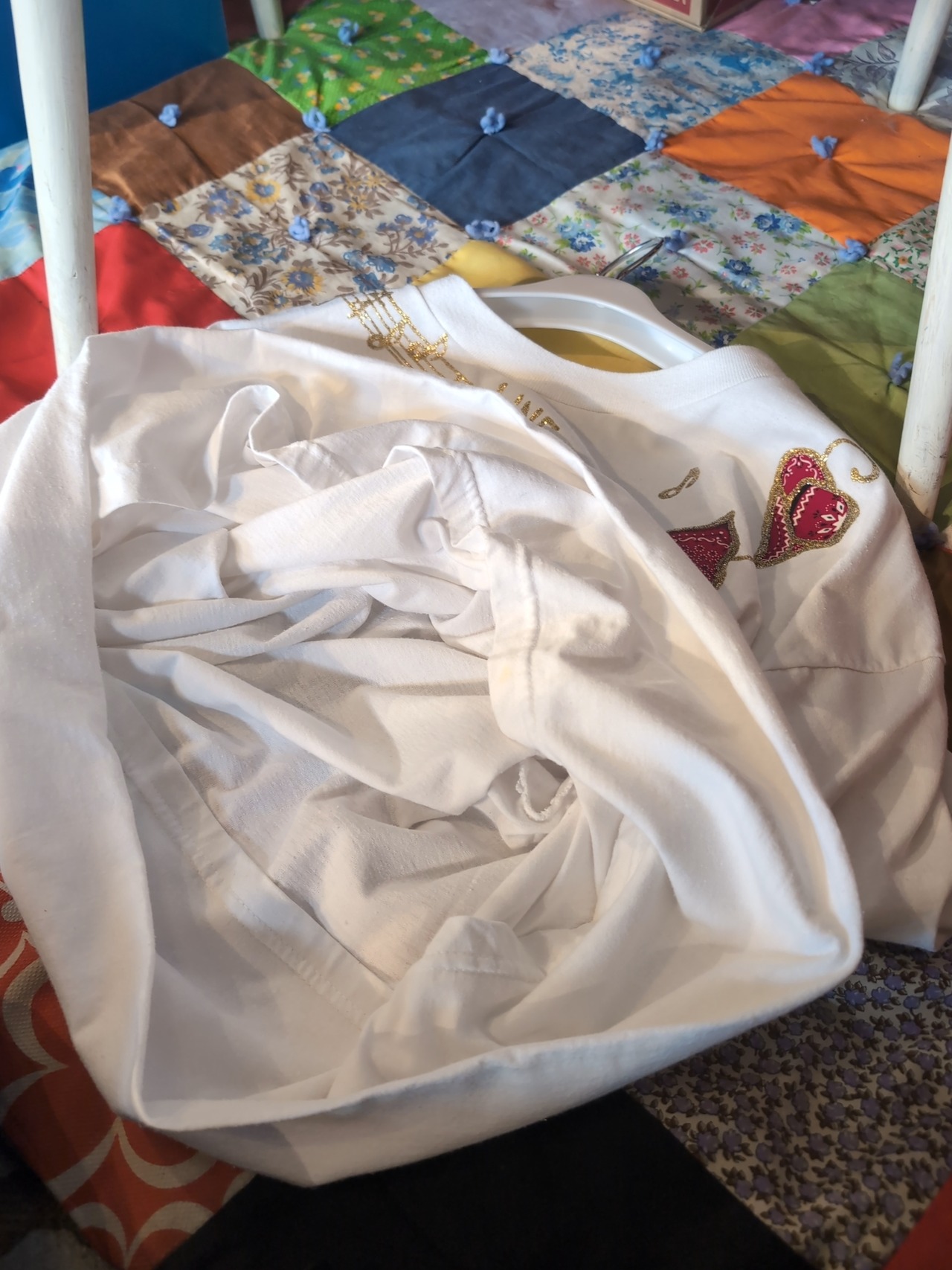 バンダナのようなペイズリーのテキスタイルを切り張り、キラキラのゴールドで囲んだデザイン。袖にもプリント有りなのが可愛いです。
