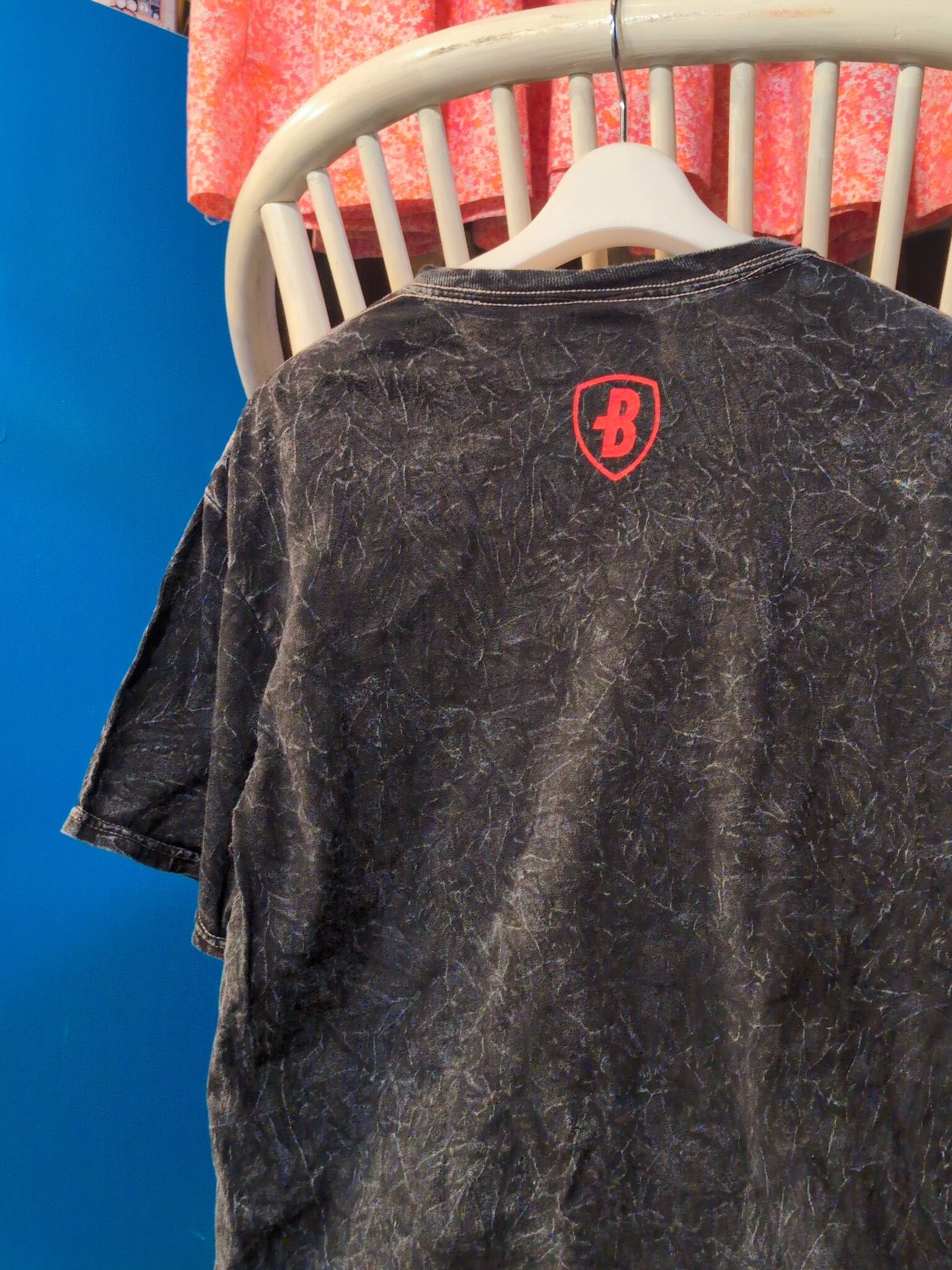 エッジの効いたUFOのプリントと、ケミカルウォッシュの様なベースカラーがナイスな一着です。カッコいい。薄手のコットンで軽やかな着心地。