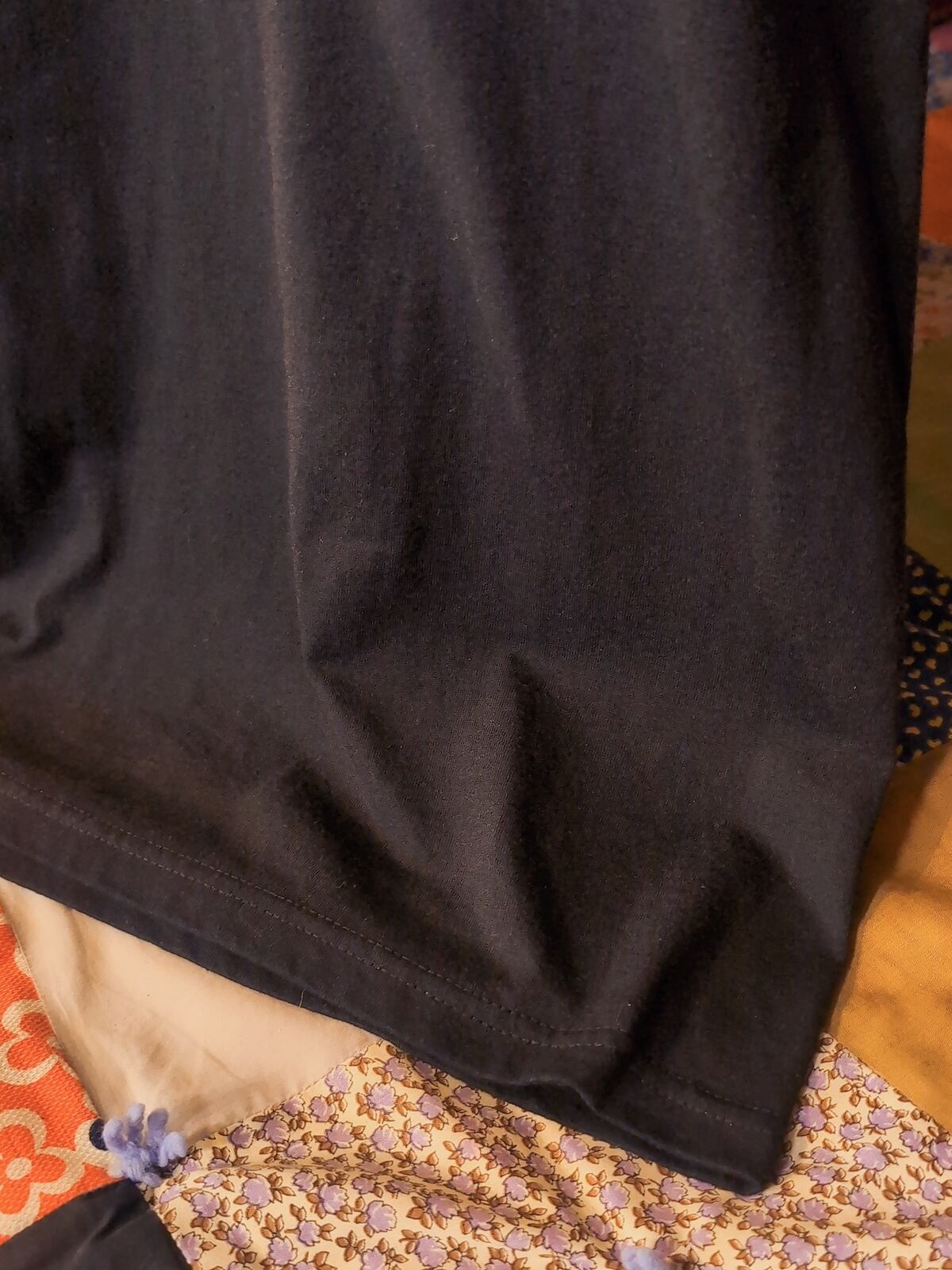 キラキラのグリッターでされたプリント。ほどよくゆとりあるサイズ、コットン×ポリのハリはありつつも柔らかさのある素材感。