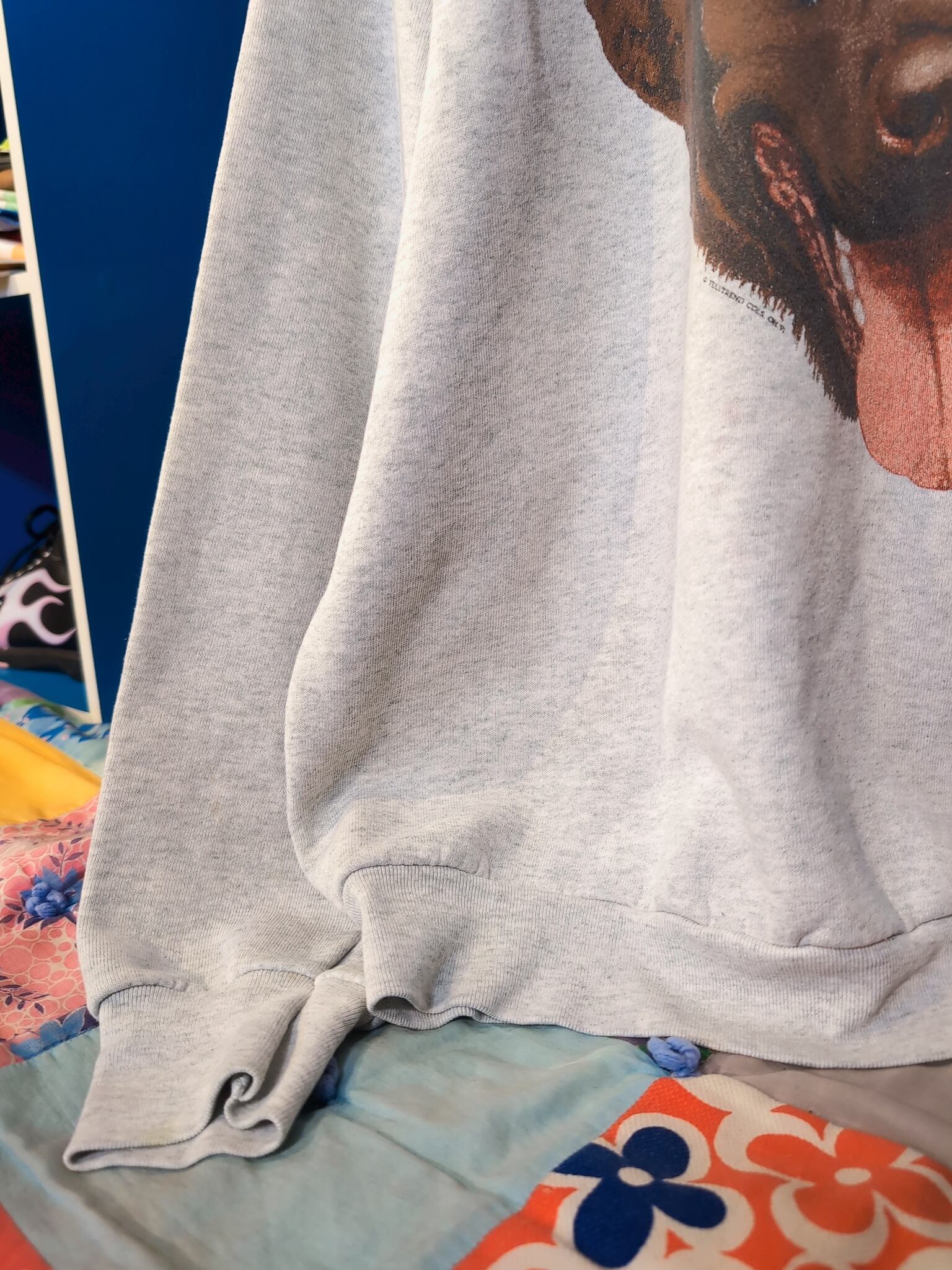 柔順な目線の先には何があるのだろうか…チョコラブちゃんのお顔が可愛い一着です。ワンちゃんプリントはひじょうに根強い人気アイテム。