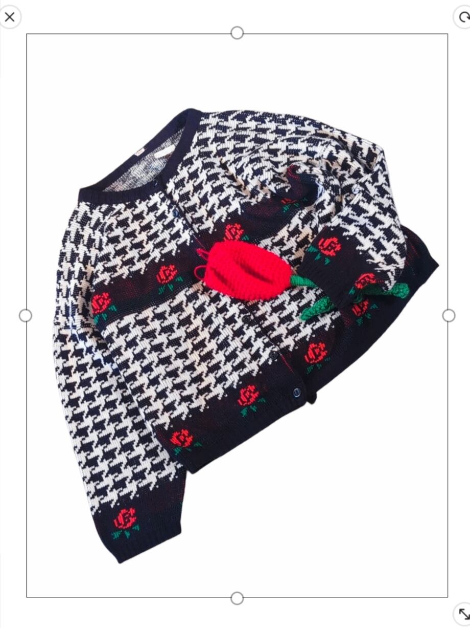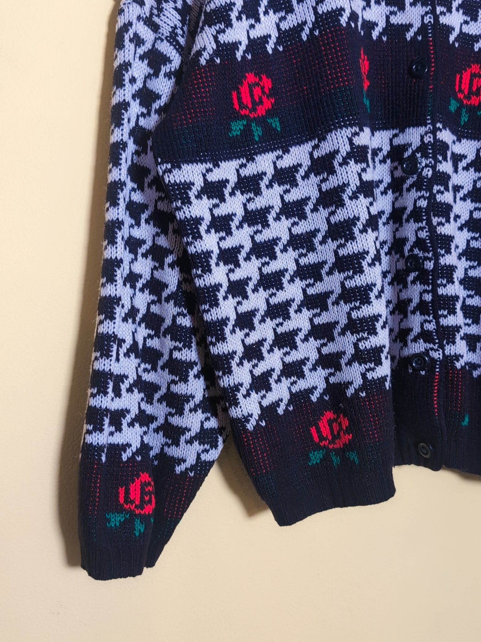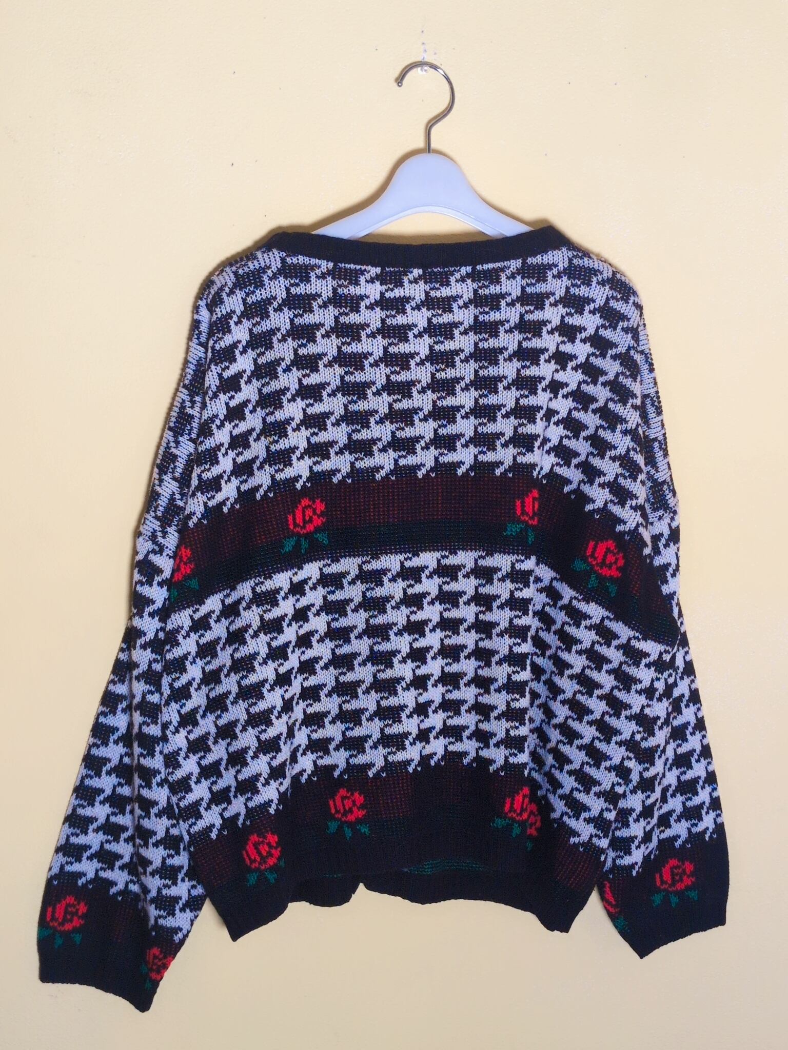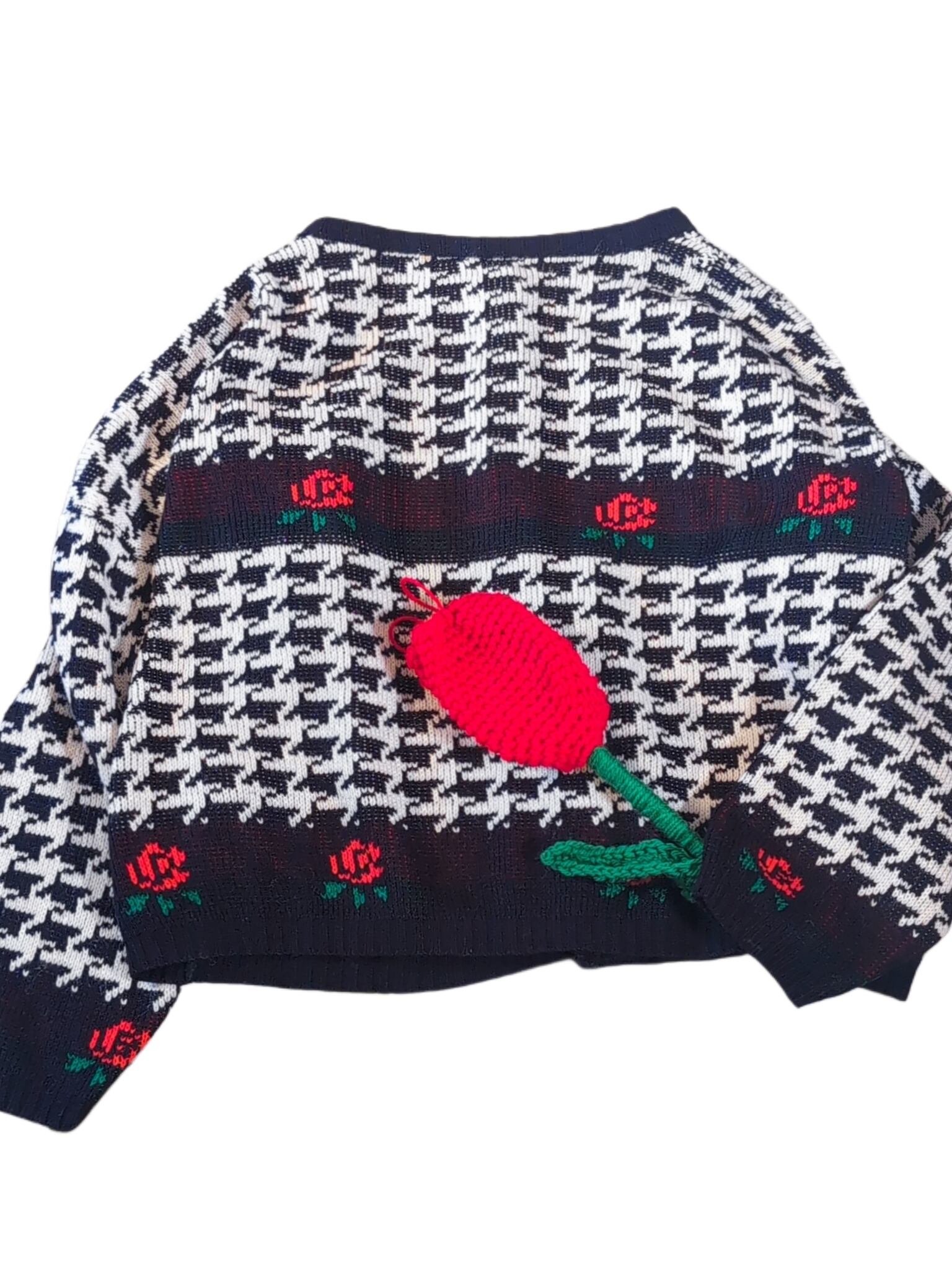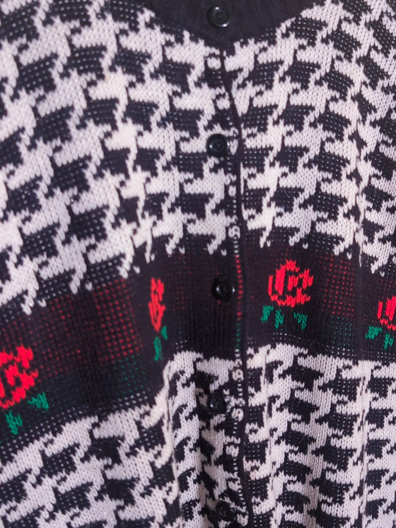 素材表記はございませんが、おそらく化繊です。千鳥格子柄とお花が素敵。身幅の広さとアームホールのゆったり感、上品な雰囲気かつカジュアルなサイズ感とシルエットが魅力。