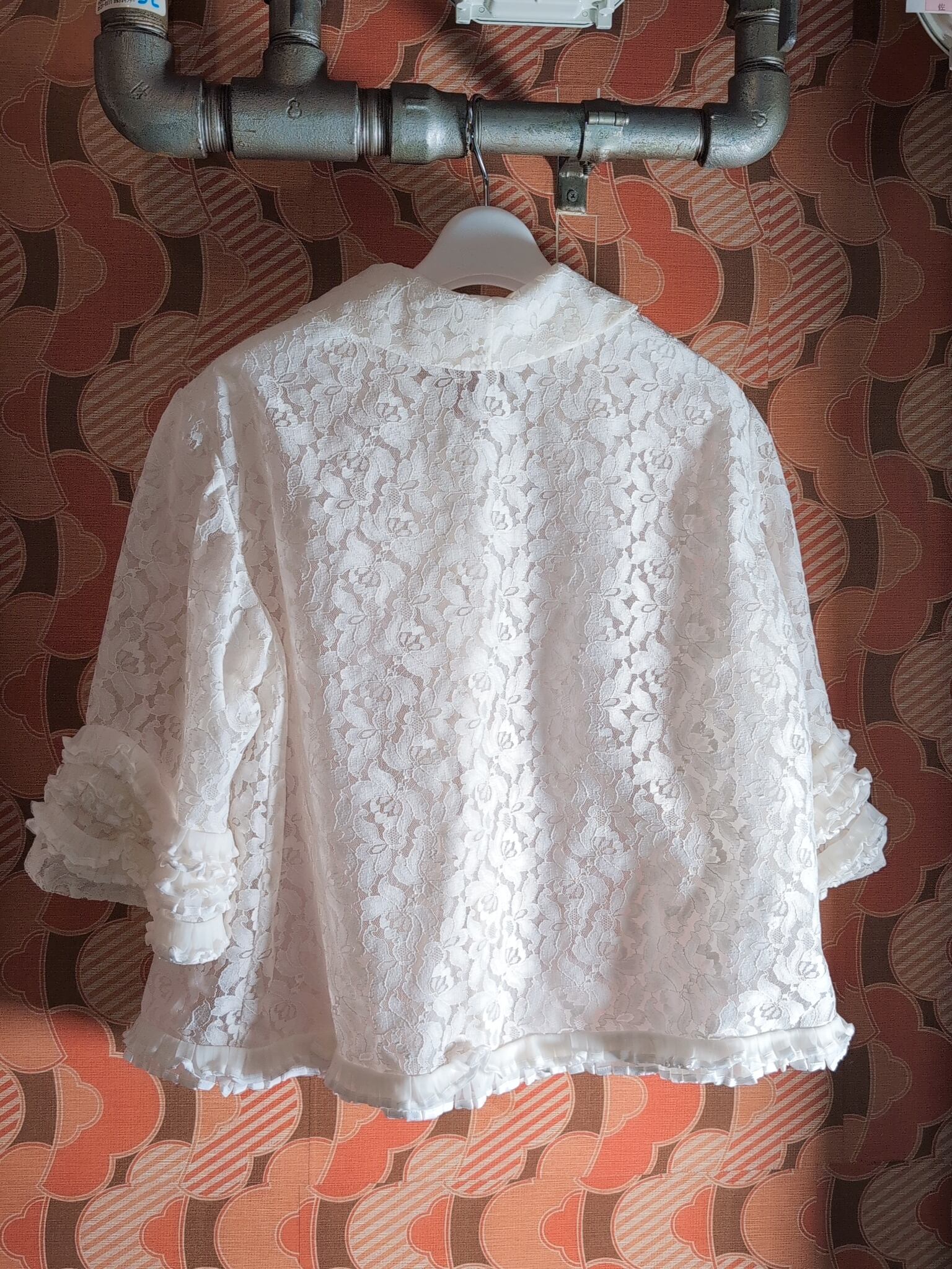 色味は、ホワイト。繊細なレース×プリプリのアウトラインがとってもかわいい一着。カチッと上品ながらも丸みのある襟で柔らかい雰囲気があるのも◎