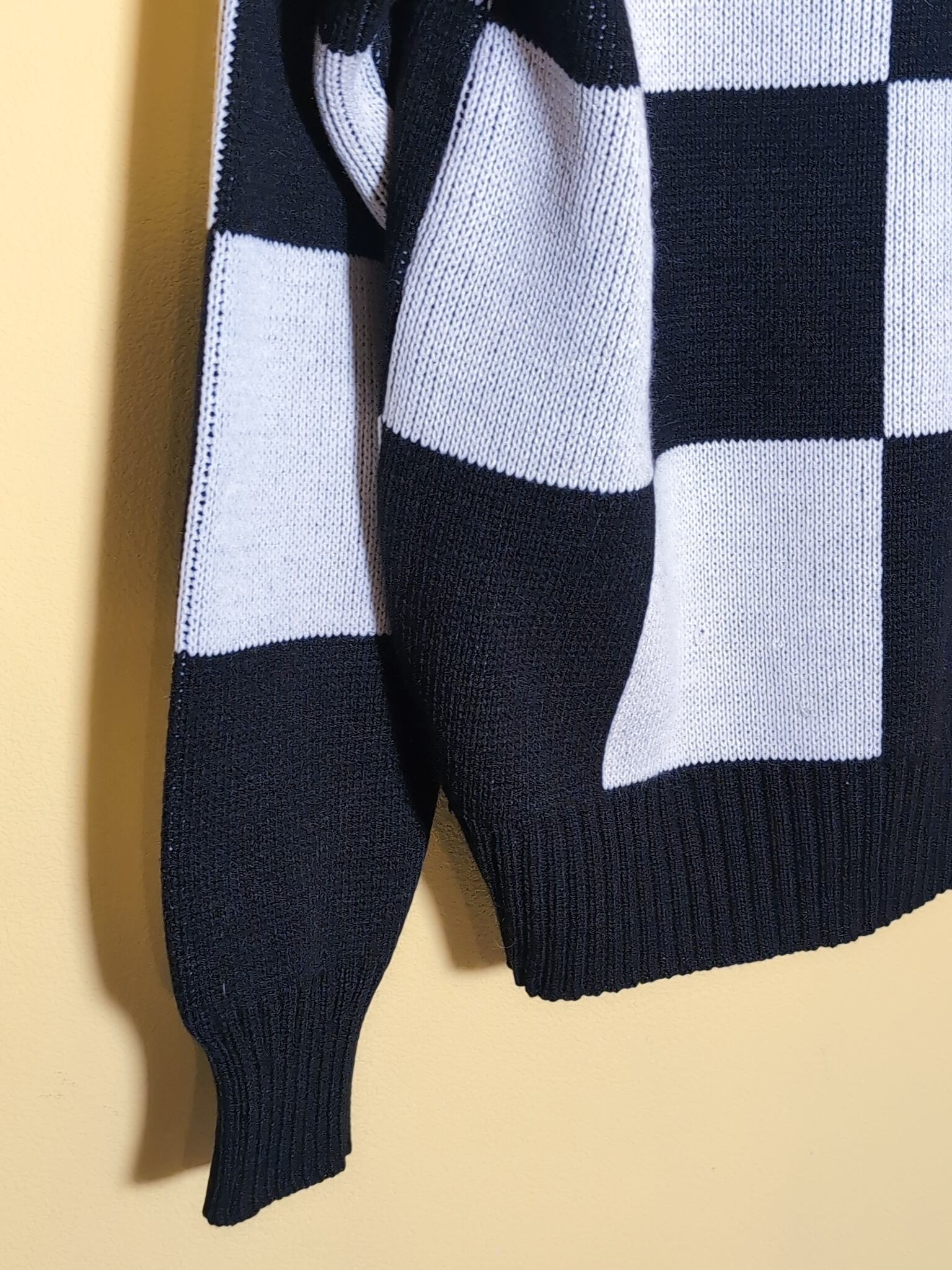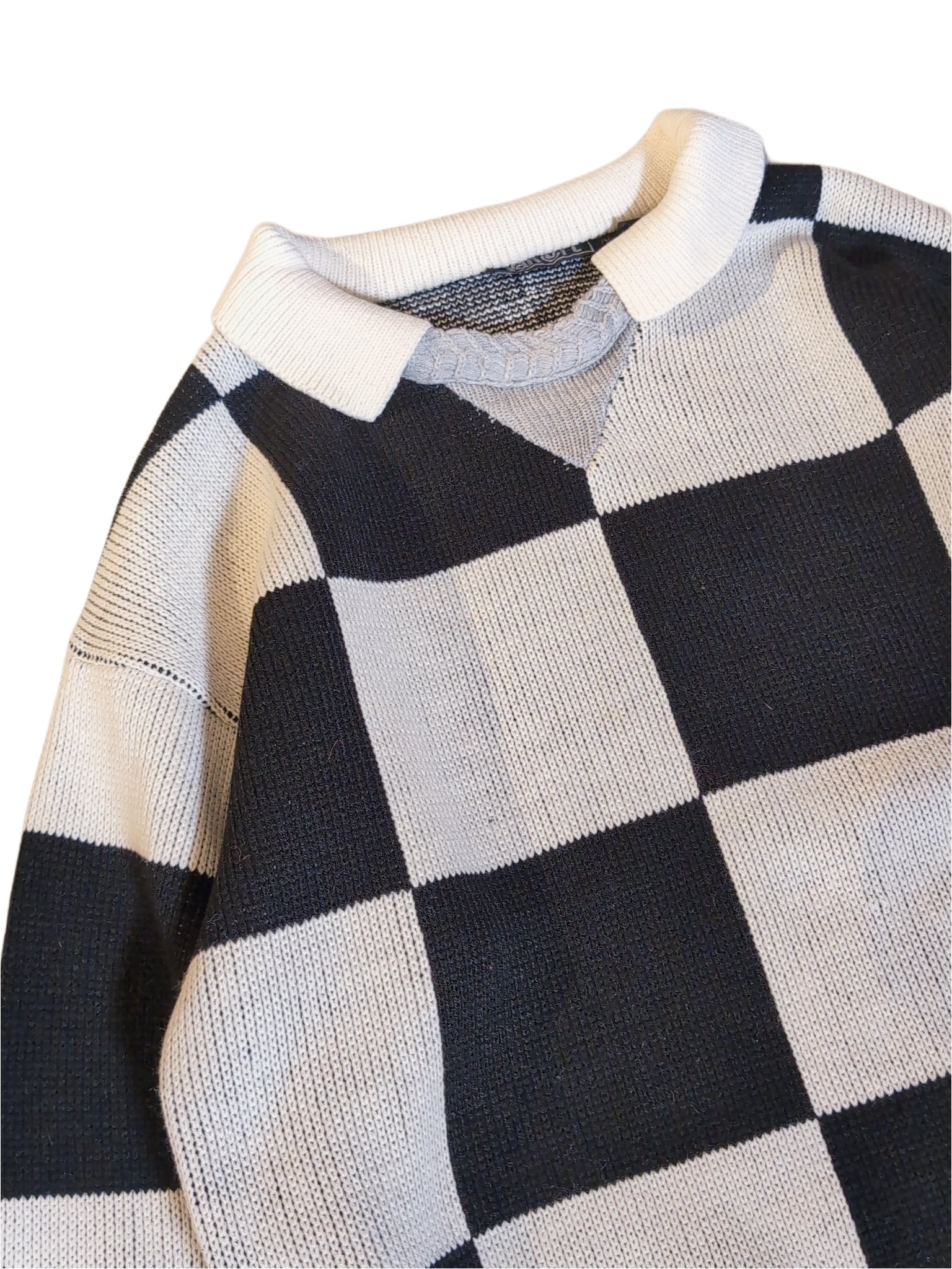 大きなチェッカーフラッグ柄が可愛い一着。襟元のデザインがポロカラーになっていてカジュアルな雰囲気なのも◎チェッカーフラッグ自体問答無用で好きなんですけど、ただのクルーネックじゃなくて襟にポイントがあるのがよいのです。