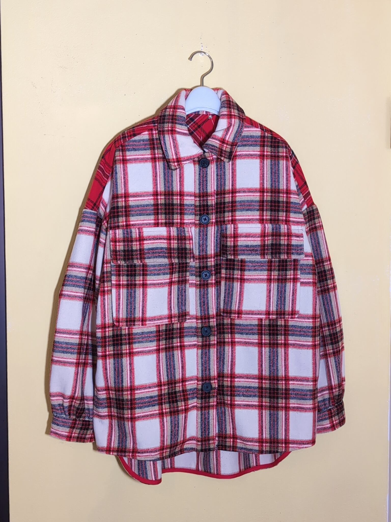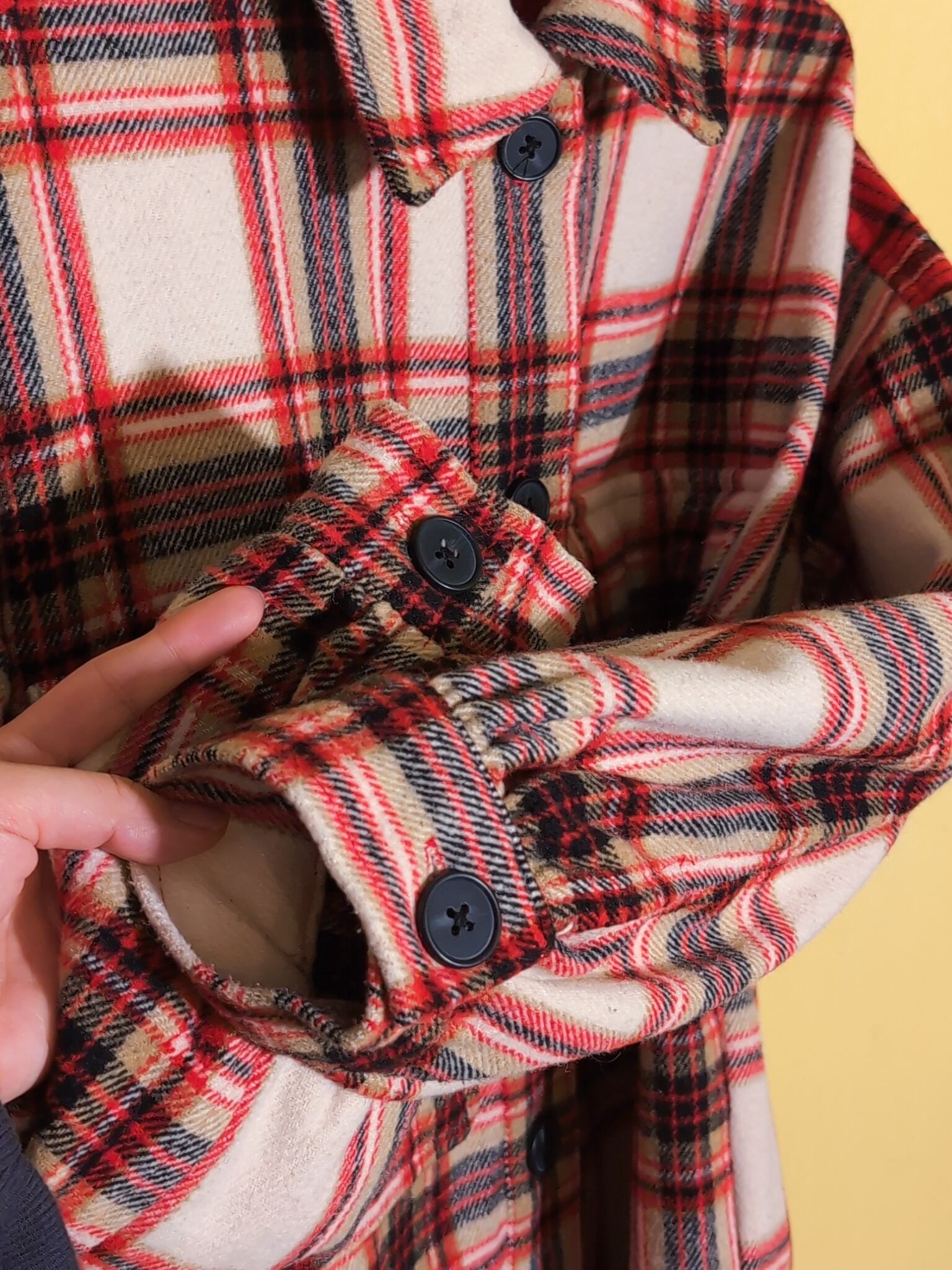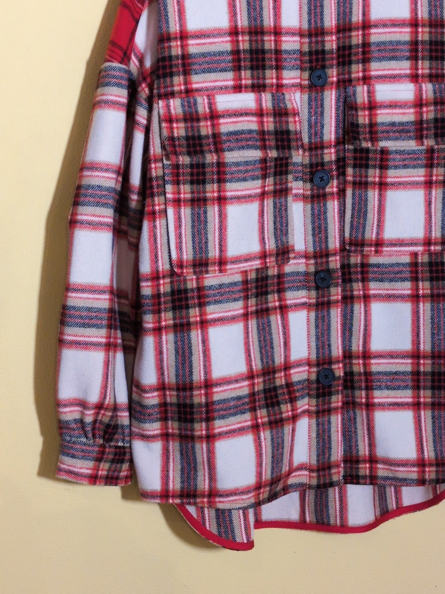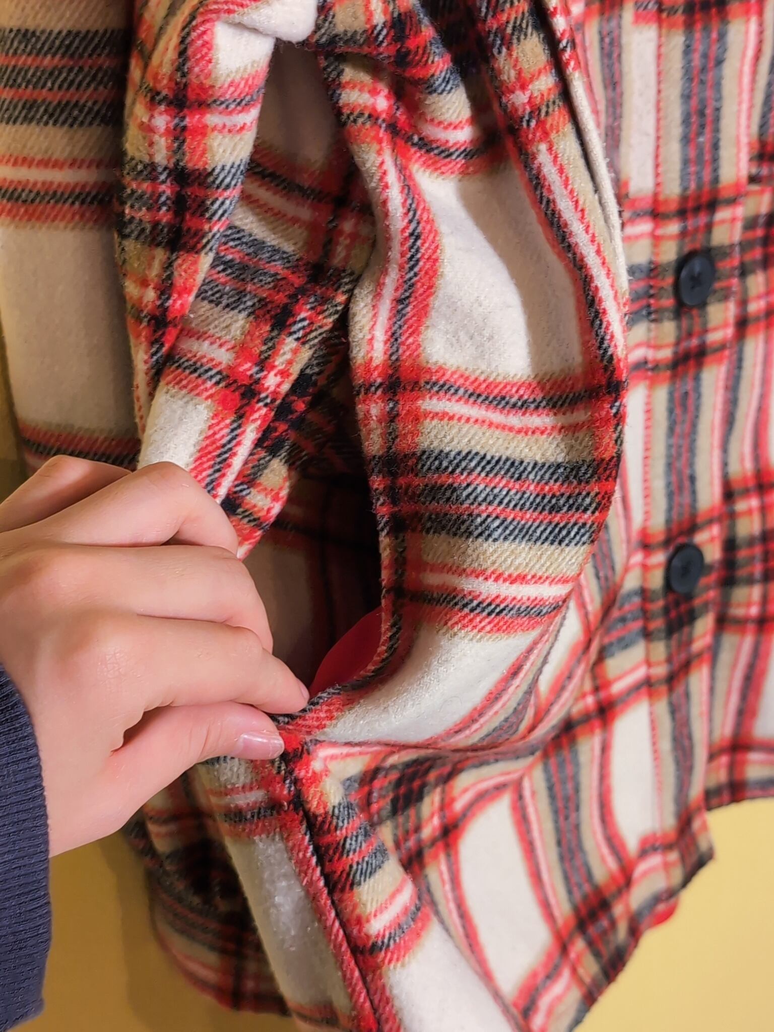 秋の定番、タータンチェック。ガバッと羽織れる大きなサイズ感と重くなりすぎないカラーリング、背面がワンポイントで違ったテキスタイルを使っているのも◎