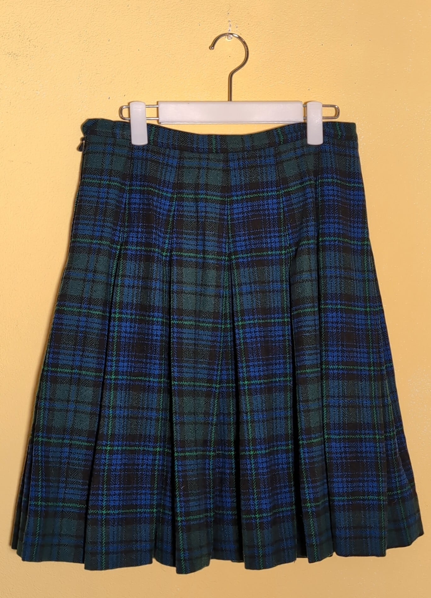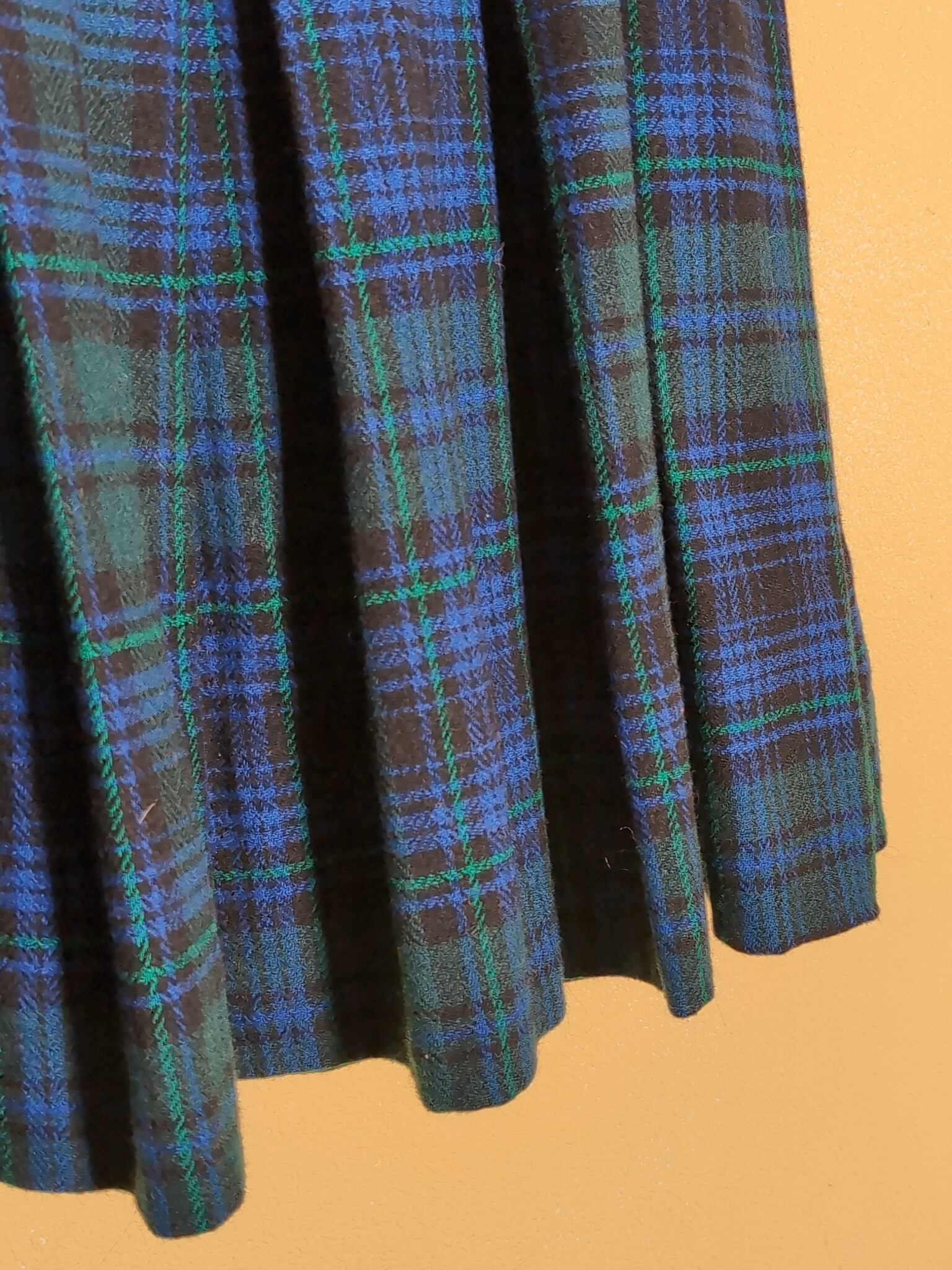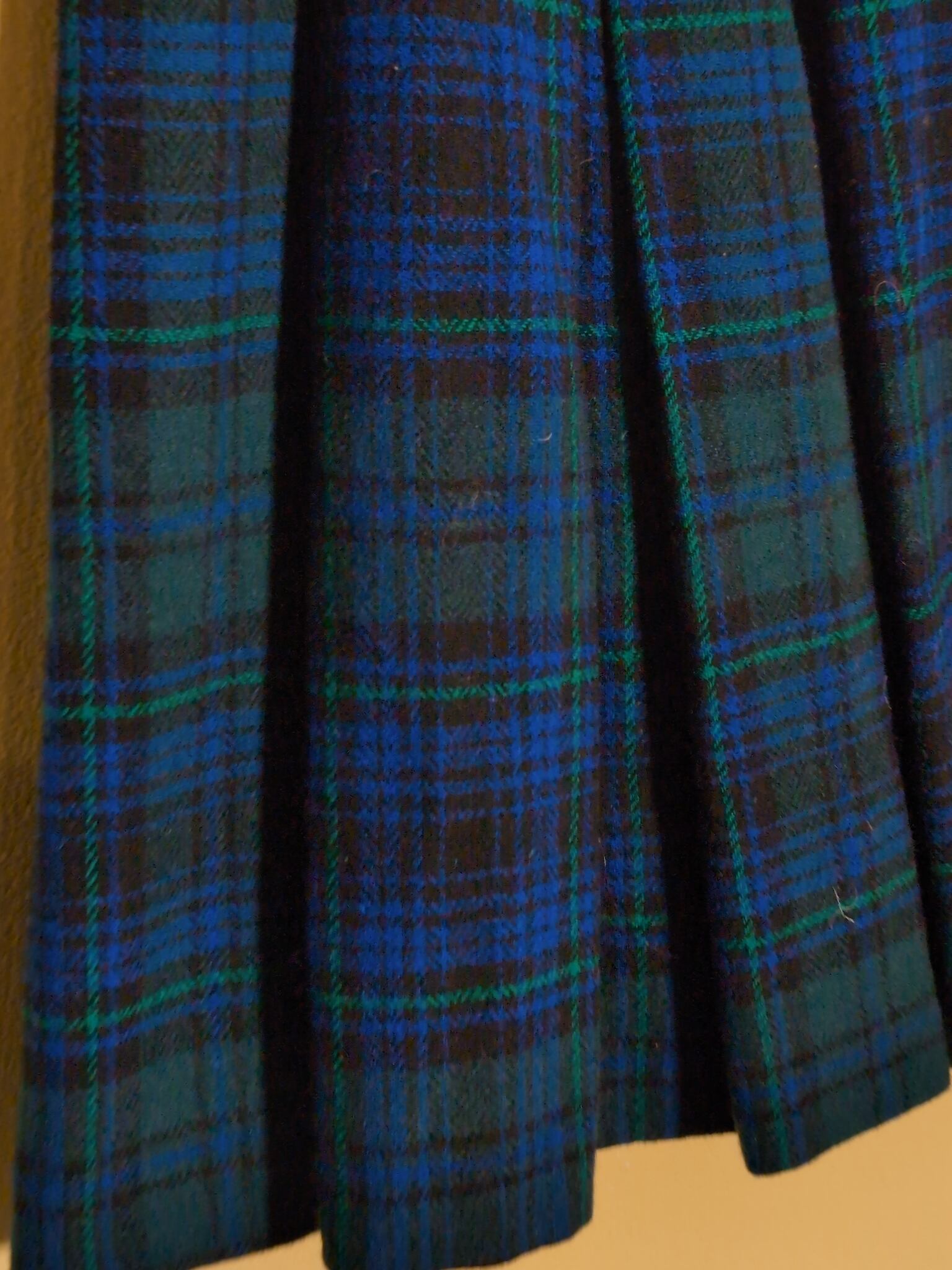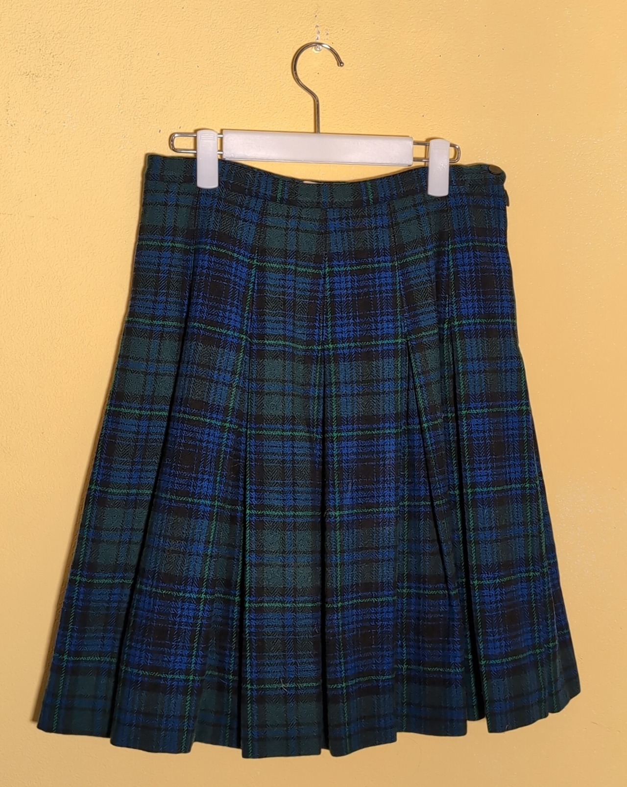 色味は、ブルー×グリーン×ブラック。伝統的なタータンチェック。この感じのものは、ふくらはぎ丈のものが多いですが、短い丈なのが◎しっかりとしたウールの厚みも魅力的◎