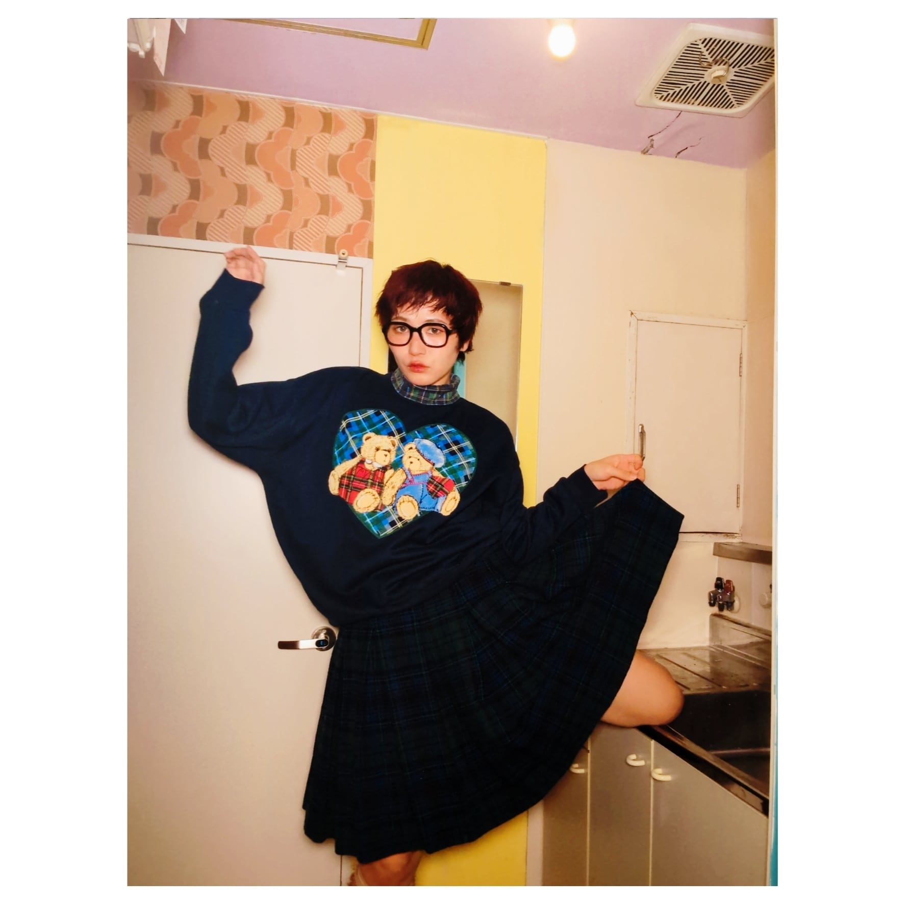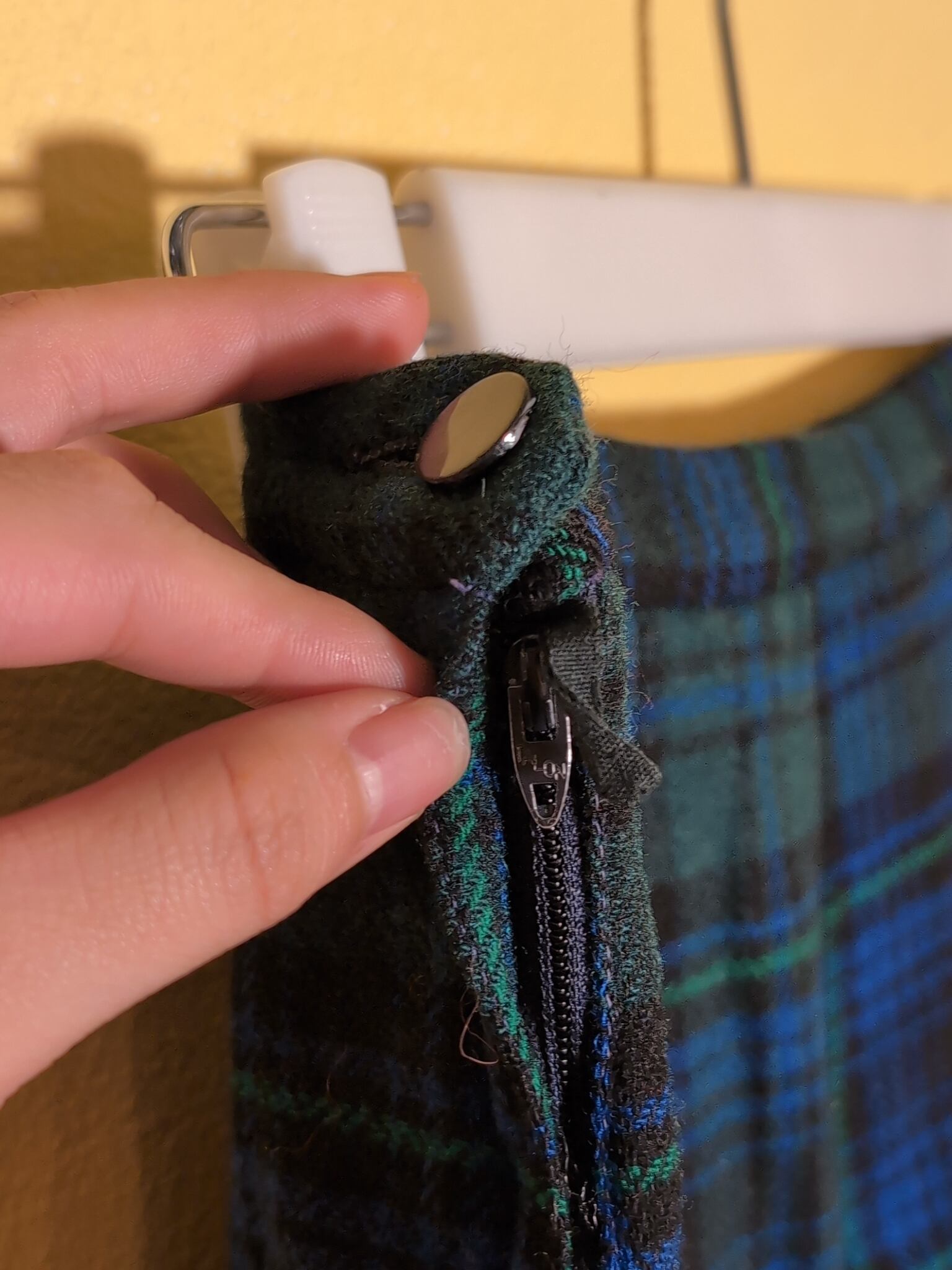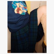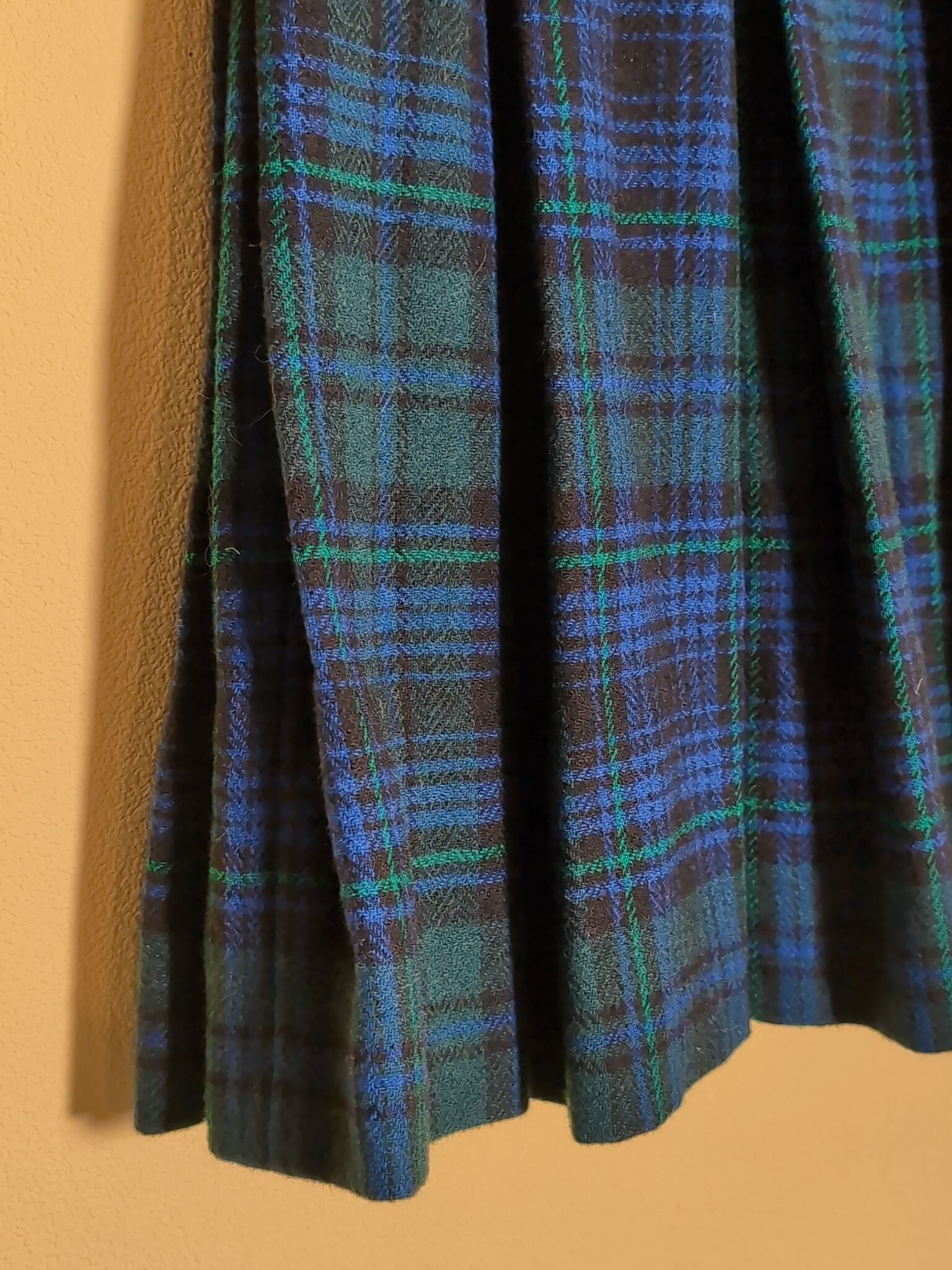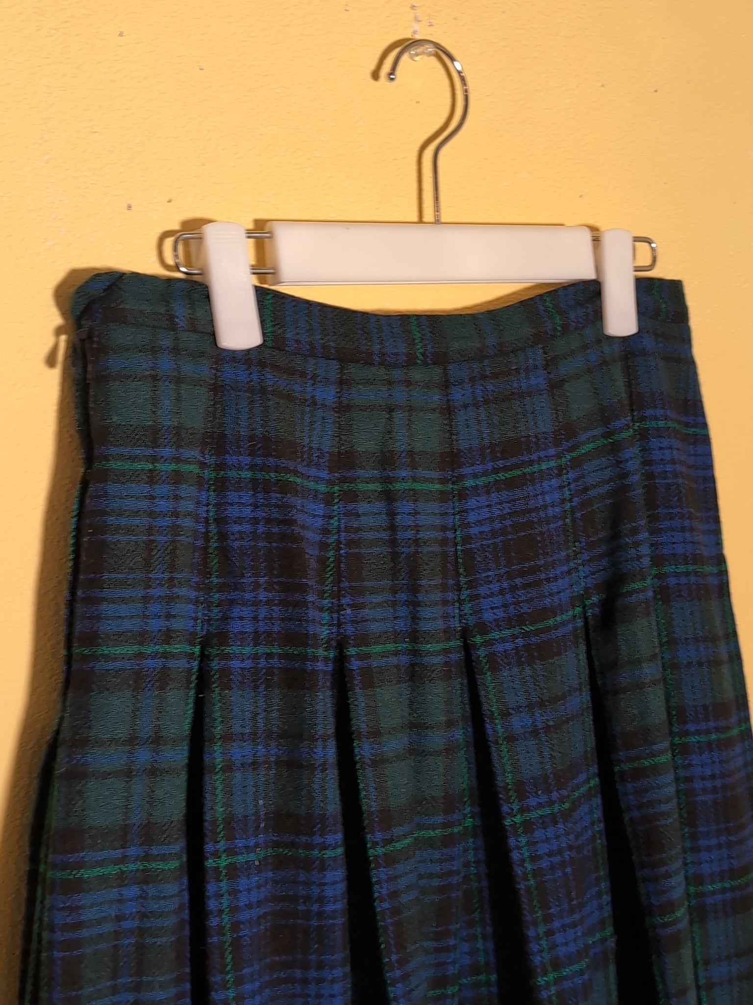 色味は、ブルー×グリーン×ブラック。伝統的なタータンチェック。この感じのものは、ふくらはぎ丈のものが多いですが、短い丈なのが◎しっかりとしたウールの厚みも魅力的◎