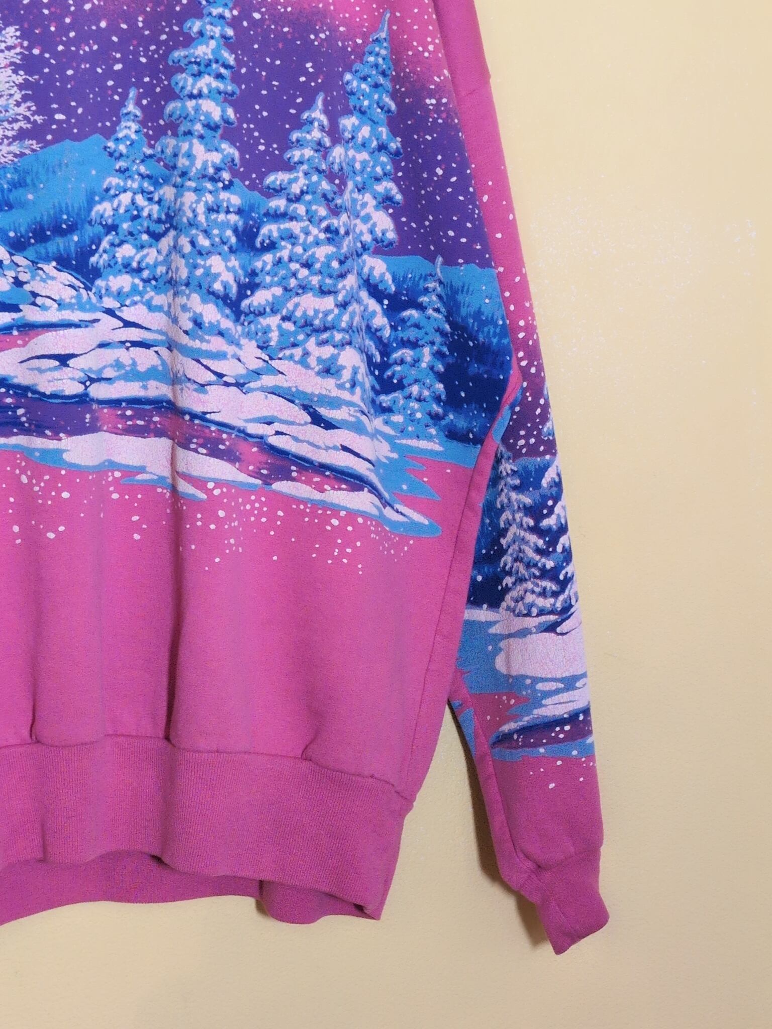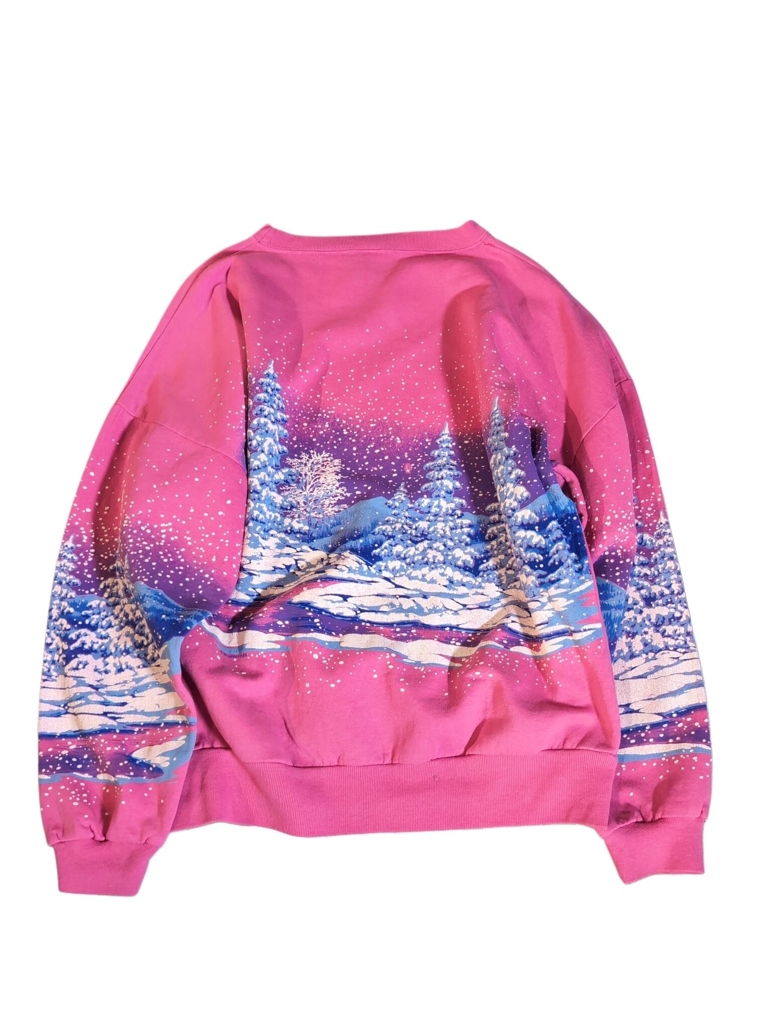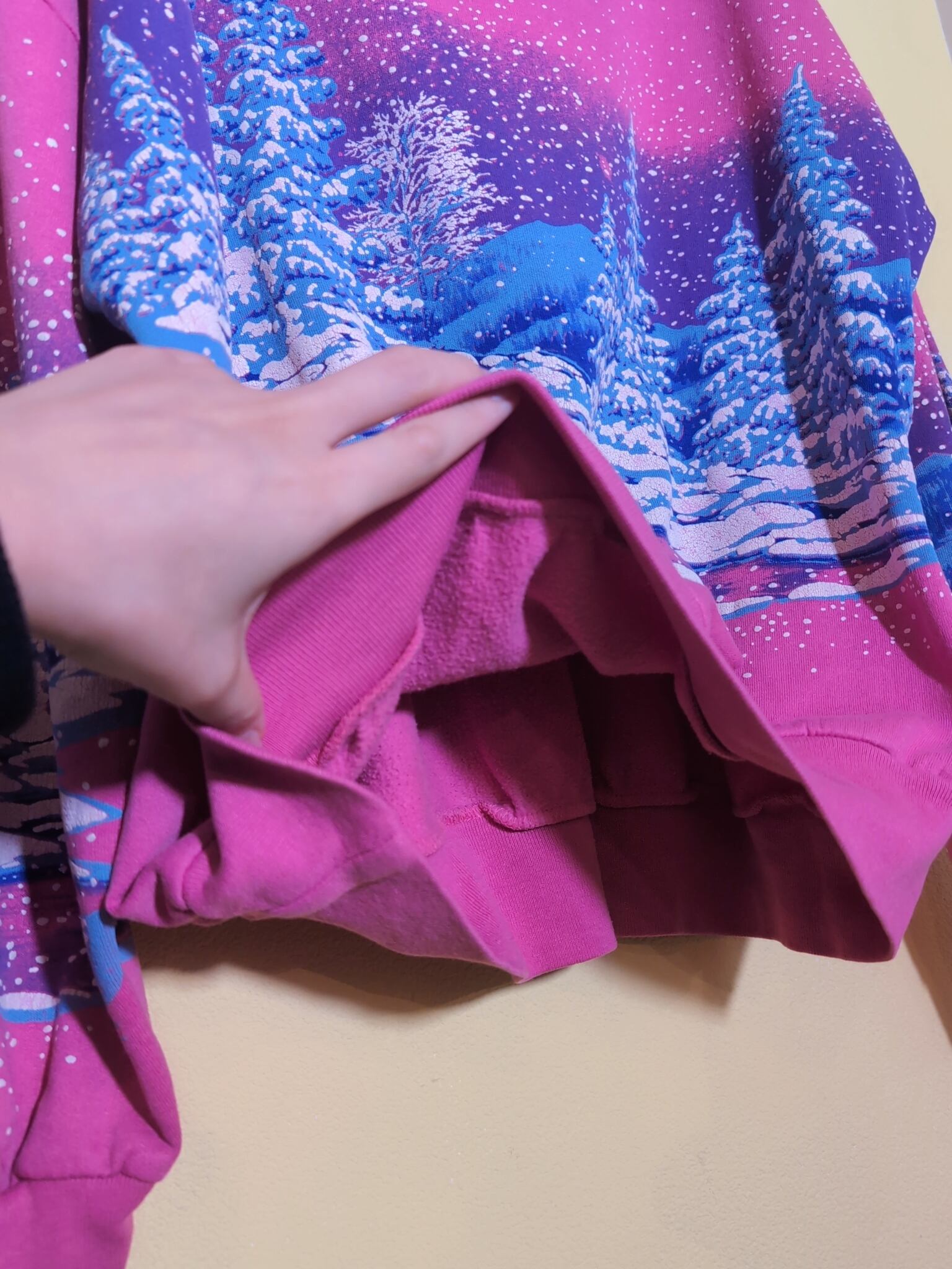 色味は、ピンク×ホワイト×パープル×ブルー。このプリントのスウェット好きなんですよね。もふもふとした冬の雪景色が全体を大胆に覆う総柄。カラーリングの華やかさが魅力的。