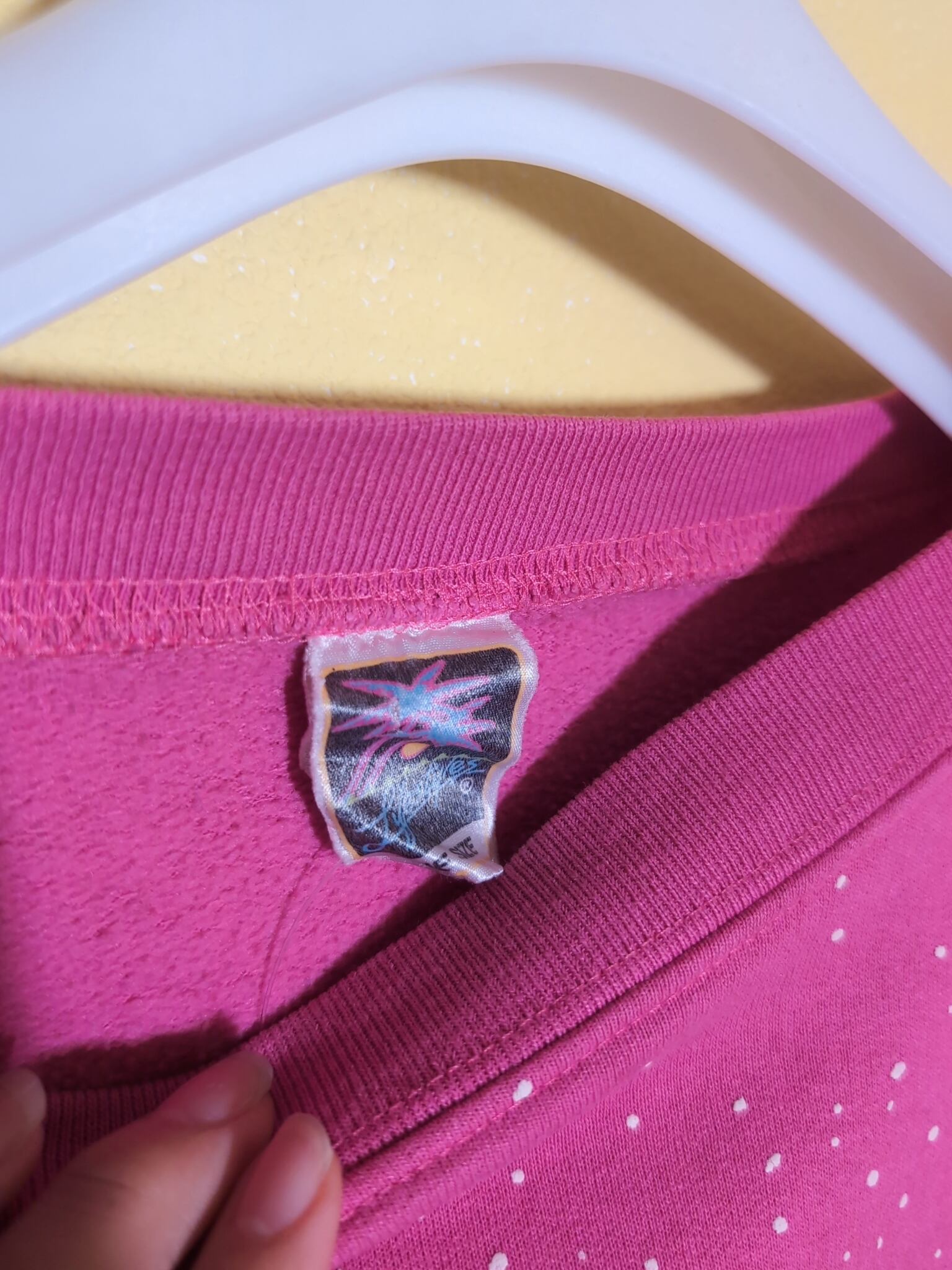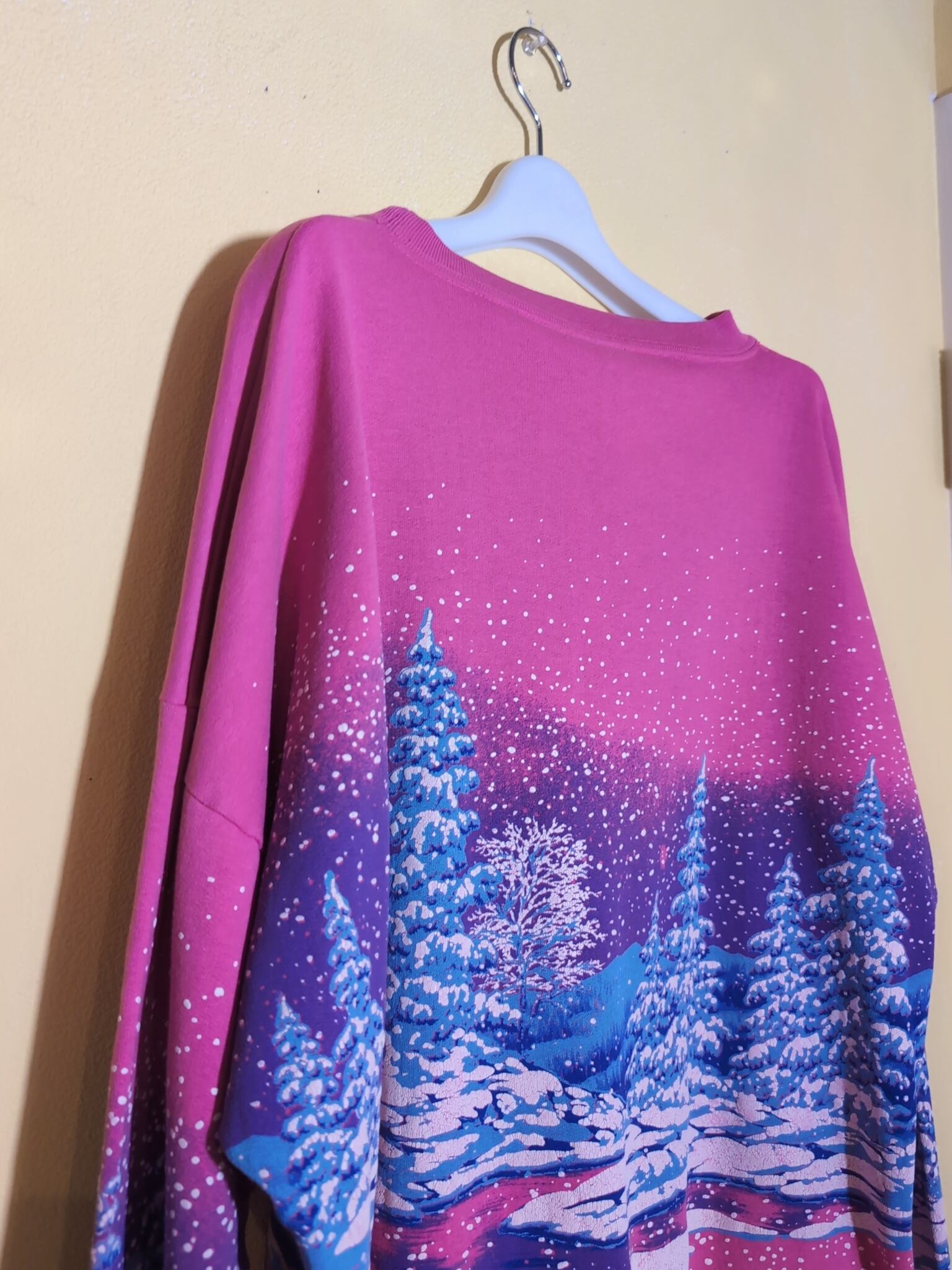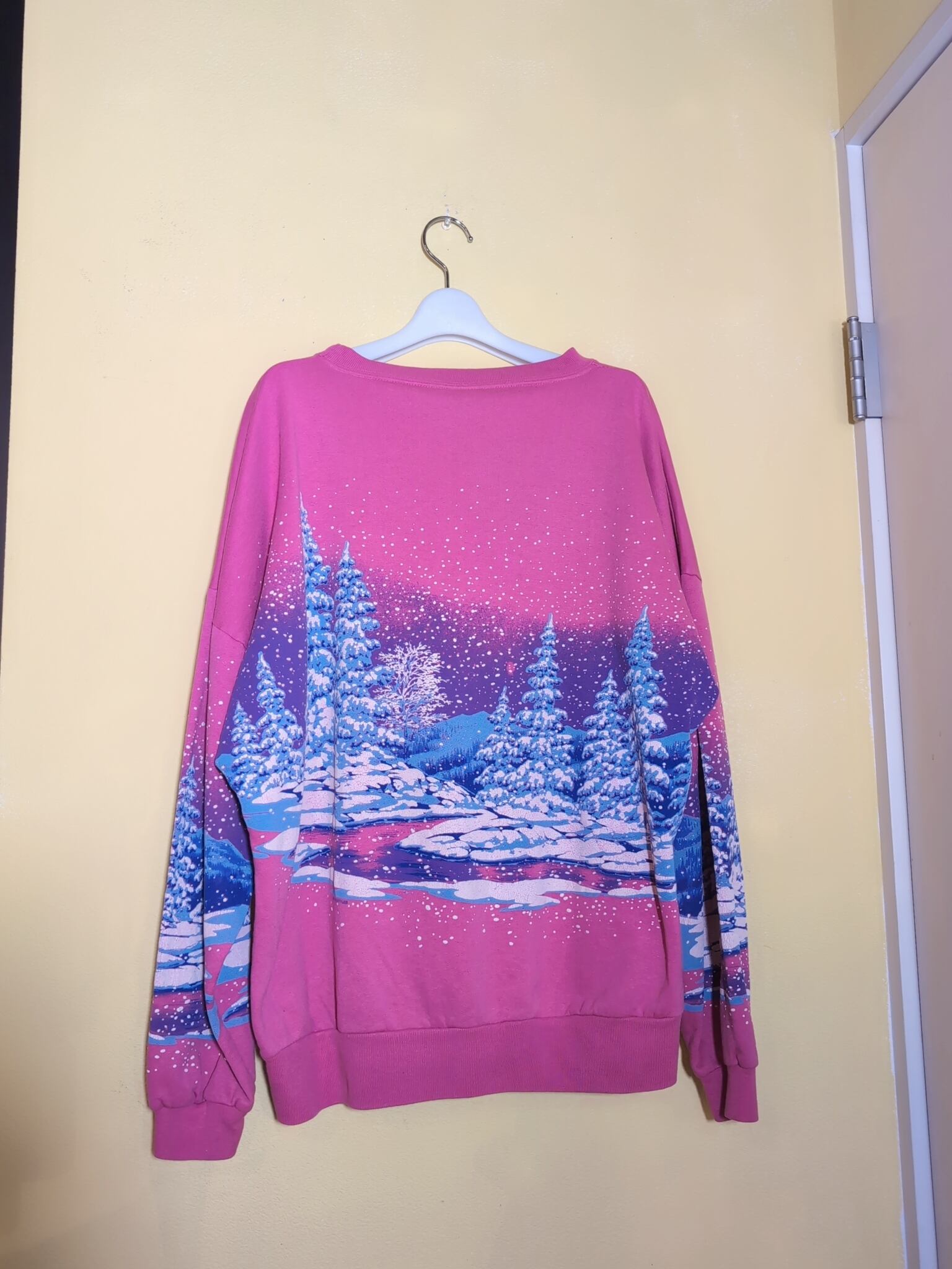 色味は、ピンク×ホワイト×パープル×ブルー。このプリントのスウェット好きなんですよね。もふもふとした冬の雪景色が全体を大胆に覆う総柄。カラーリングの華やかさが魅力的。