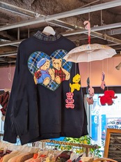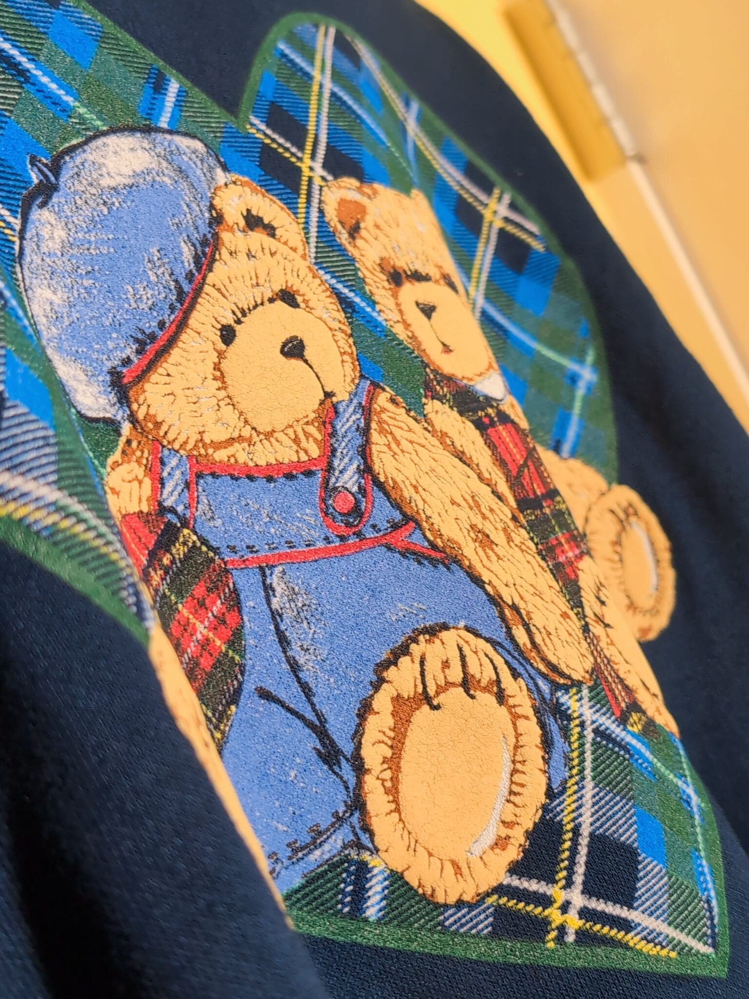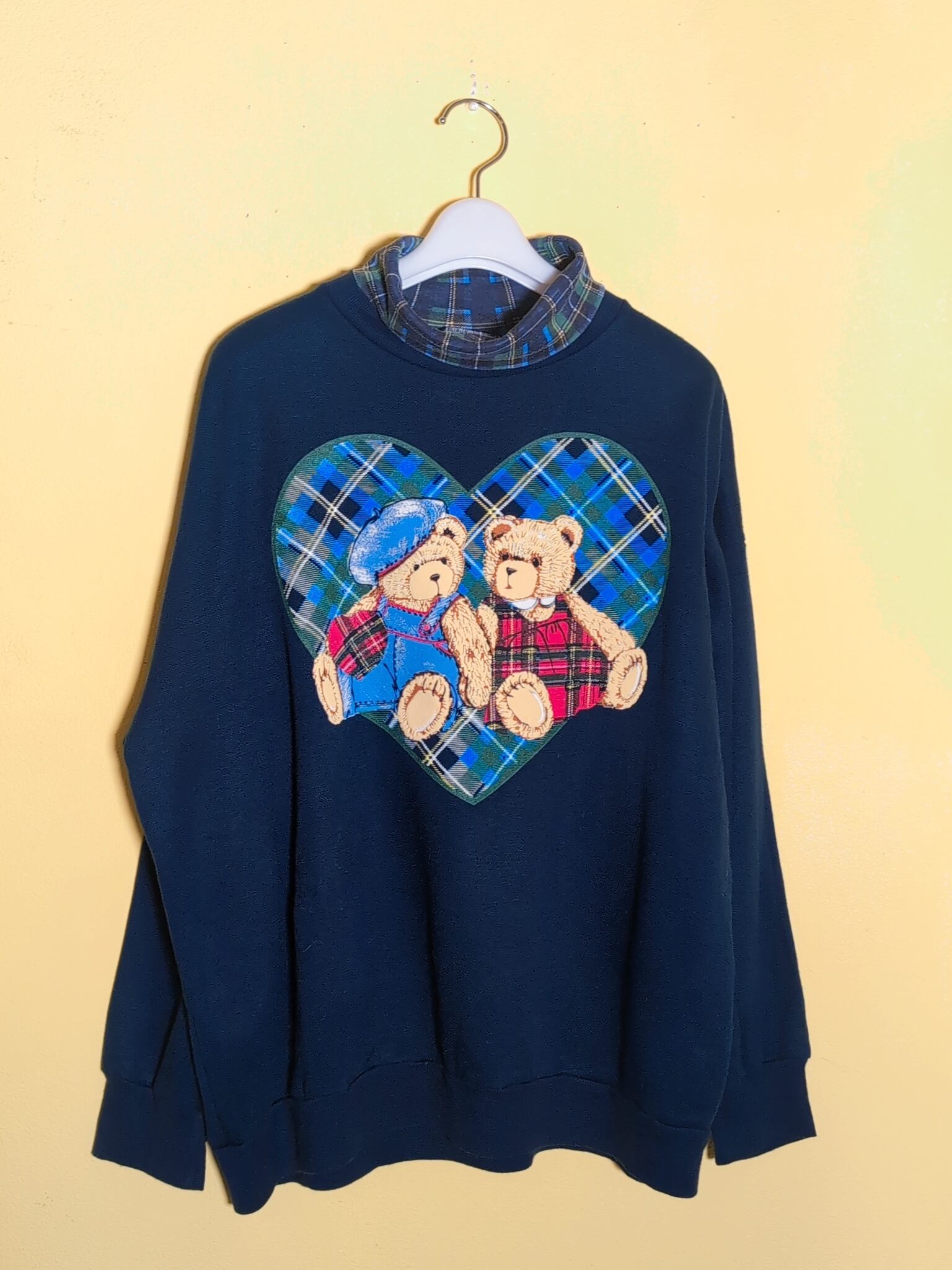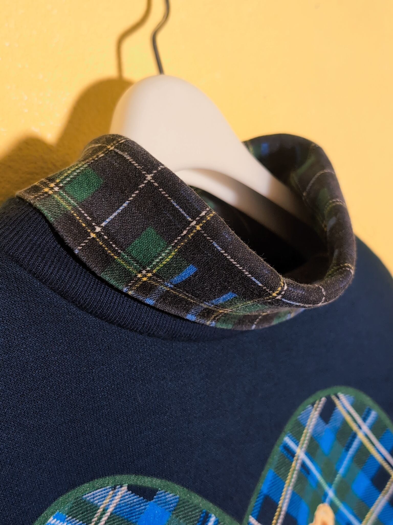 ハートを背面に寄り添うくまちゃん。もふもふとしたくまちゃんのプリントがかわいらしく、同じ柄のチェックの襟がレイヤード風にあしらわれているのも遊び心あり♡