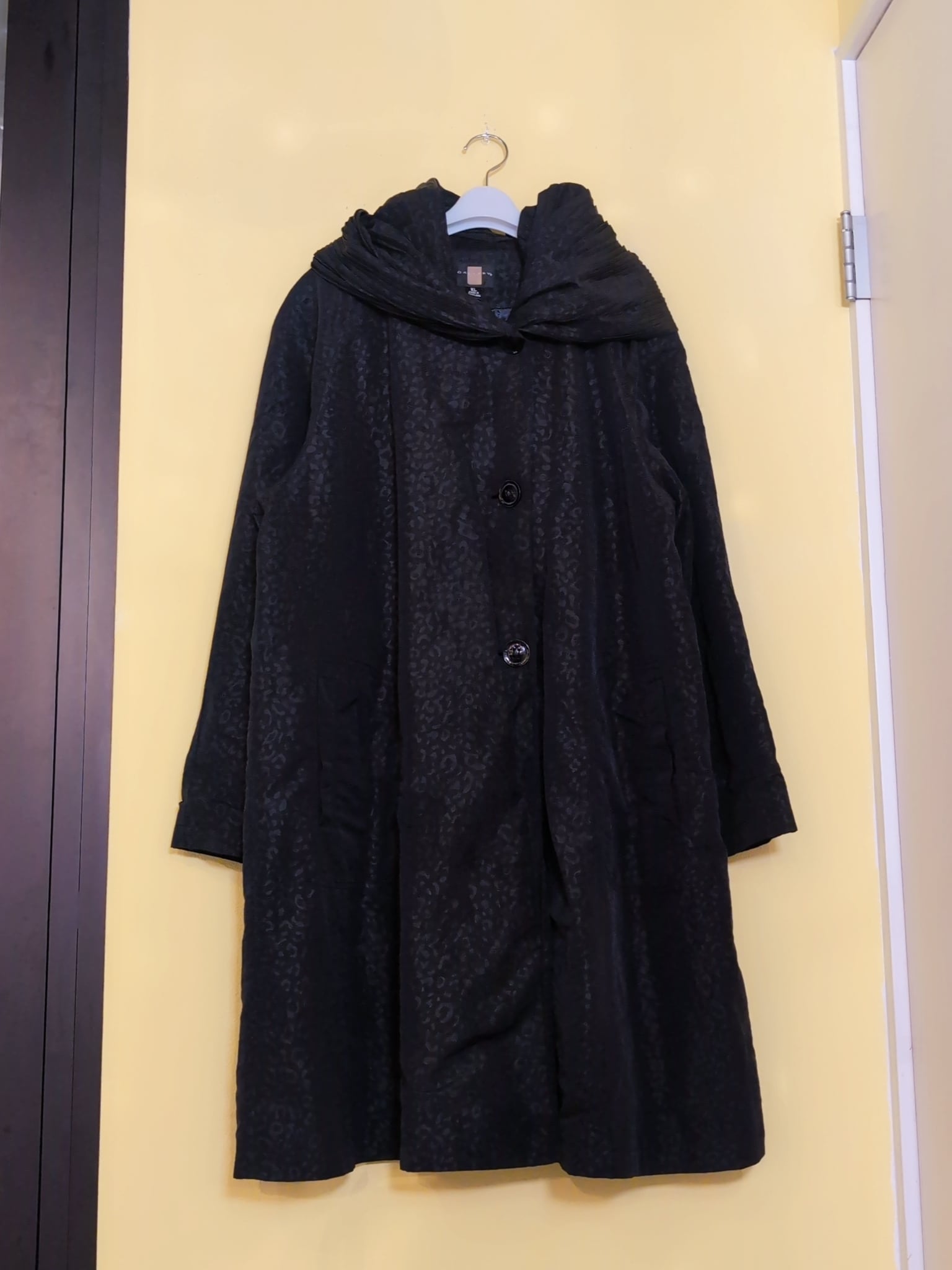 ナイロンのつやつやとした光沢感と、じっくり見たらわかる豹柄。ハイネック×ドレープのフードがいいボリューム感や、ちょっとズレたボタンなどちょいとエッヂの効いたディティールが魅力的。