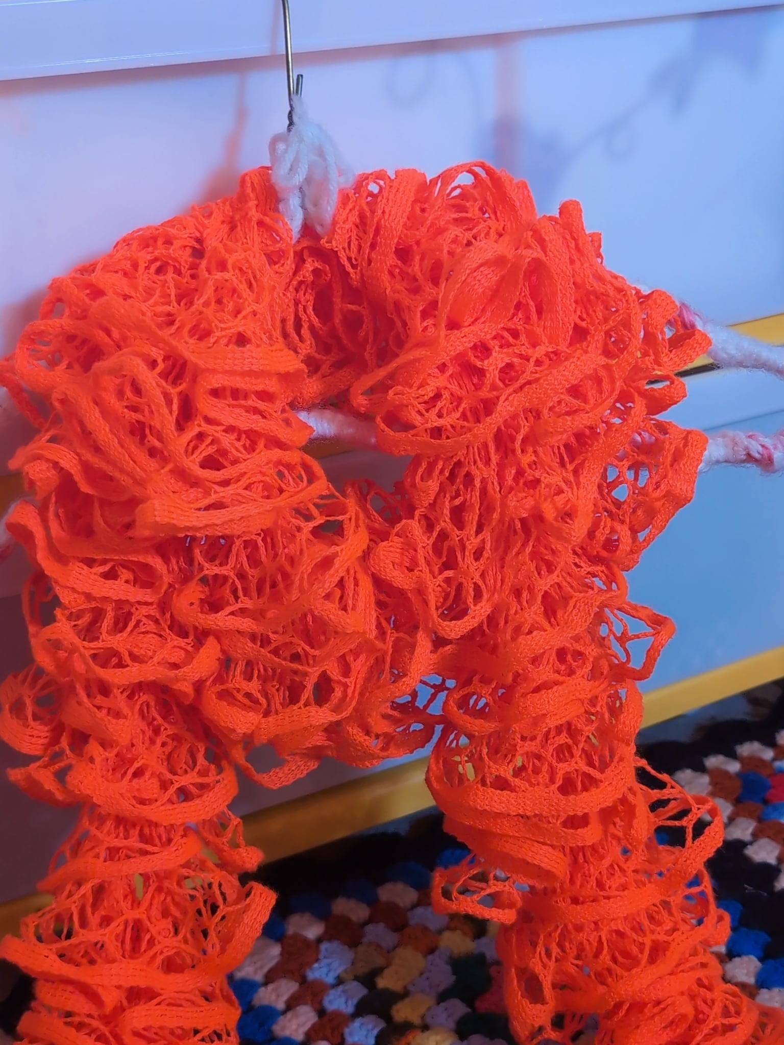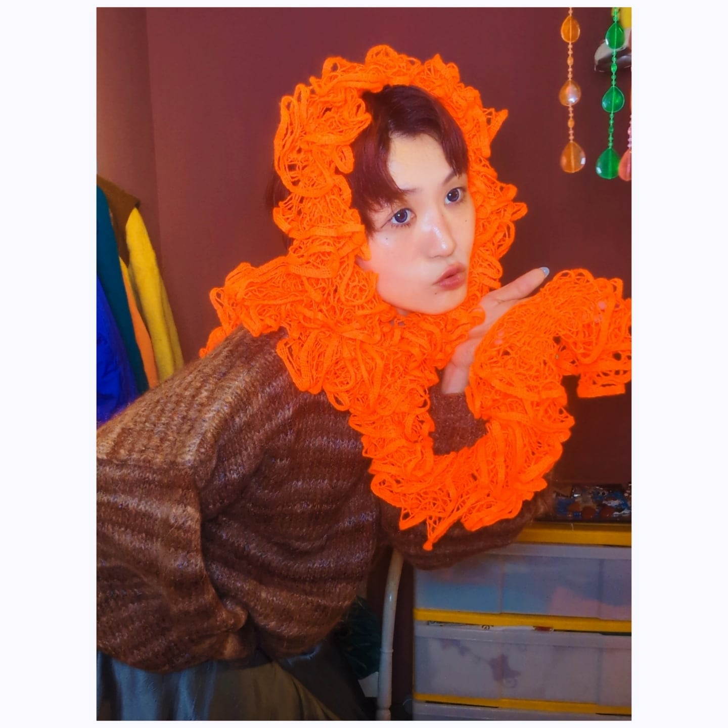 色味は、オレンジ。プリンプリンのふりるのぼりゅーむがとってもかわいいです。また、とても鮮やかなカラーにも目を引かれます。ぐるっと巻いて付け襟感覚でも、ズルズルと垂らしてアクセントにも◎