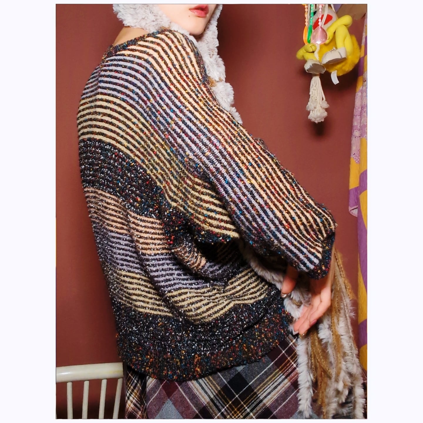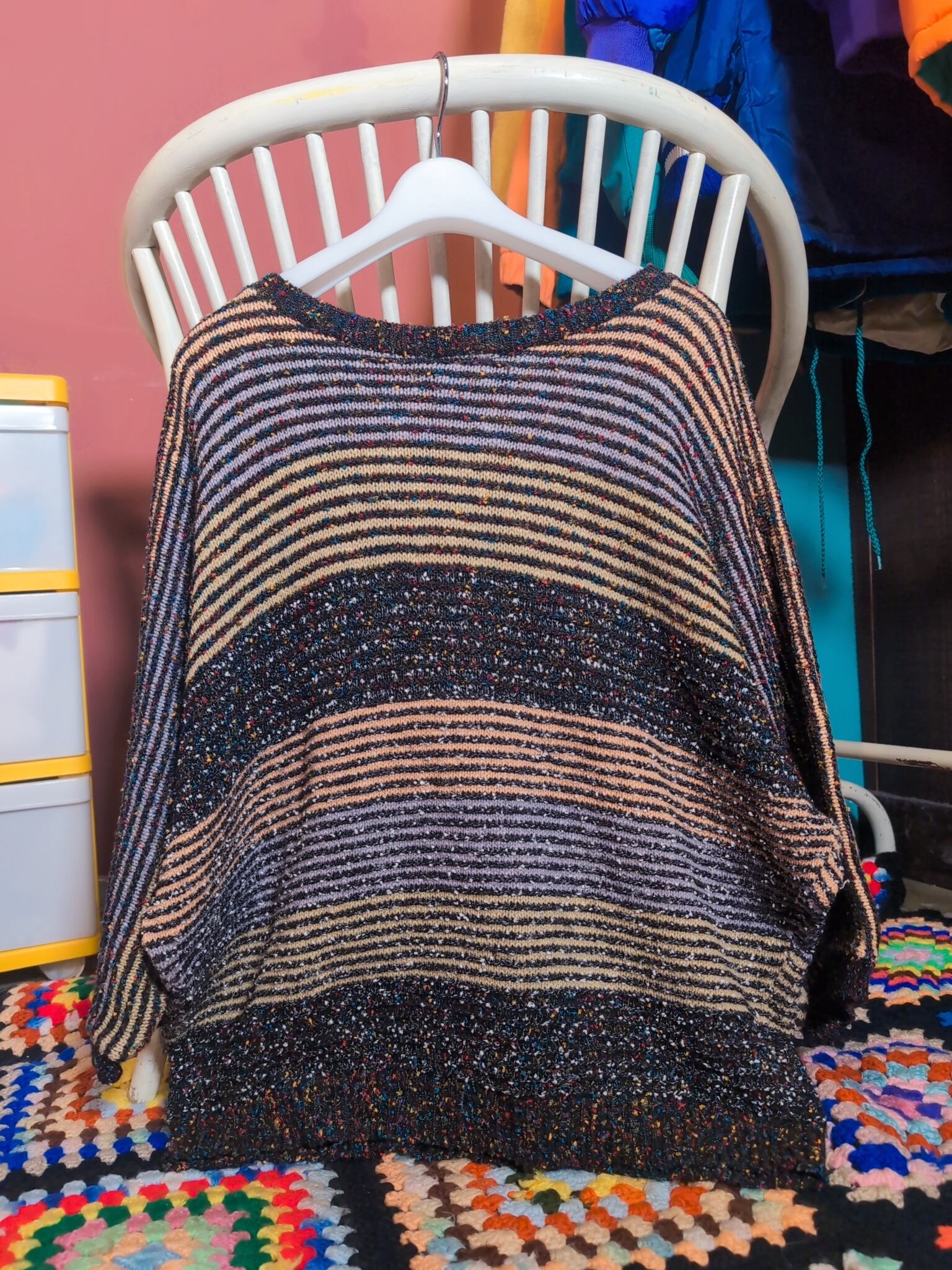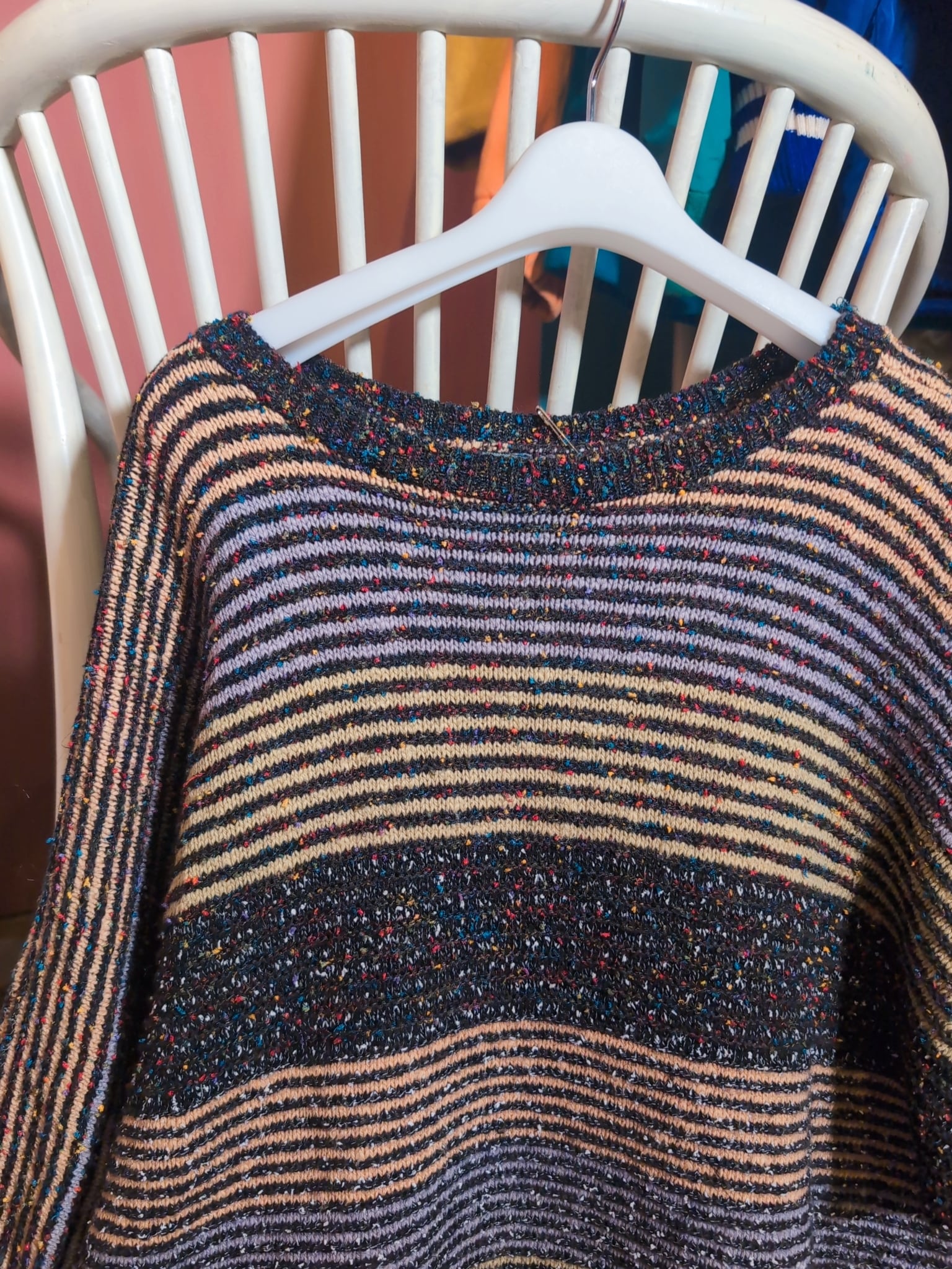 細いピッチのボーダーにカラフルなネップ野手氏スタイル。落ち着きあるカラーリングながら遊び心も感じるデザイン。ドルマンスリーブと襟元のあきで、ゆったりとした雰囲気なのも◎