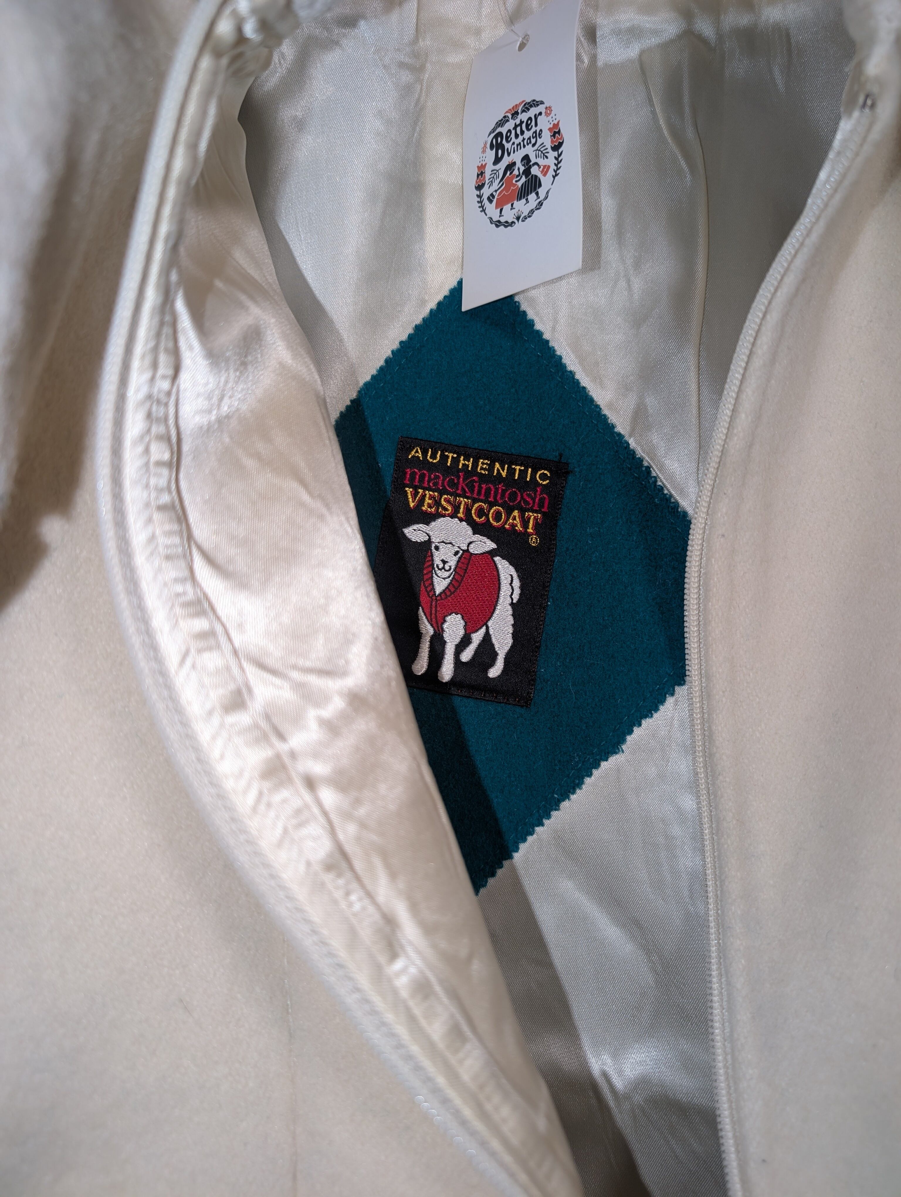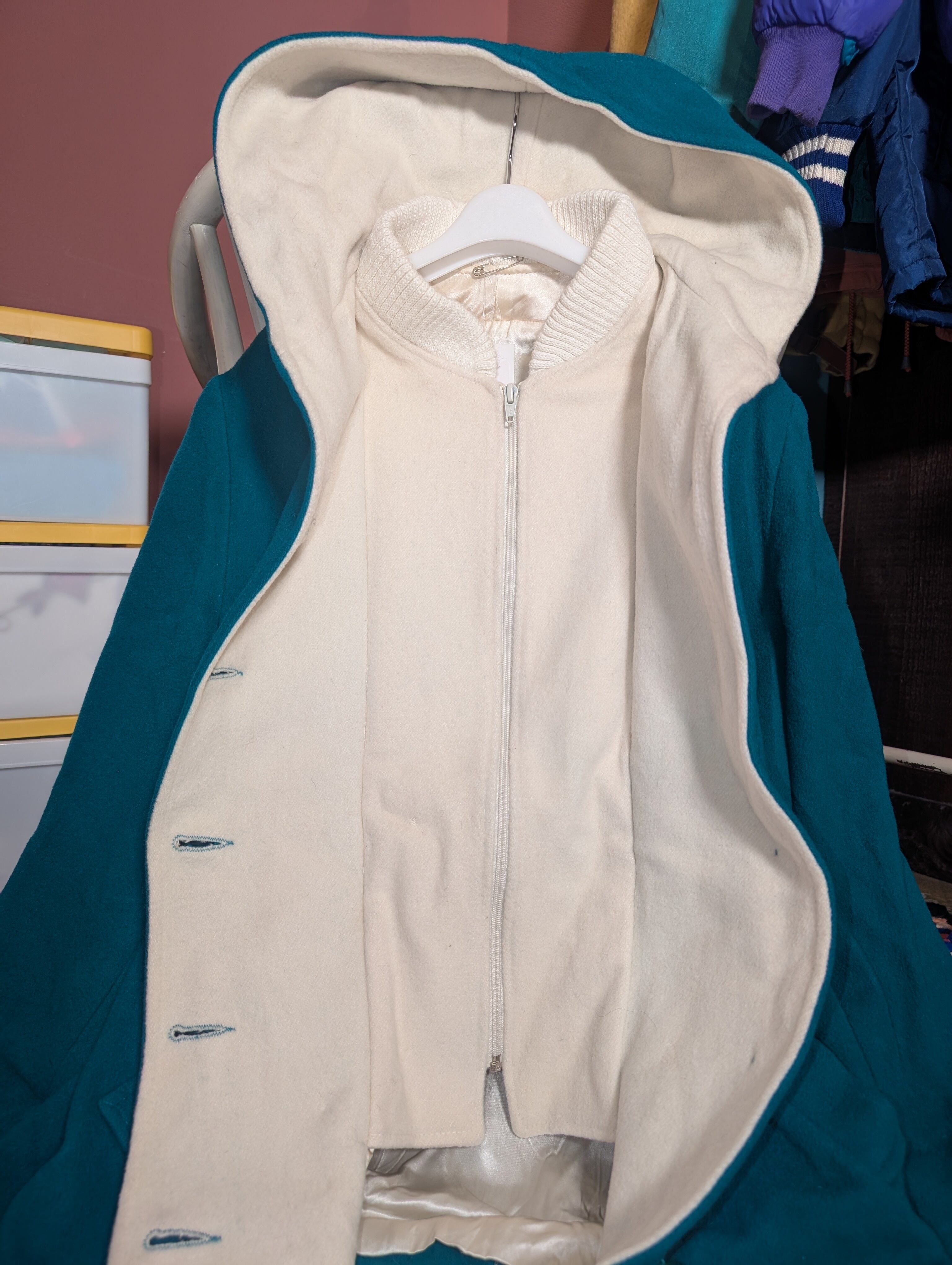 クリアで鮮やかなグリーンが◎大きなフード、フロントのボタンを外すとジップの合わせでレイヤードしているようなユニークなデザイン。