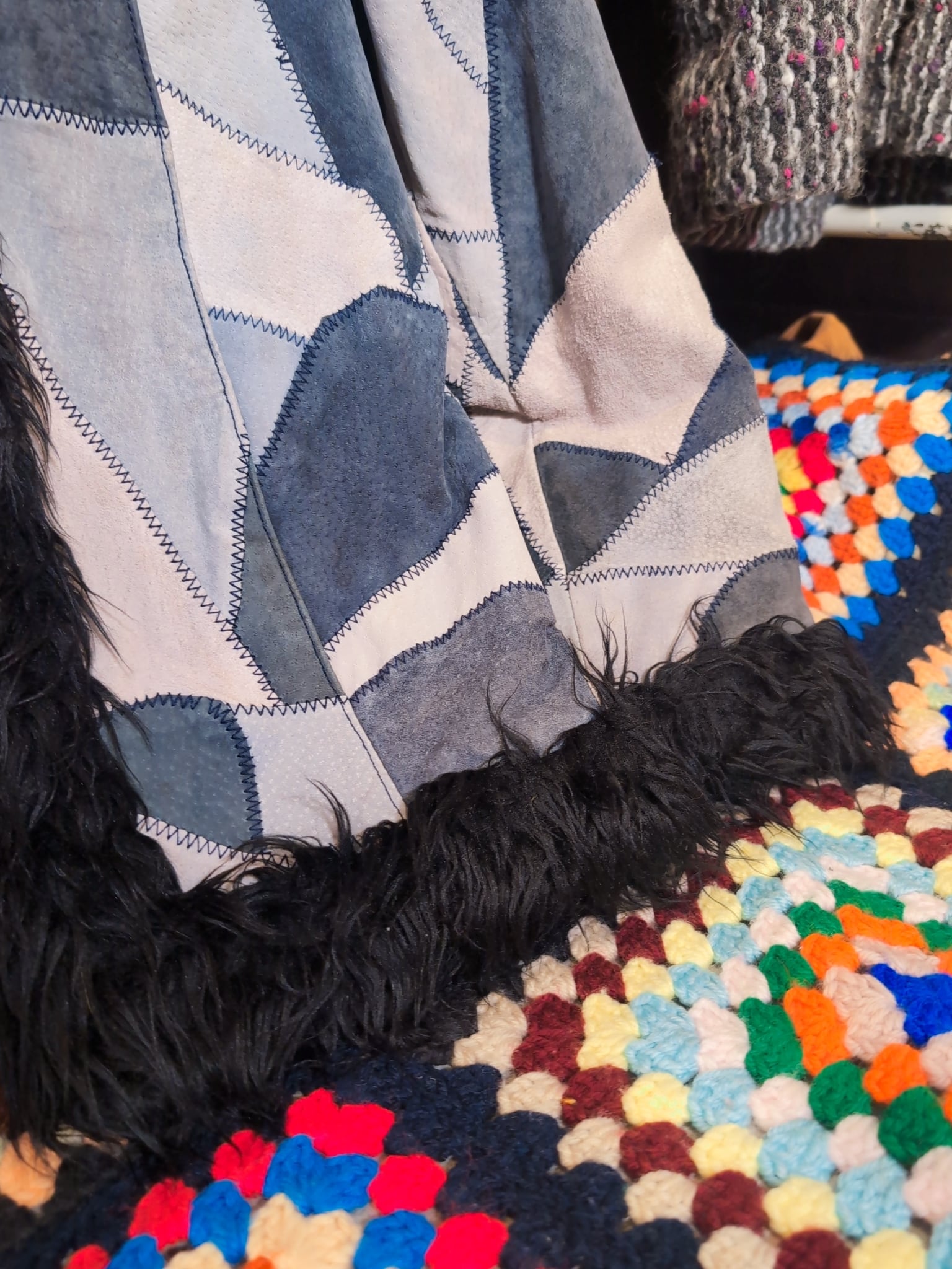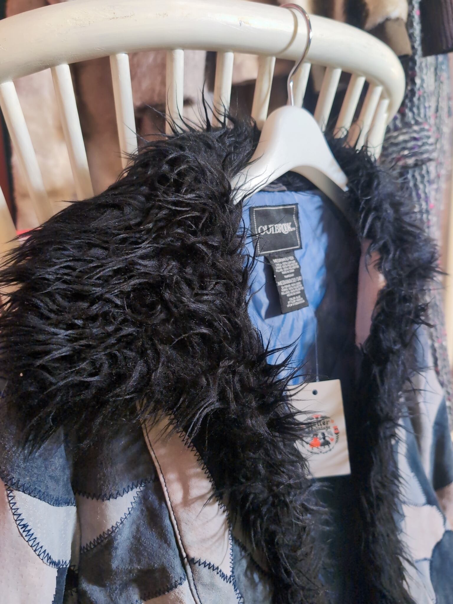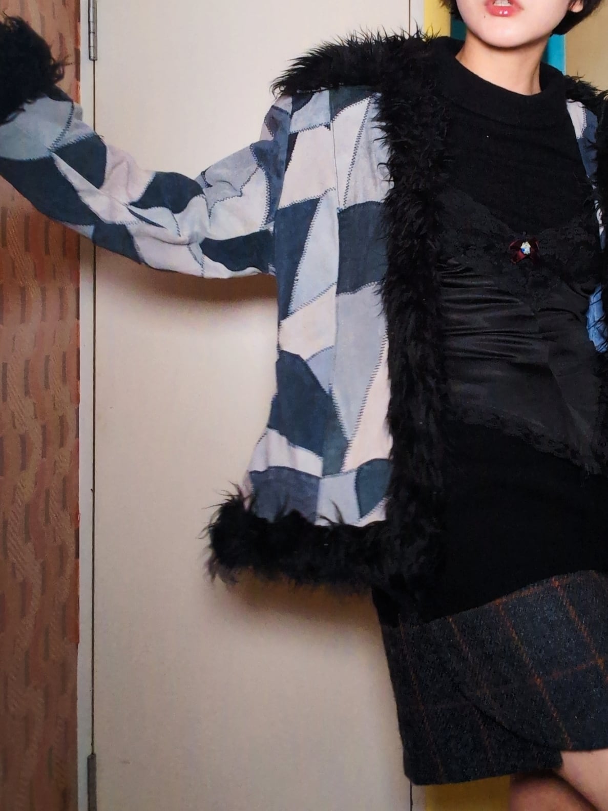 ランダムなかたちのレザーのツギハギがとっても可愛い一着です。アウトラインにはフェイクファーでゴージャス、若干シェイプしたラインもレディな雰囲気で素敵。