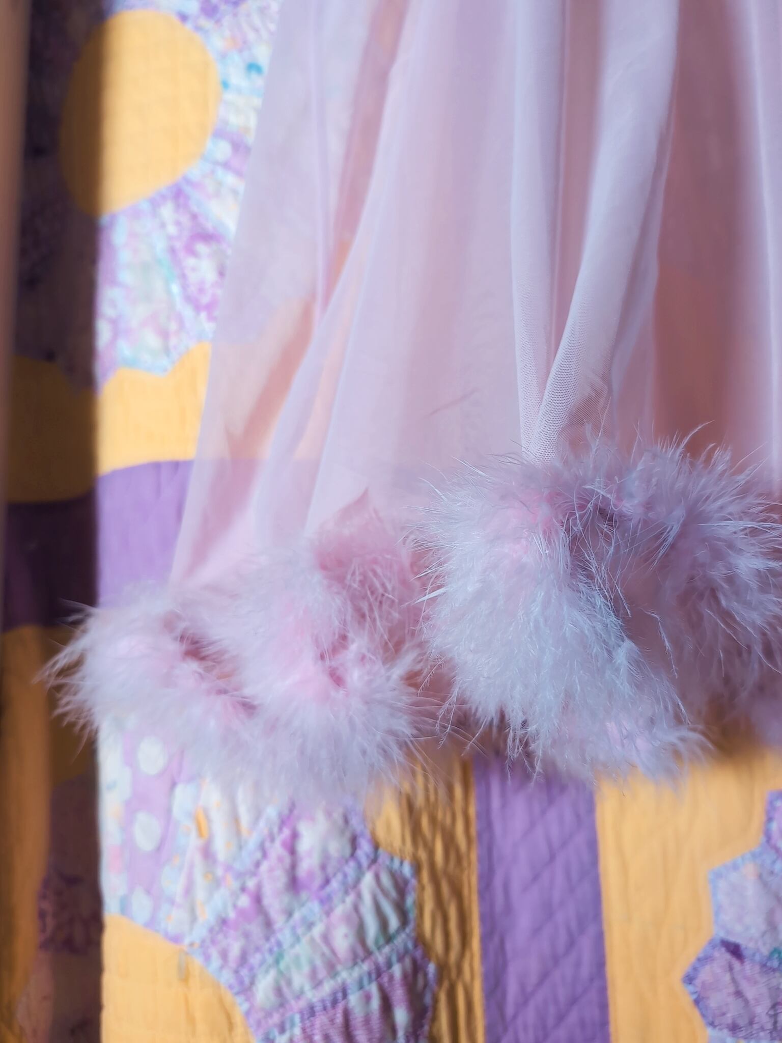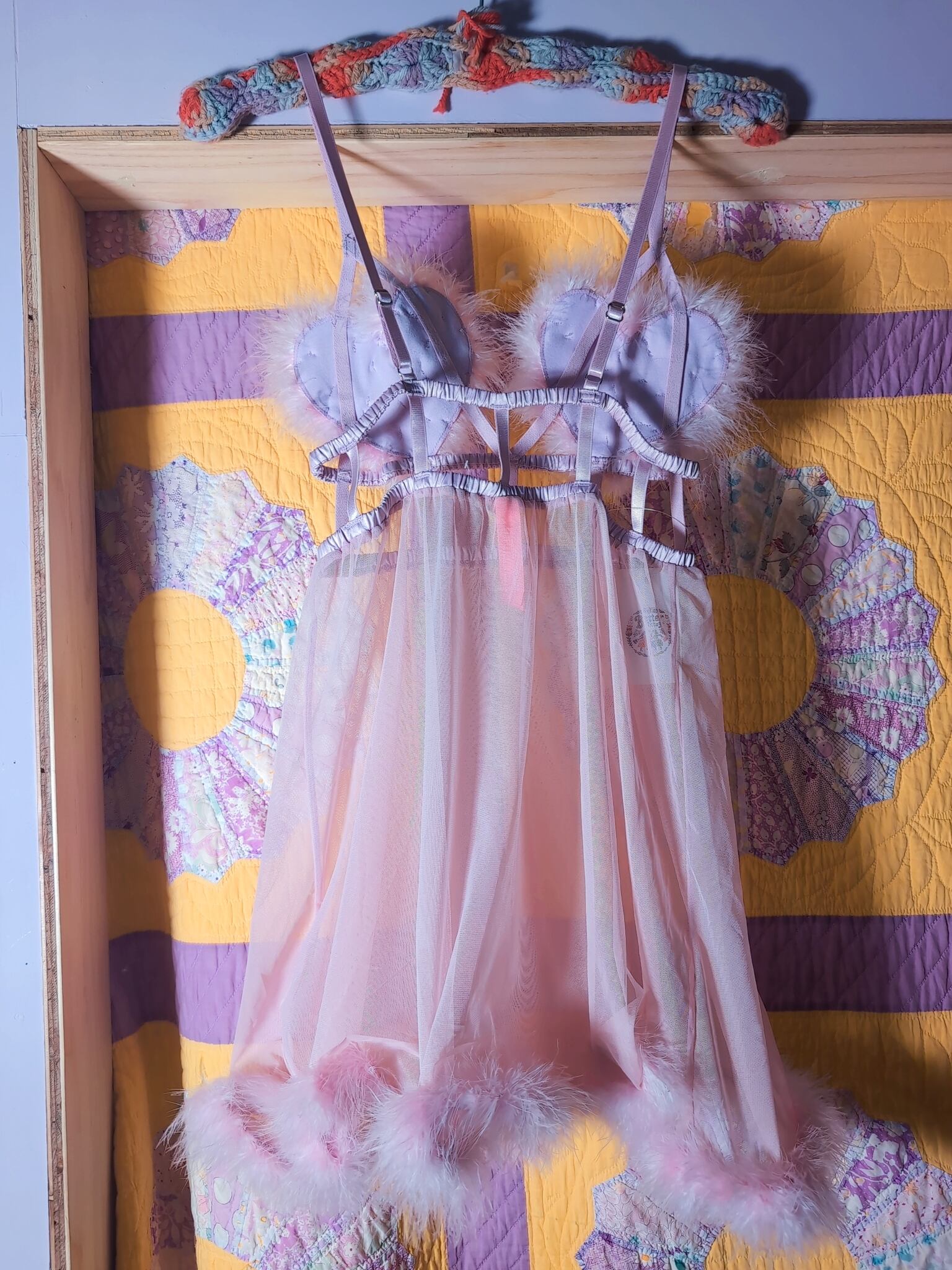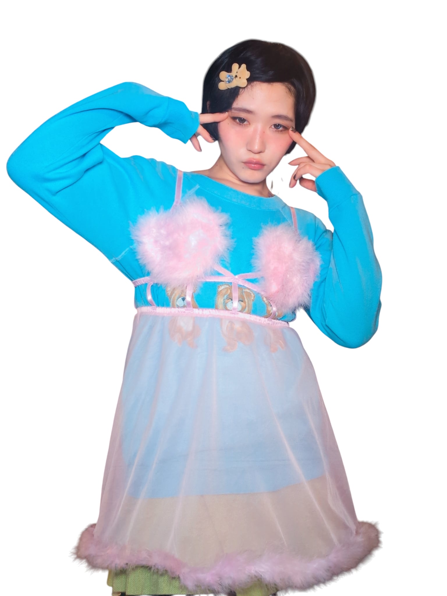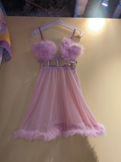フェザー、みぞおちのデザイン、何よりもハートのモチーフってのが最高に可愛いです。ラブリーなカラーリング×シアー素材にもキュン。