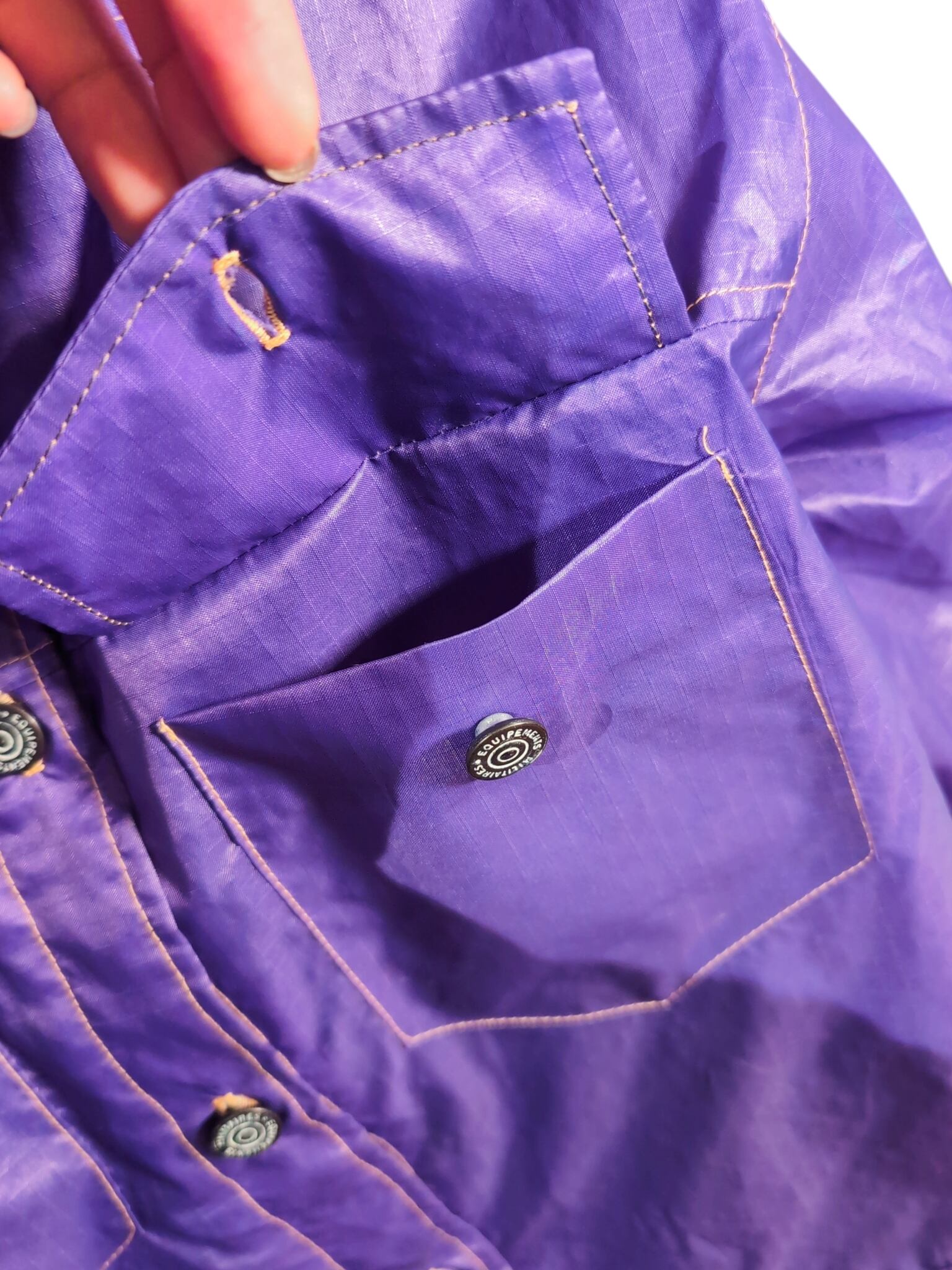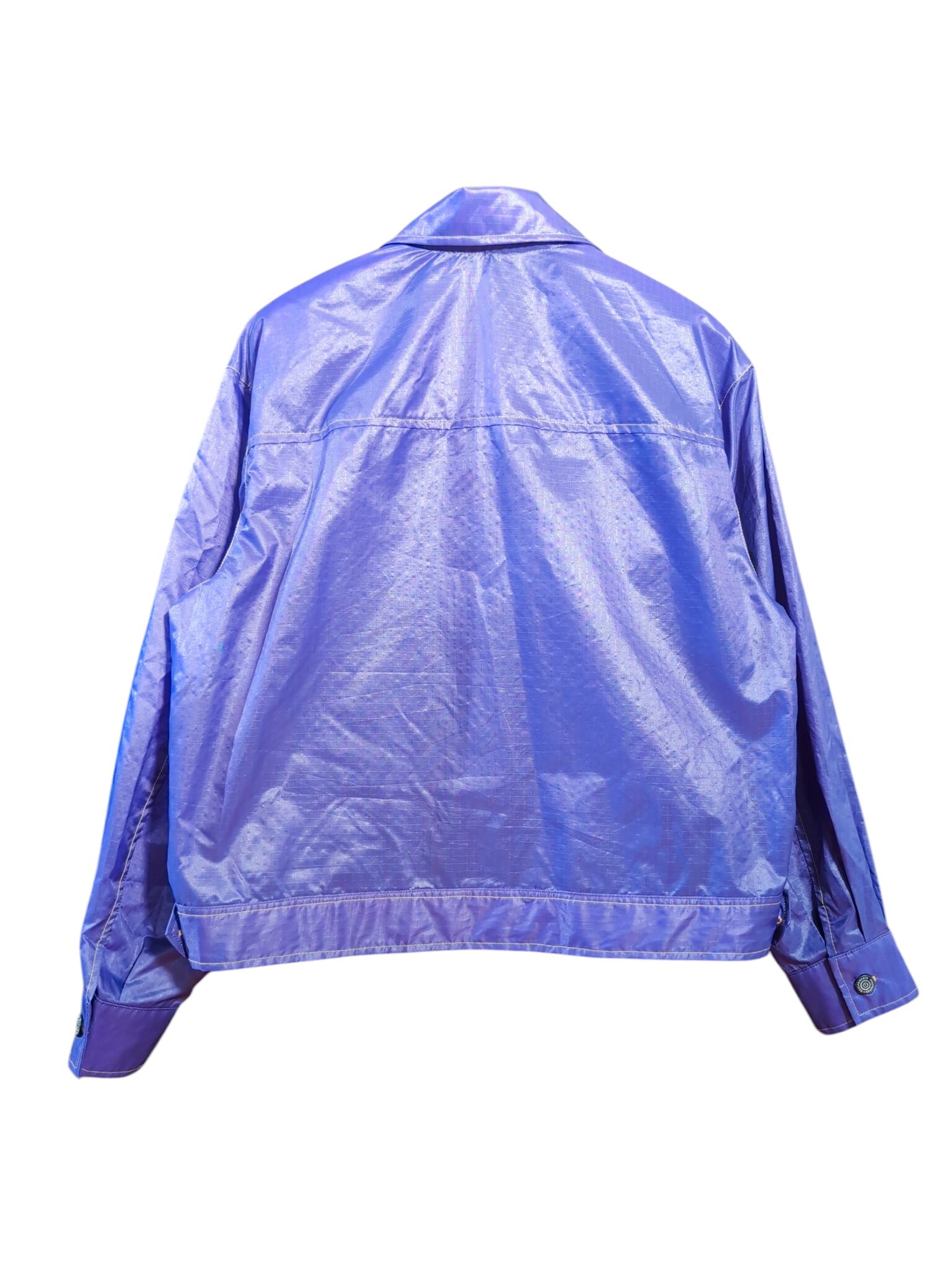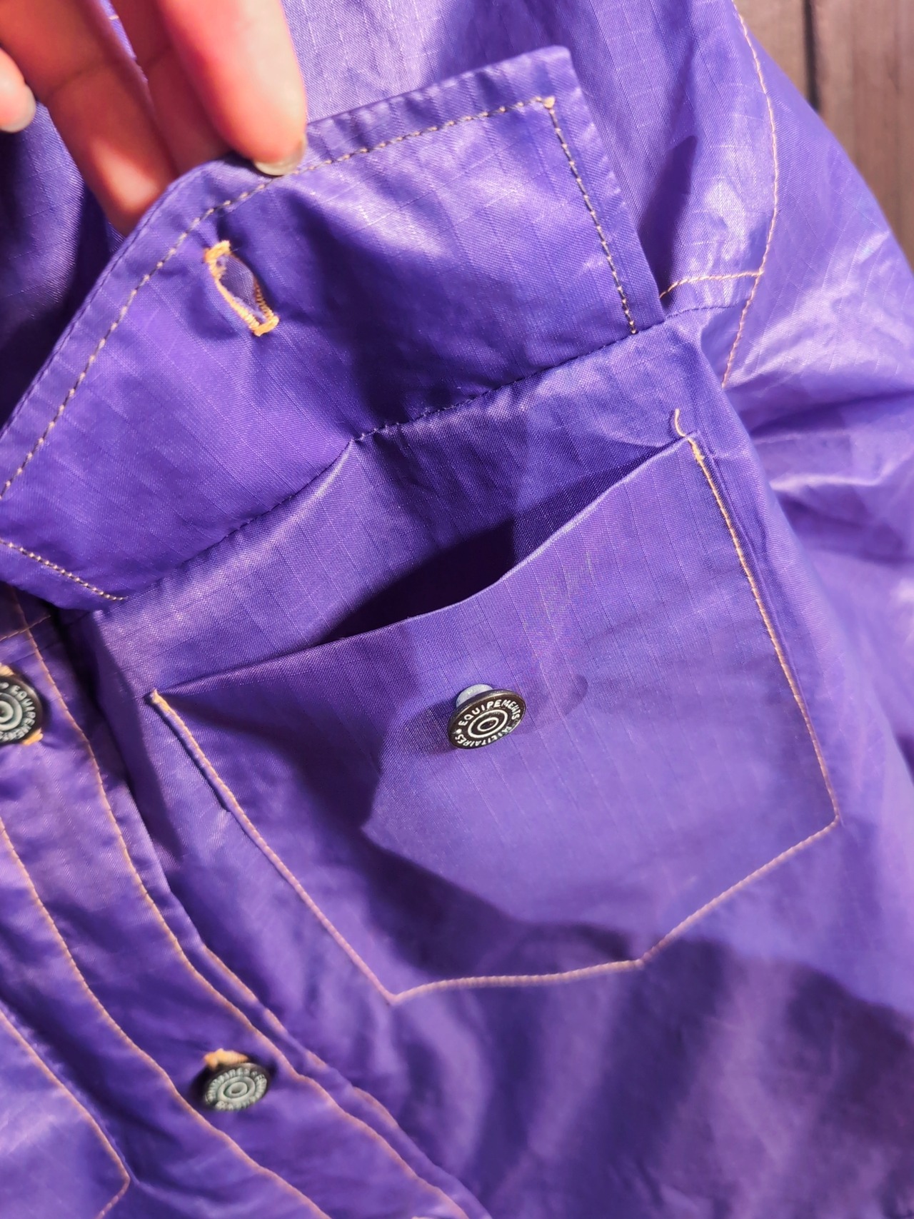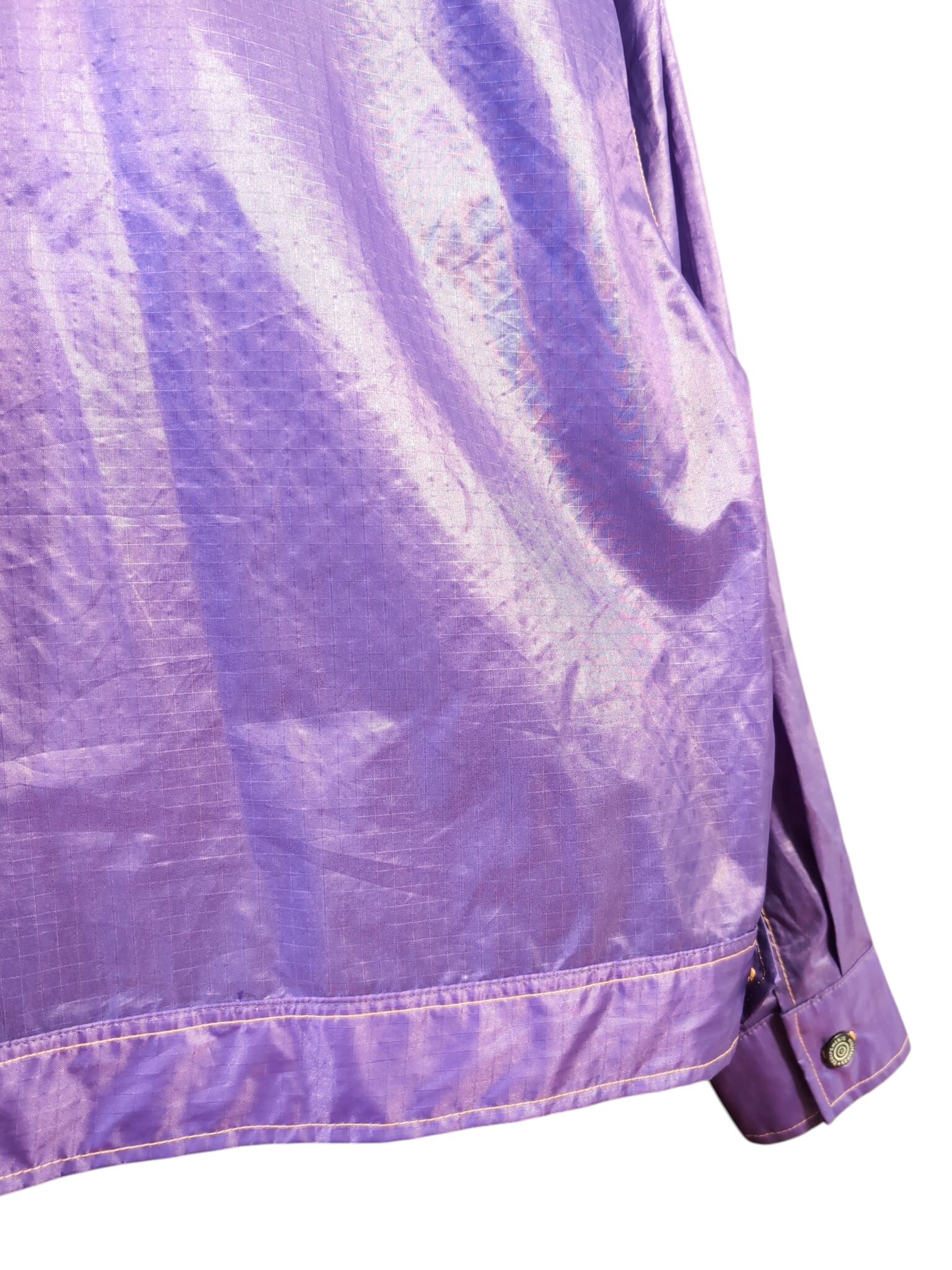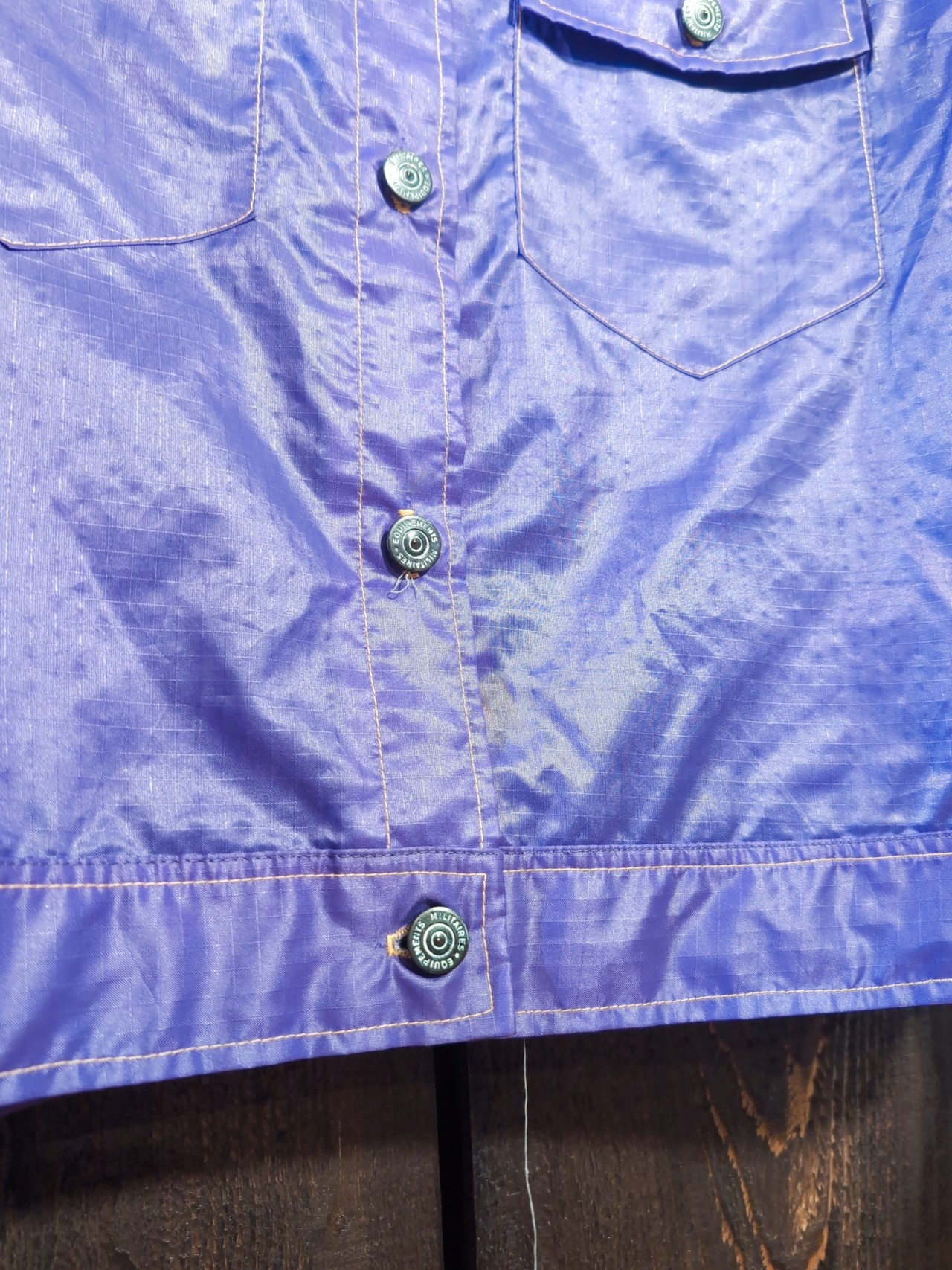 品質表示は無しですが、ナイロンのような軽い素材感。で、ここまで上等なデザインというギャップが素晴らしい一着。紫に茶系のステッチも。