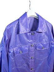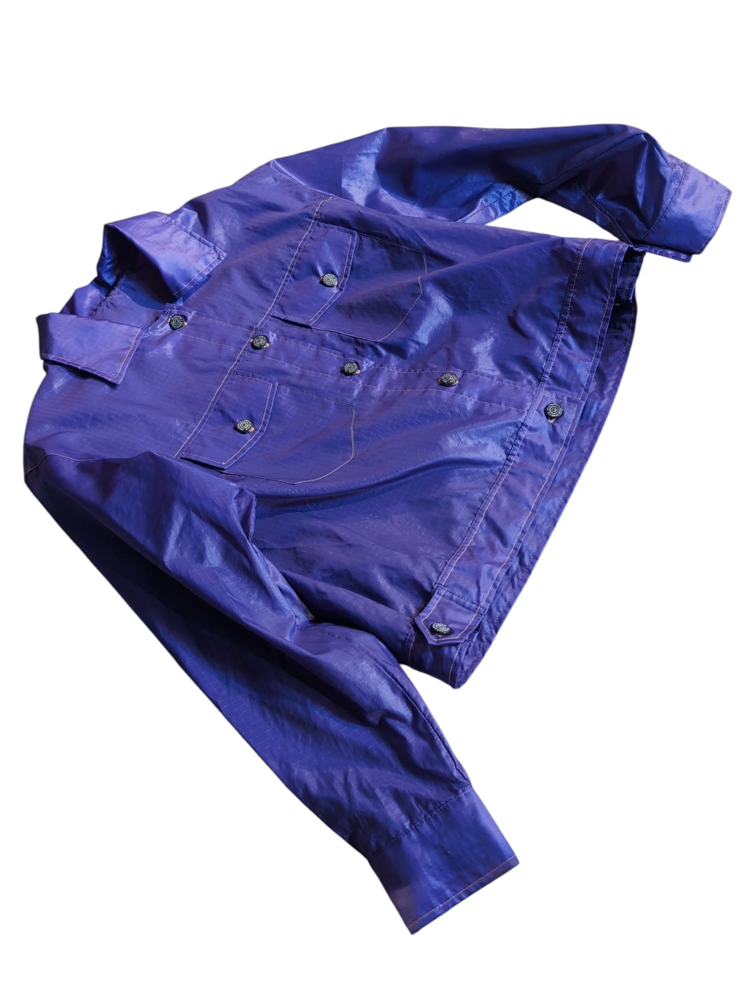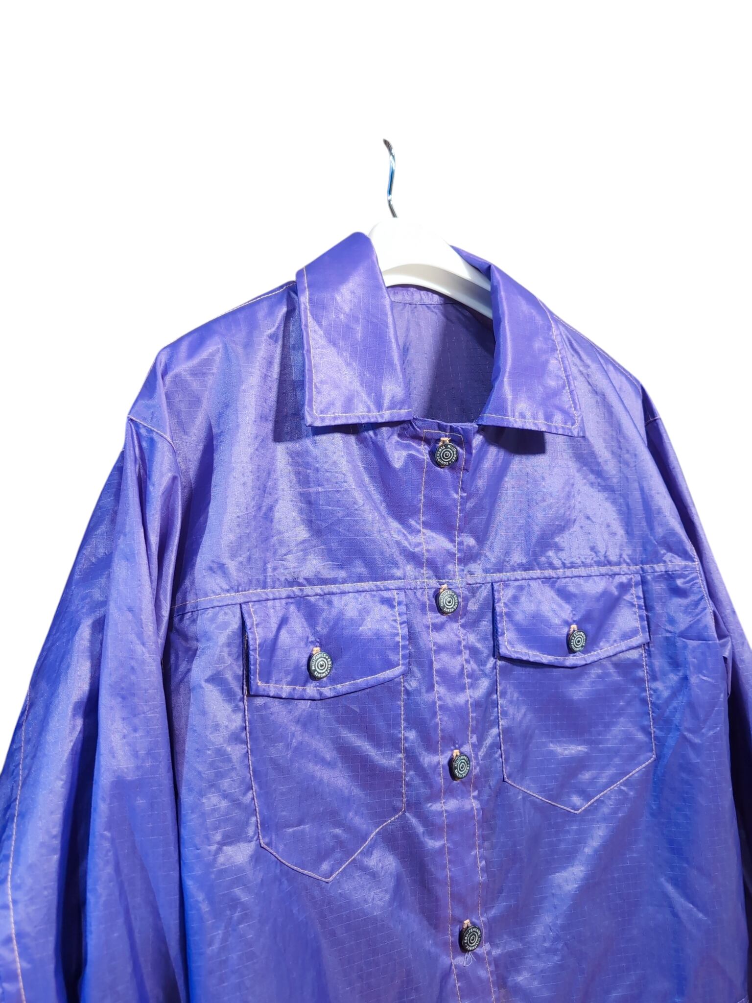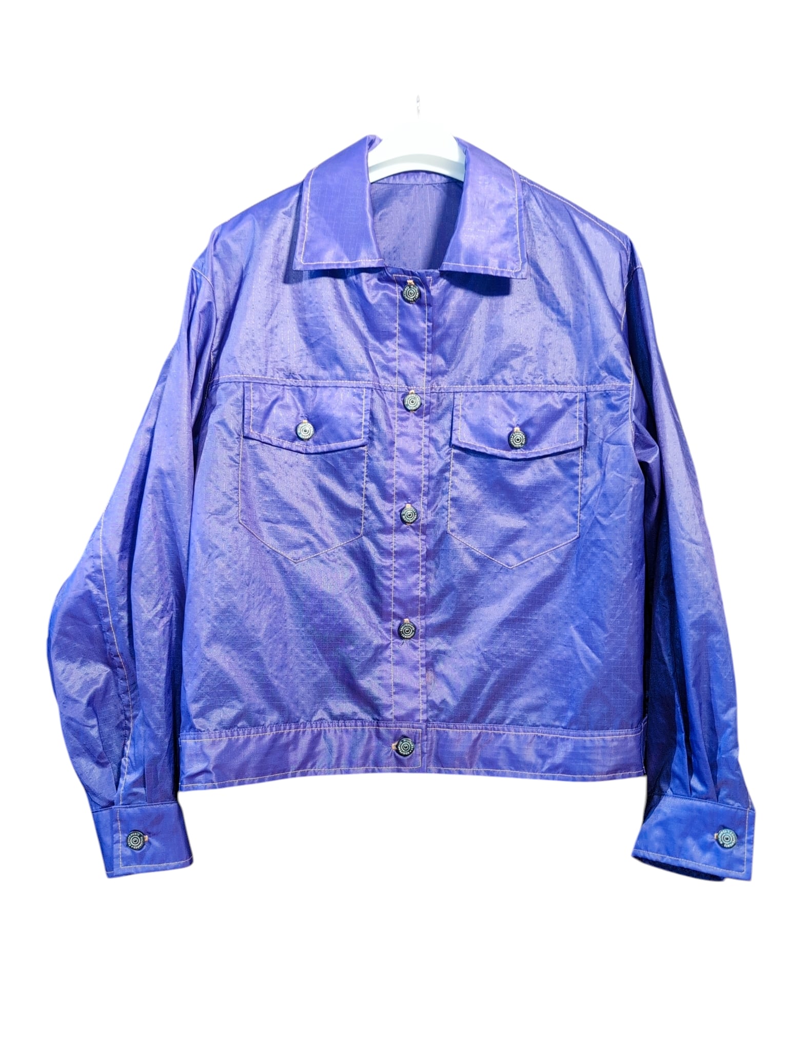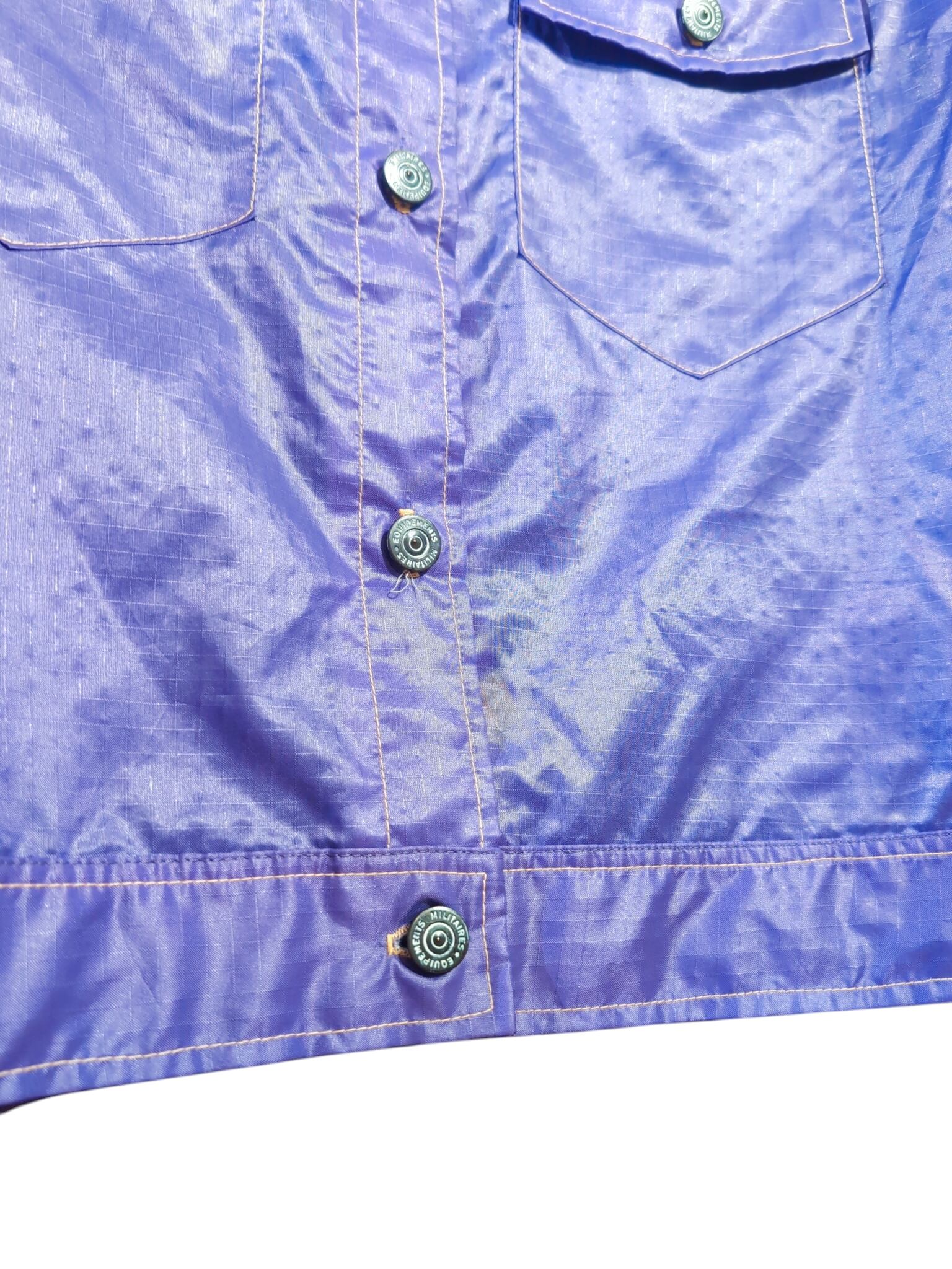 品質表示は無しですが、ナイロンのような軽い素材感。で、ここまで上等なデザインというギャップが素晴らしい一着。紫に茶系のステッチも。