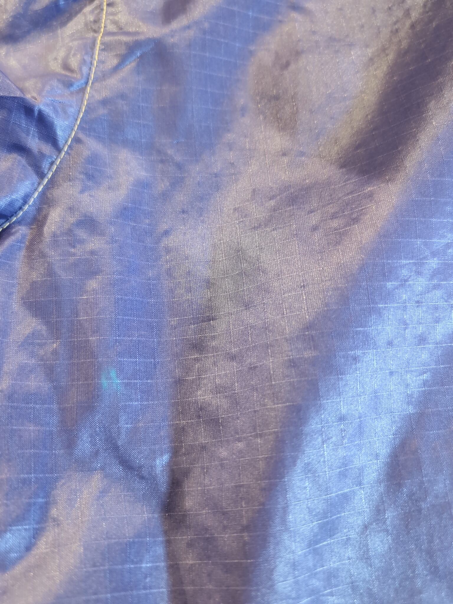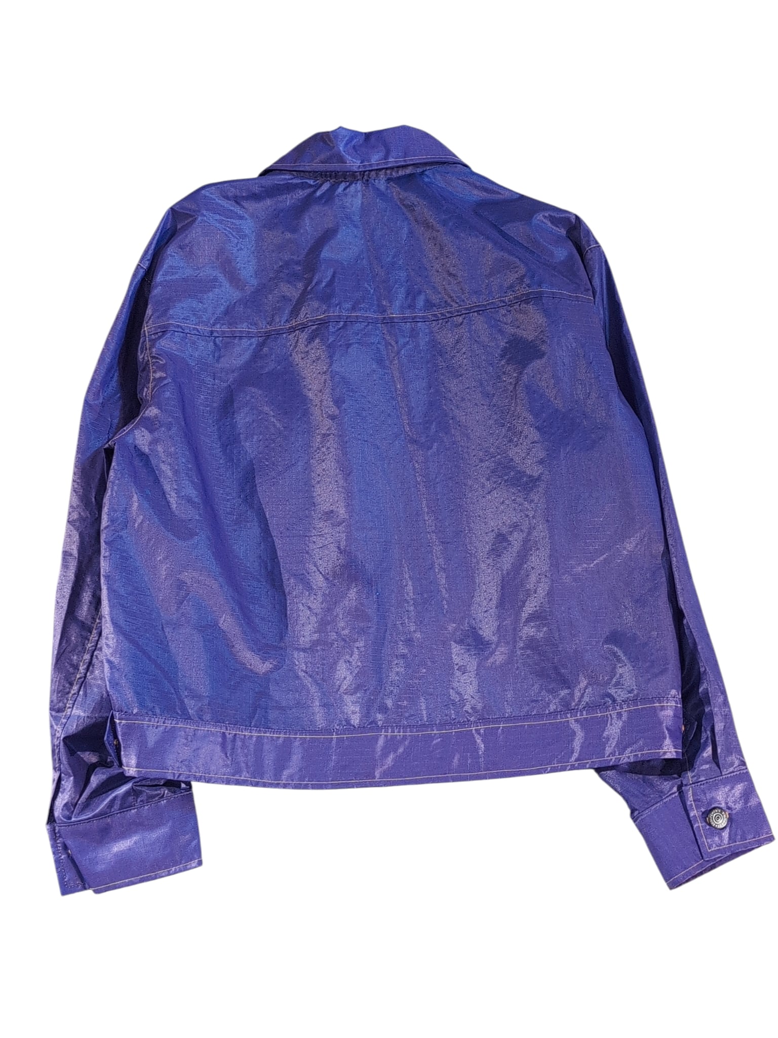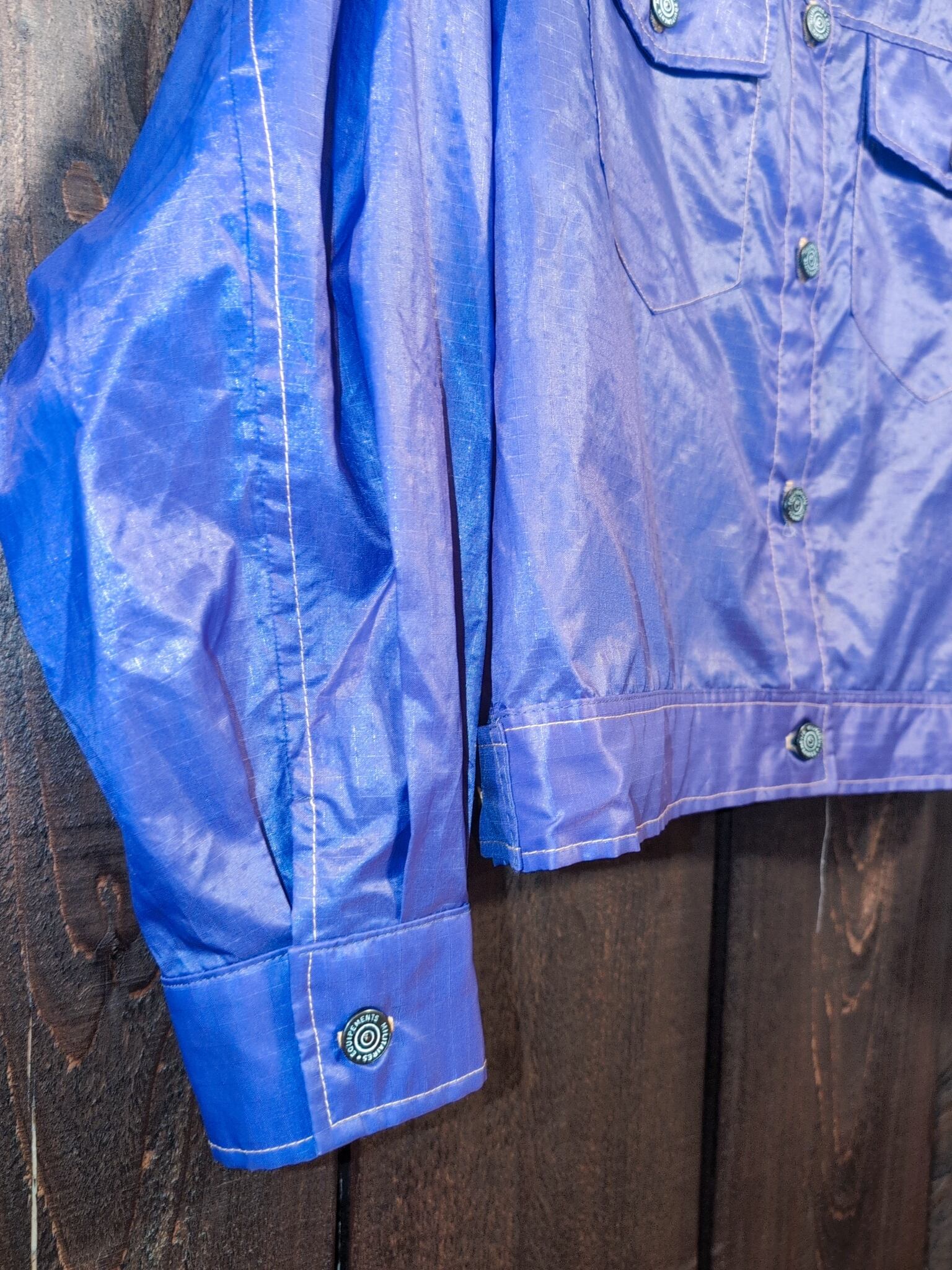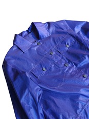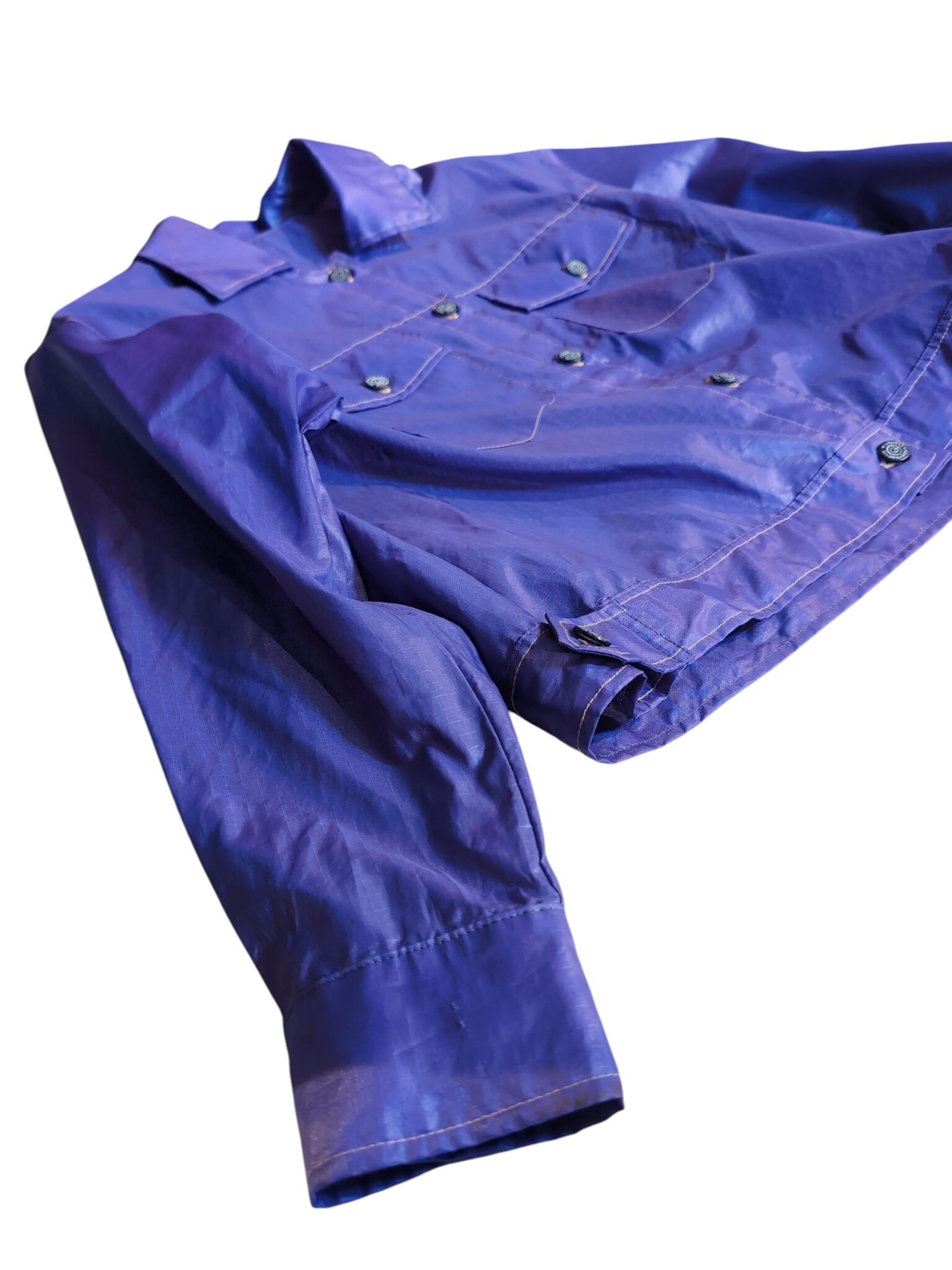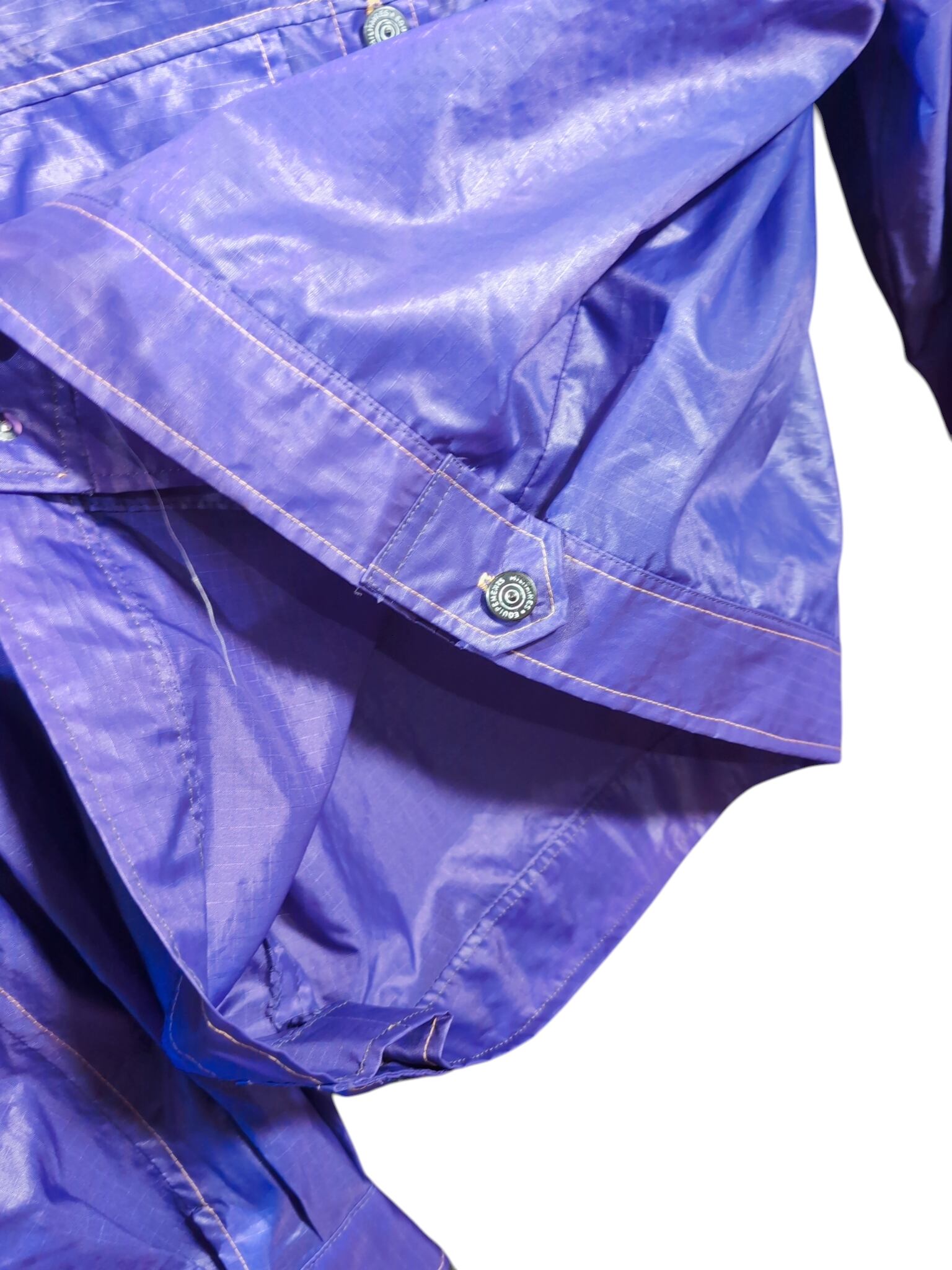 品質表示は無しですが、ナイロンのような軽い素材感。で、ここまで上等なデザインというギャップが素晴らしい一着。紫に茶系のステッチも。
