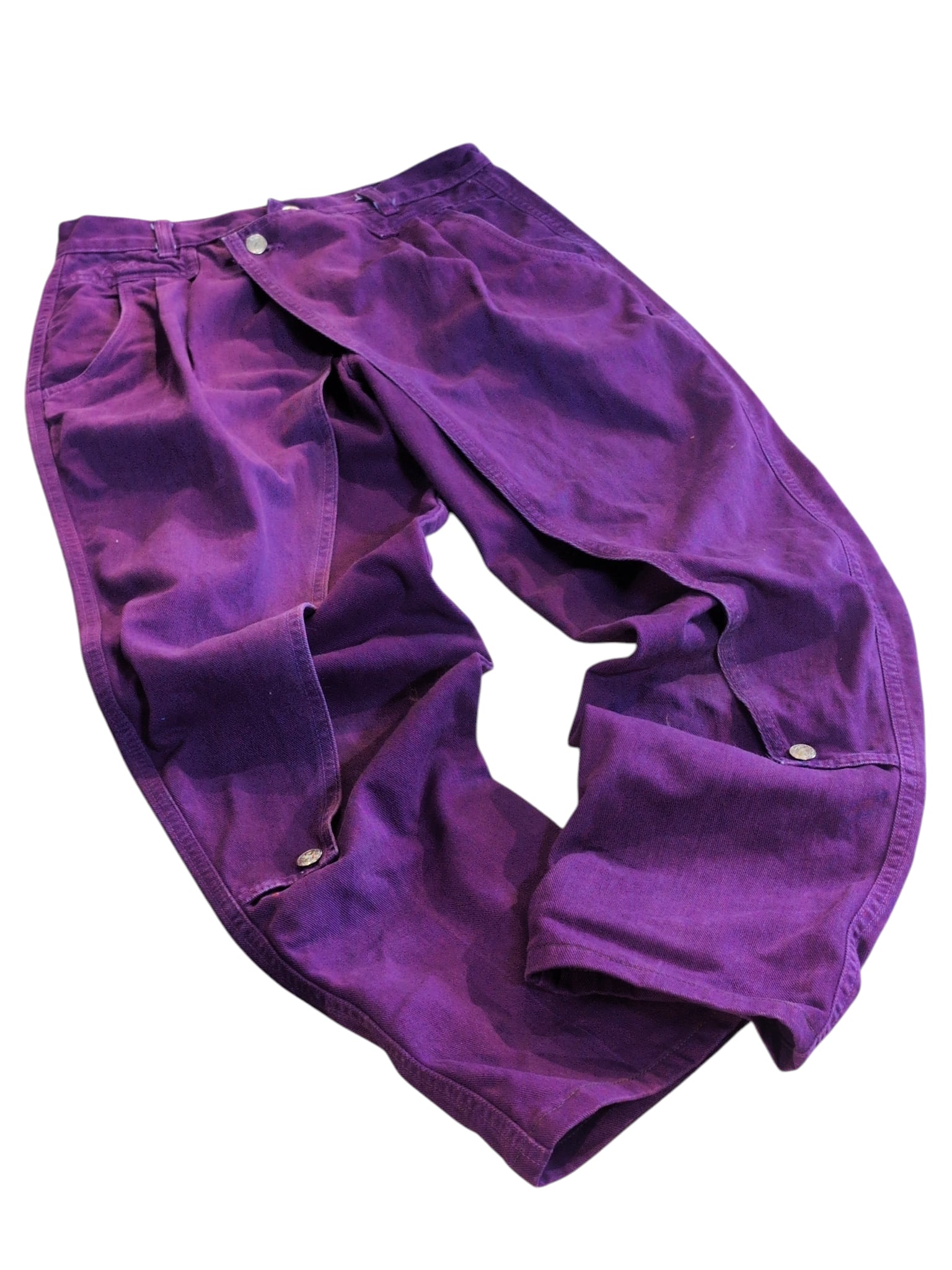 重ねてボタンや紐で留める独特のデザインが特徴的なラップパンツ。ボタン留めの非対称なフロントデザインと裾のディテールが目をひきます。