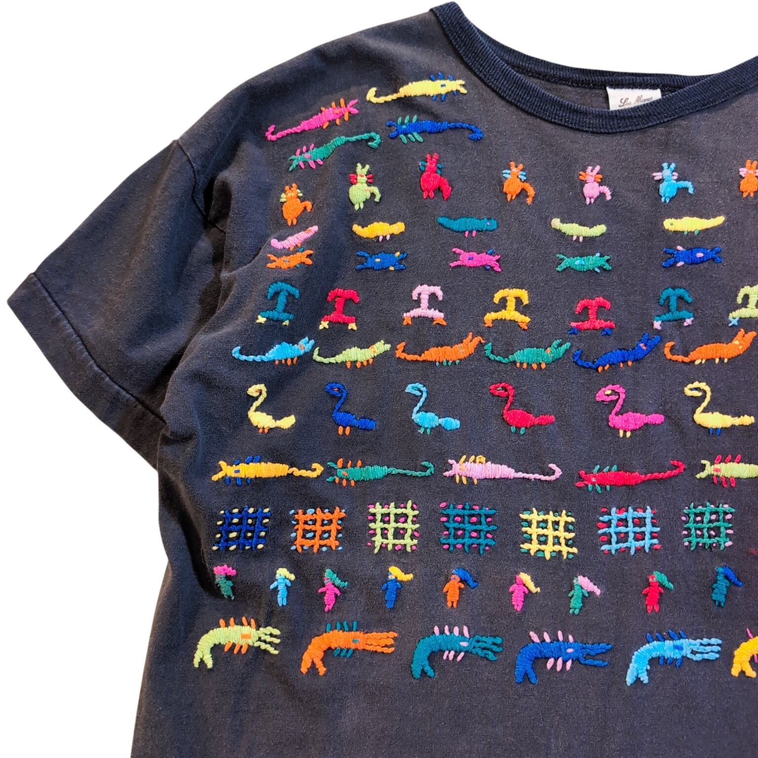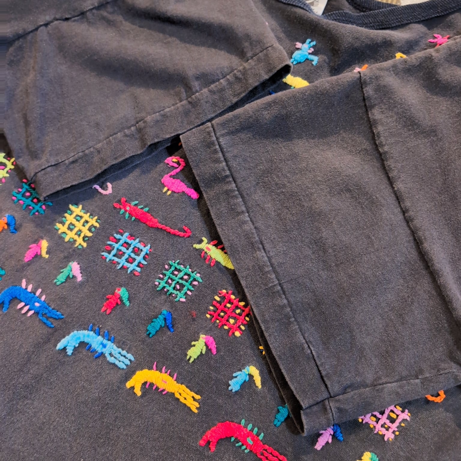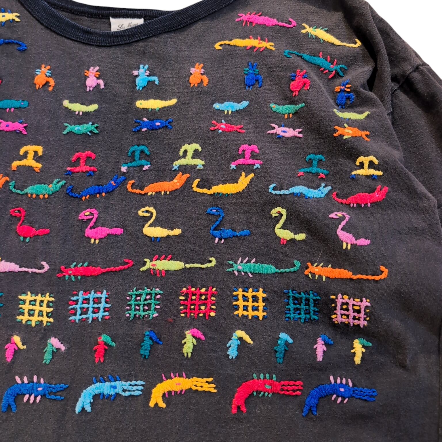 ガテマラ刺繍の不思議な生き物たちがたくさん施された一着。フェード感のある黒のボディに、カラフルな刺繍がとっても映えます。