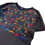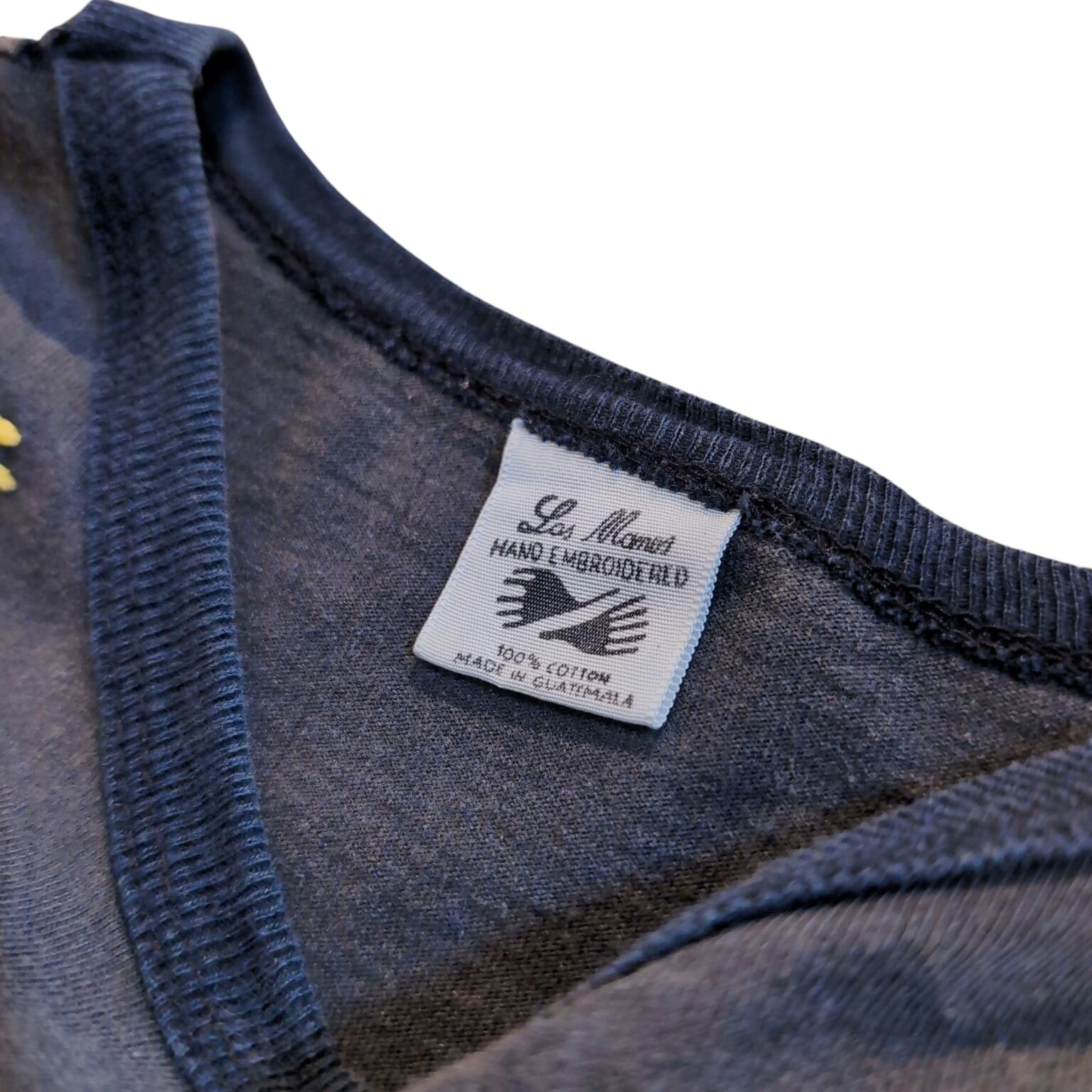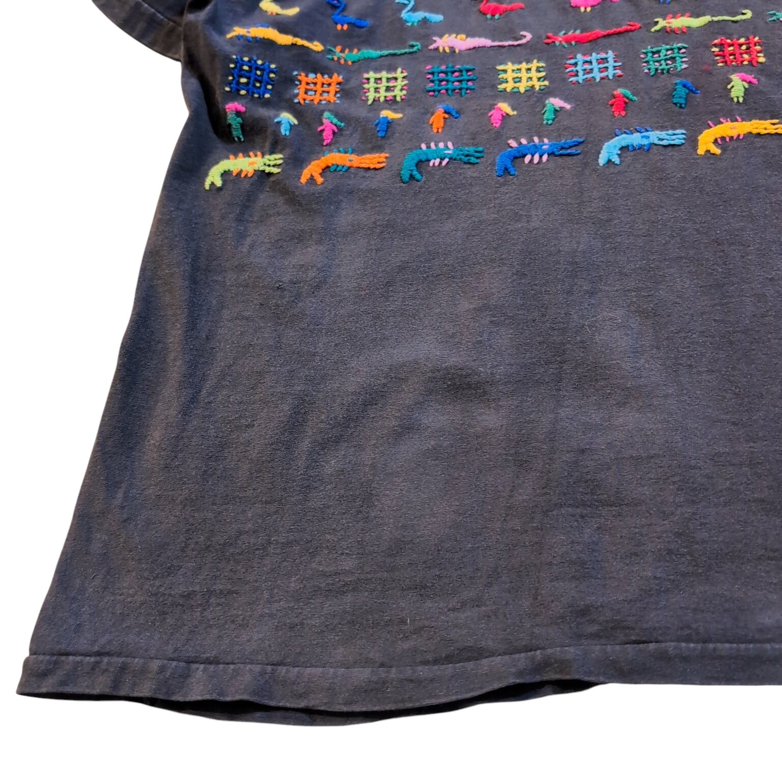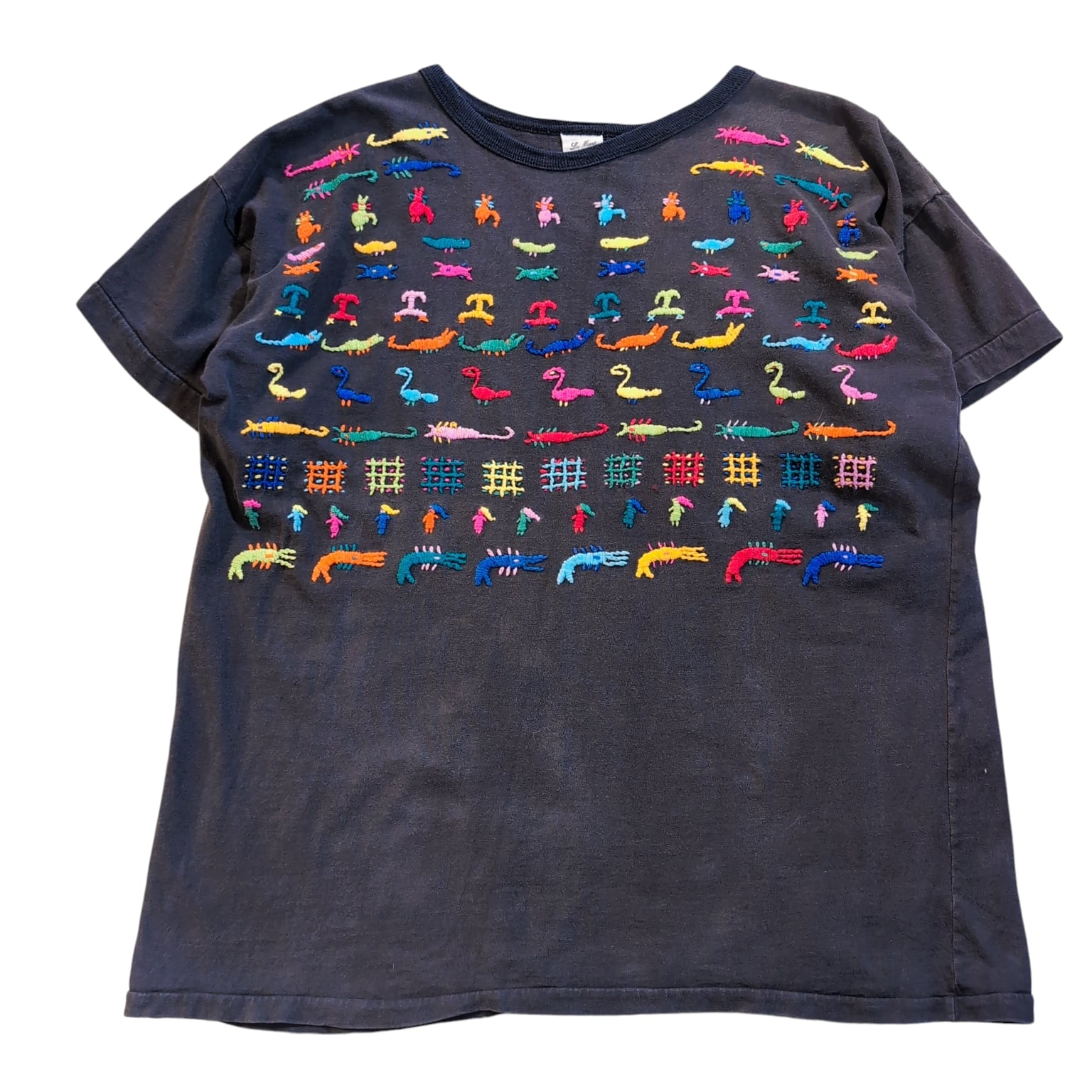 ガテマラ刺繍の不思議な生き物たちがたくさん施された一着。フェード感のある黒のボディに、カラフルな刺繍がとっても映えます。
