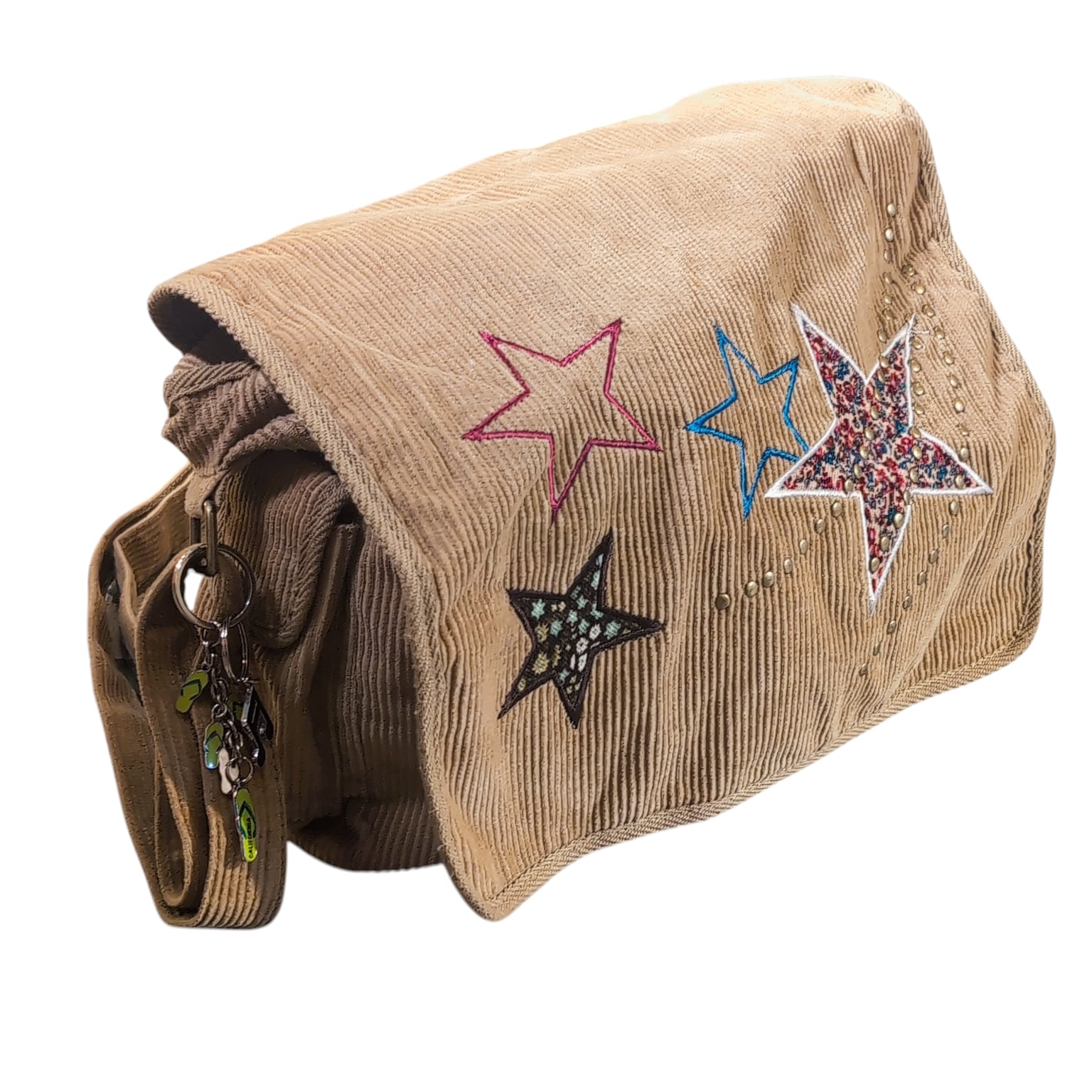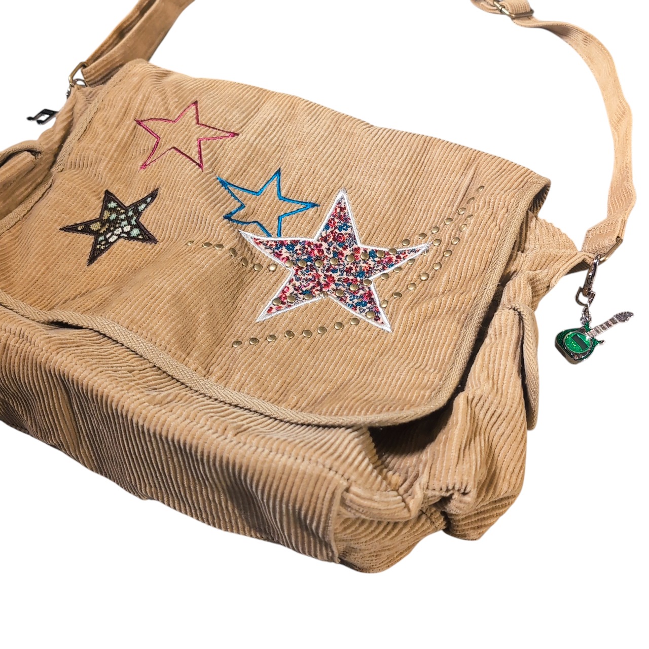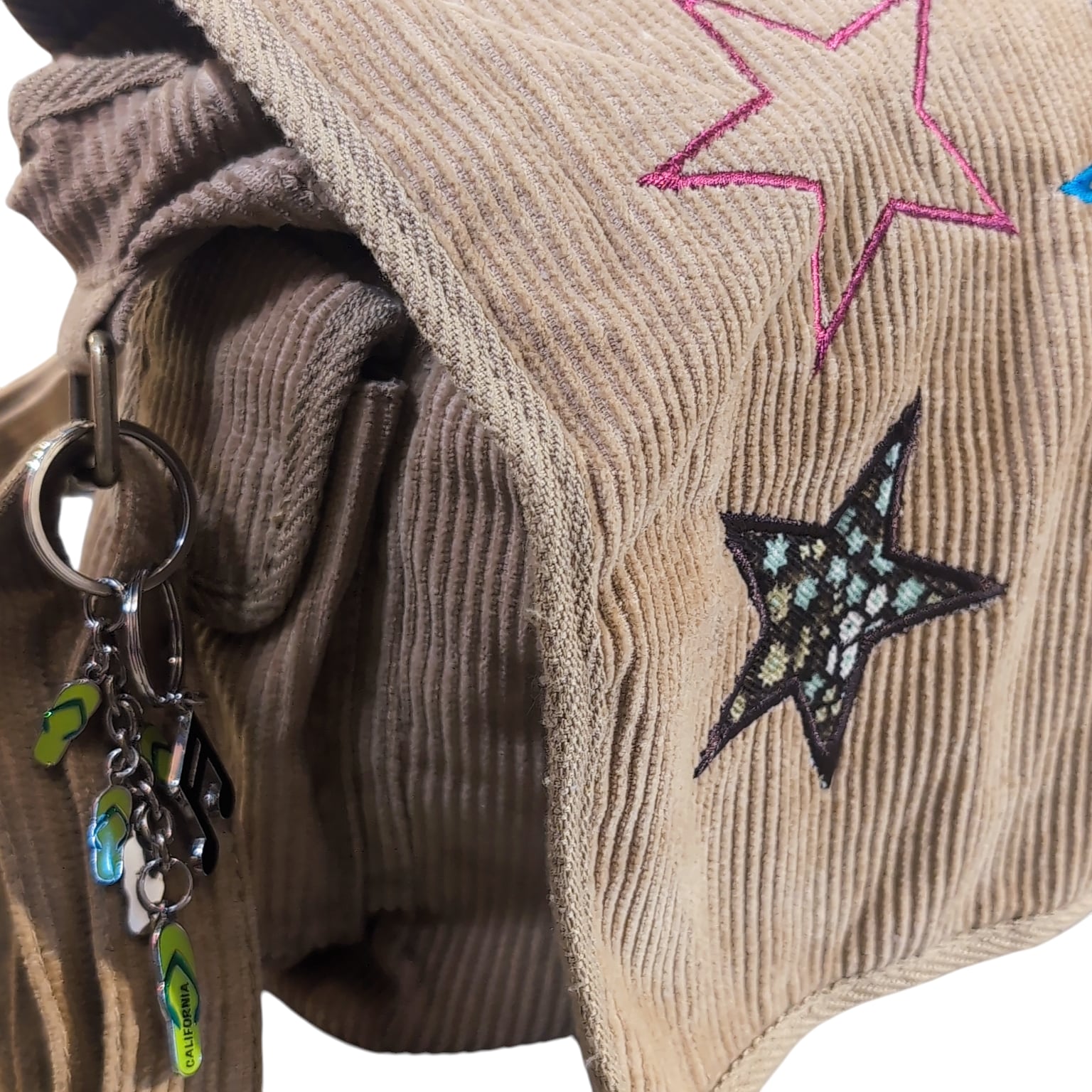 細畝のCORDUROYにお星様のパッチワーク、後付けなのだろうかキーホルダーがチャラッと付いてます。キーホルダーのセンスも絶妙でナイス。