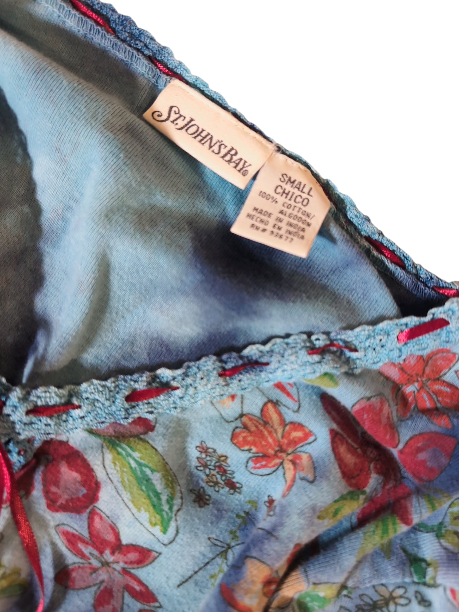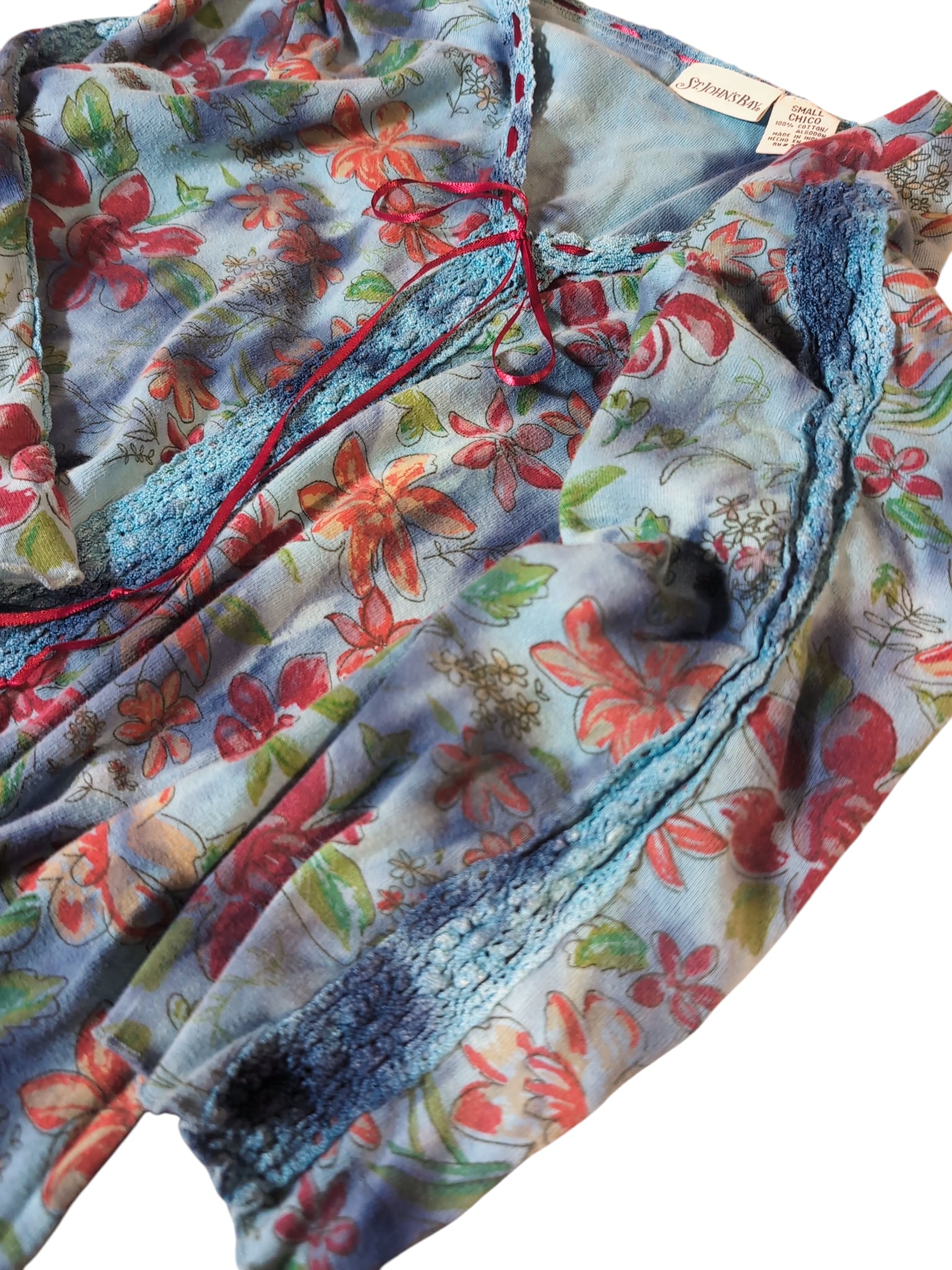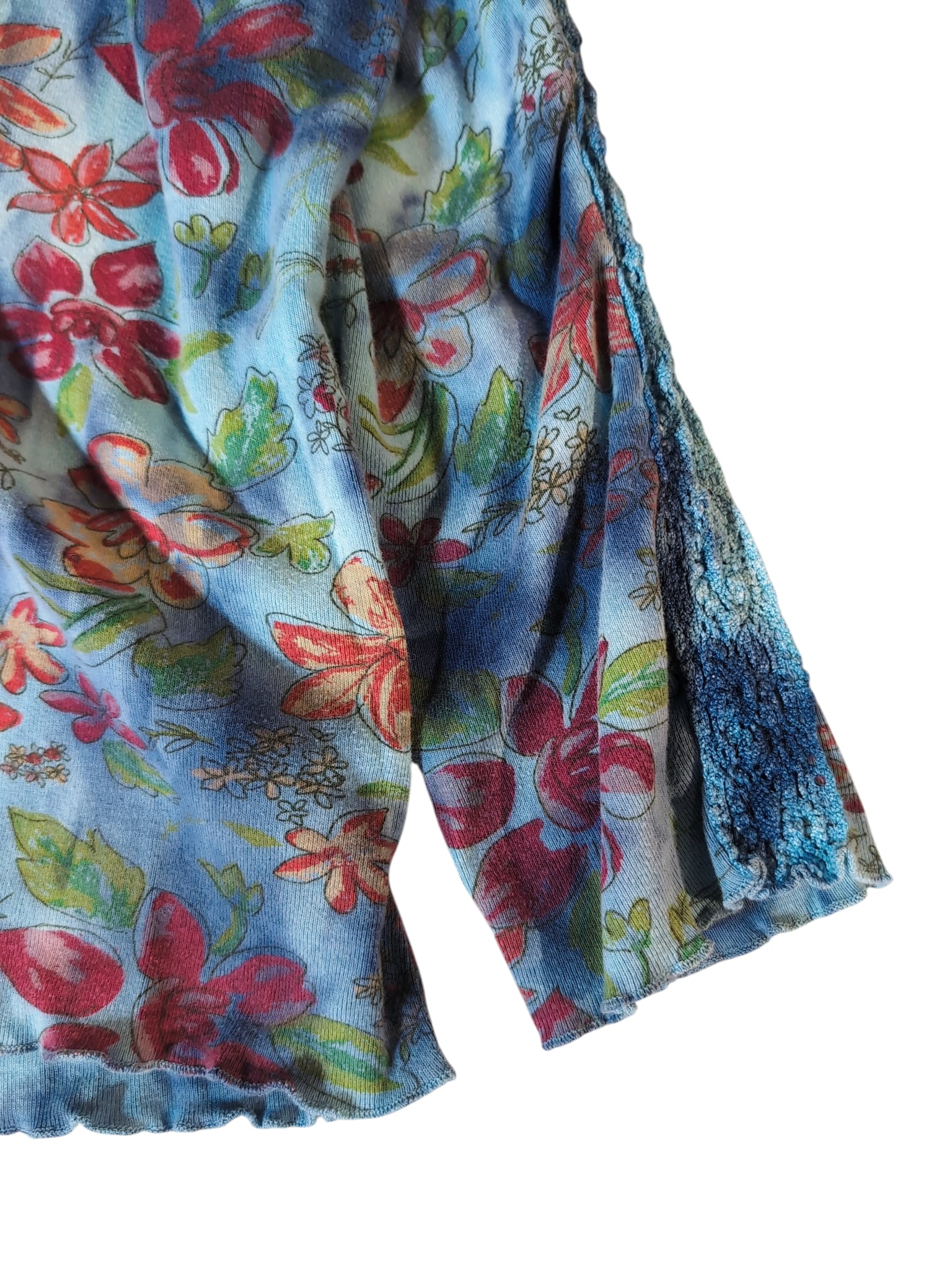 タイダイのようなボヤーっとしたボディーのカラーにお花がらが新鮮。袖部分にレース、襟部分には細いリボン。少し短めの袖丈。