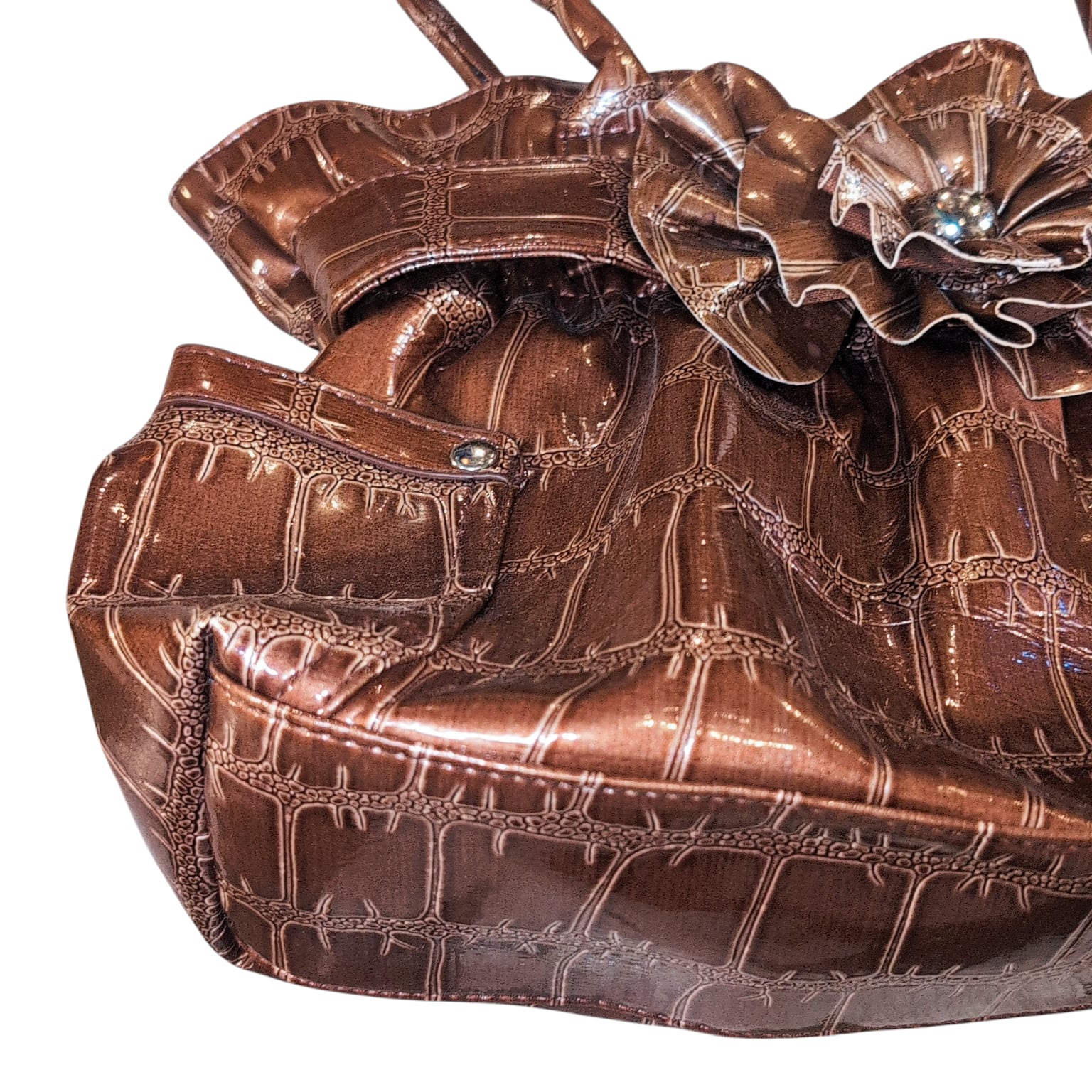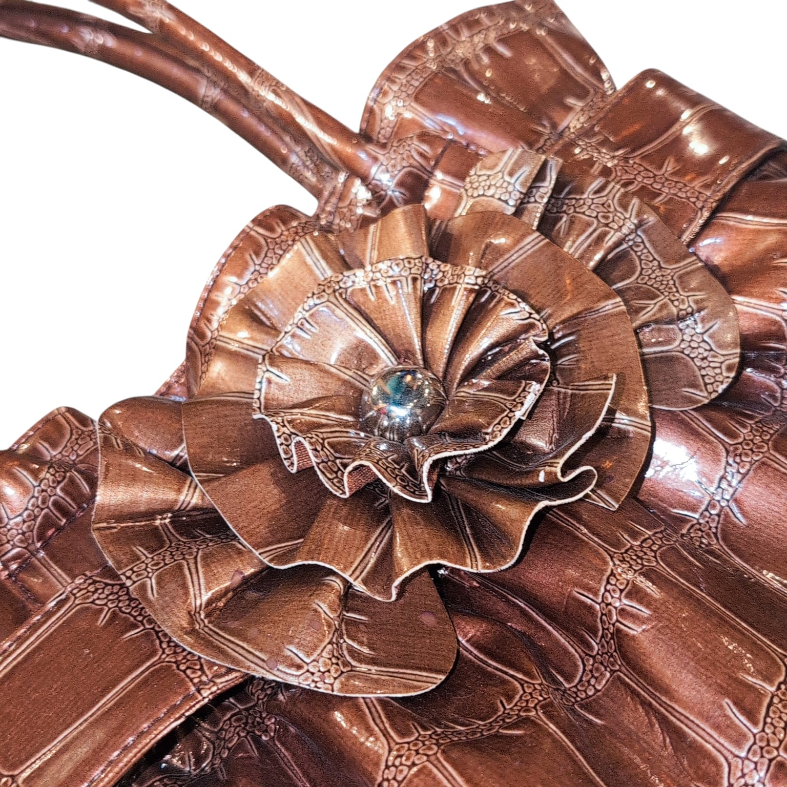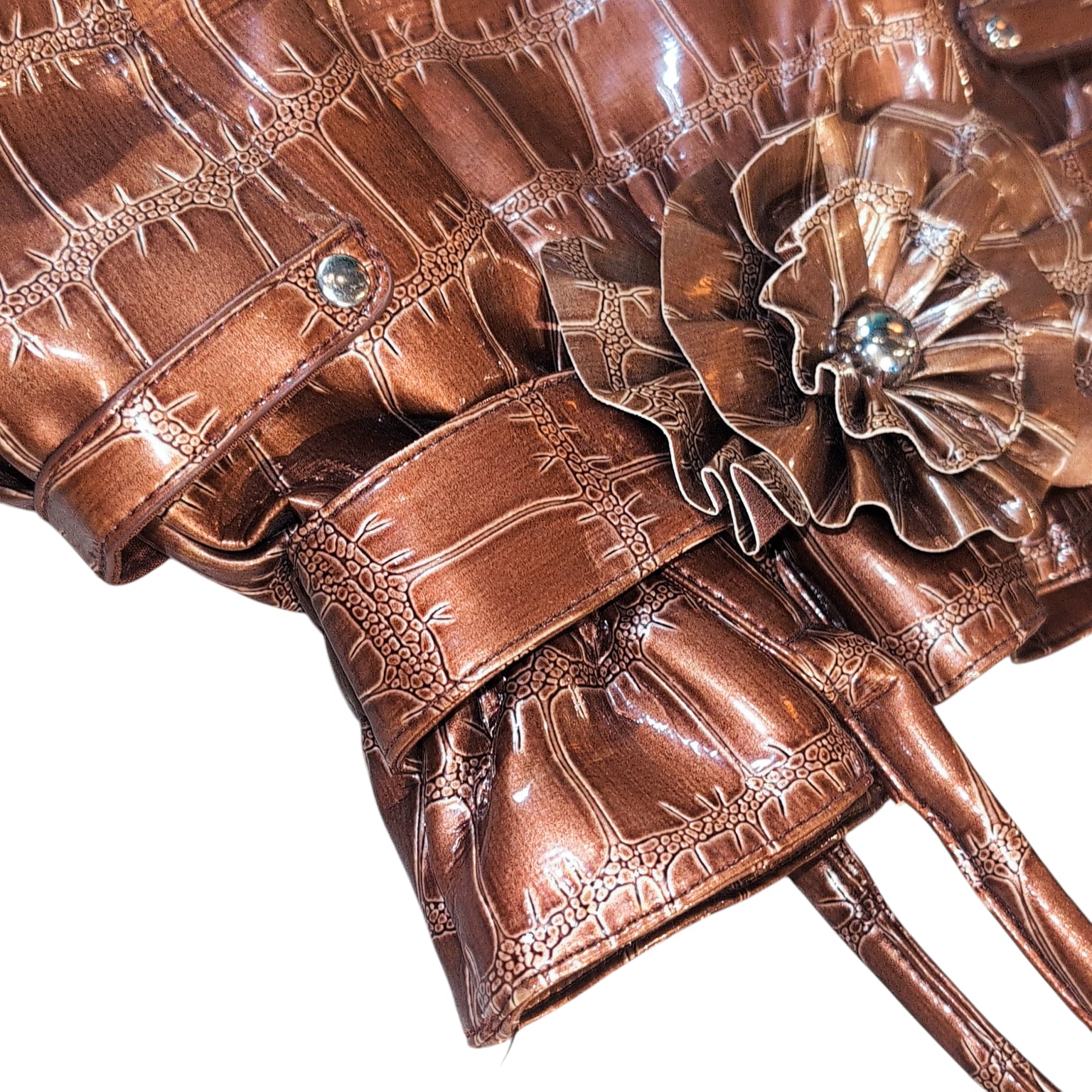 光沢のあるクロコ風、フリルのギャップ、プラスお花のモチーフというデザイン性の高さと細部の絶妙な組み合わせが魅力的。